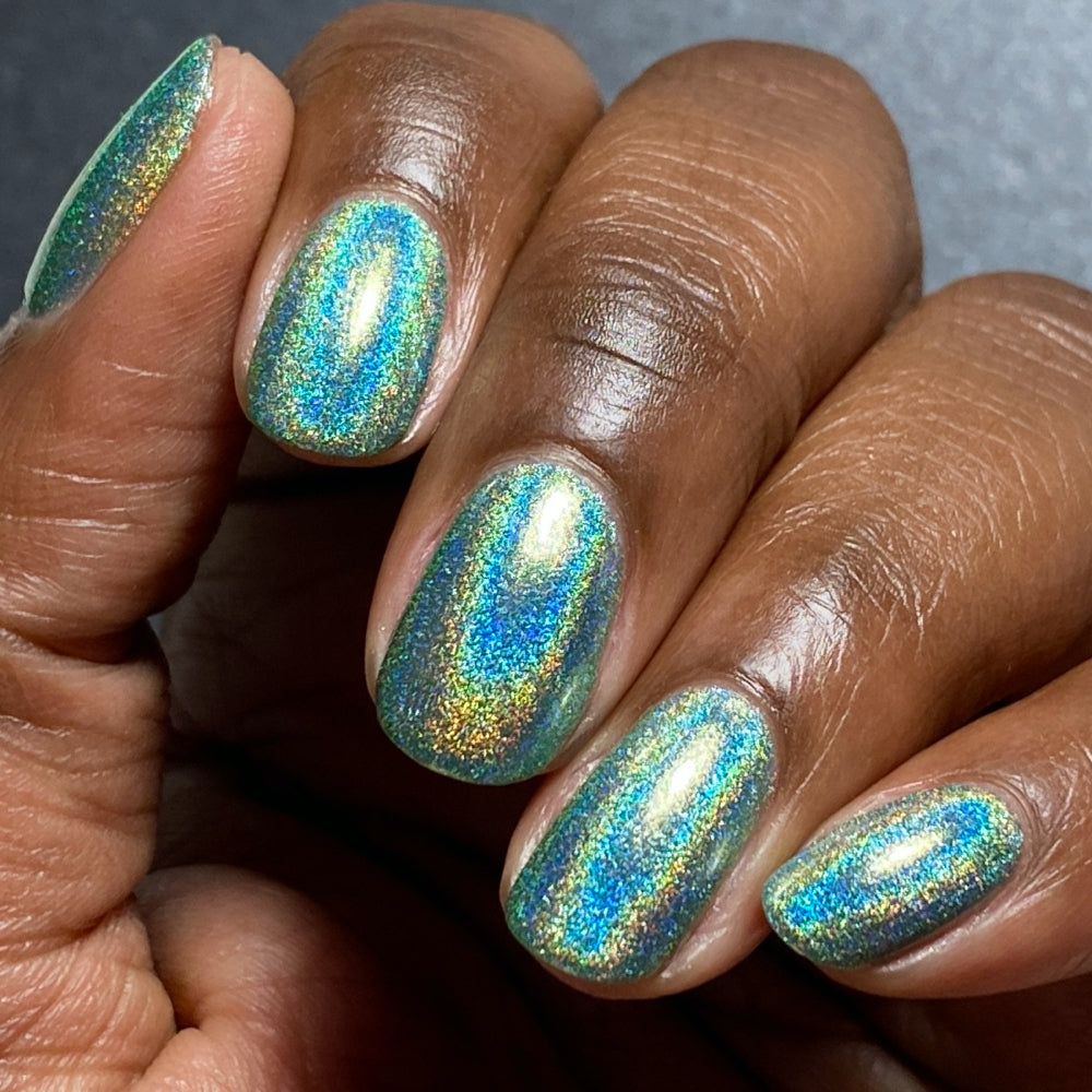 As the title says, the polish is SUPER holo. The pastel green is gorgeous and in indirect light it looks metallic. I'm in love.