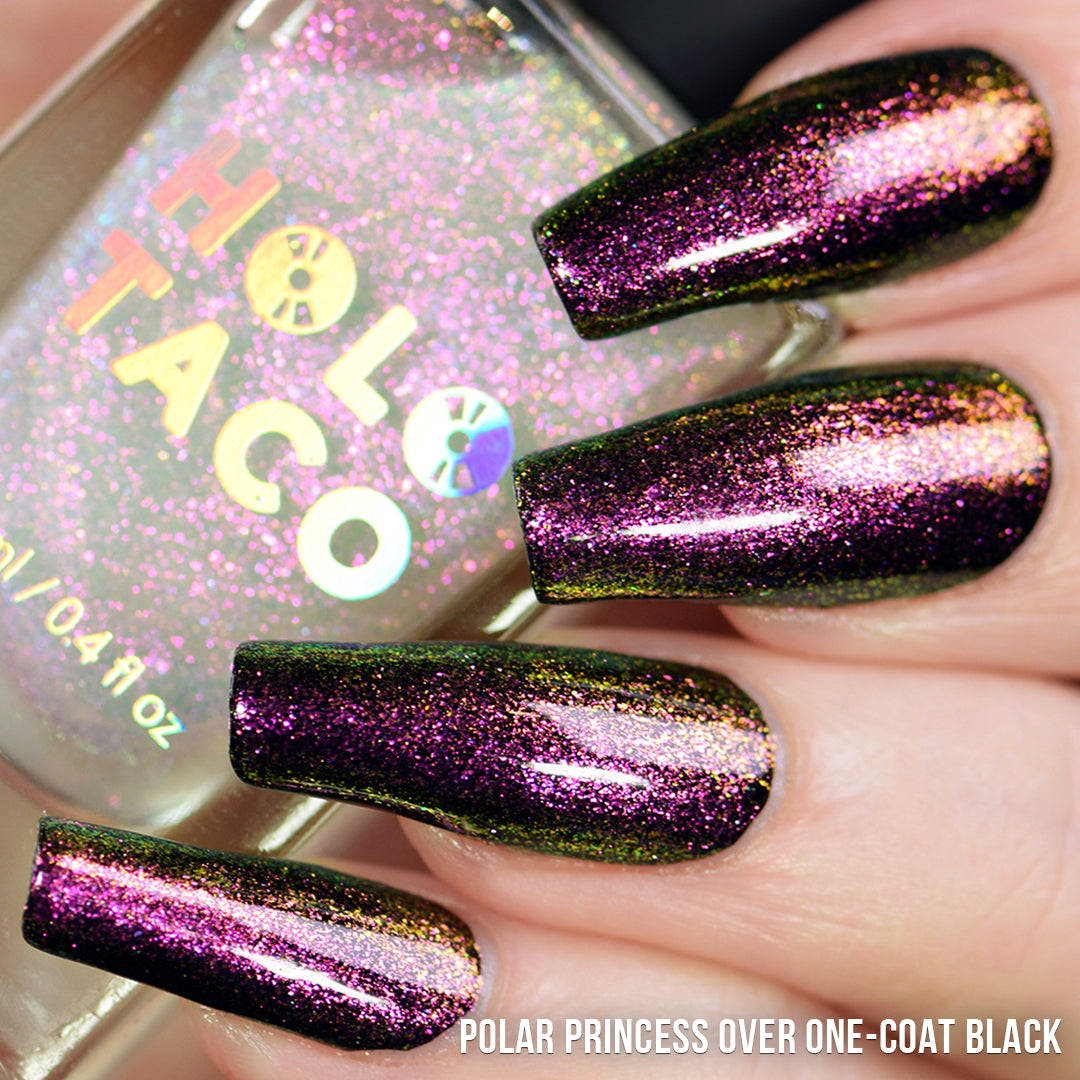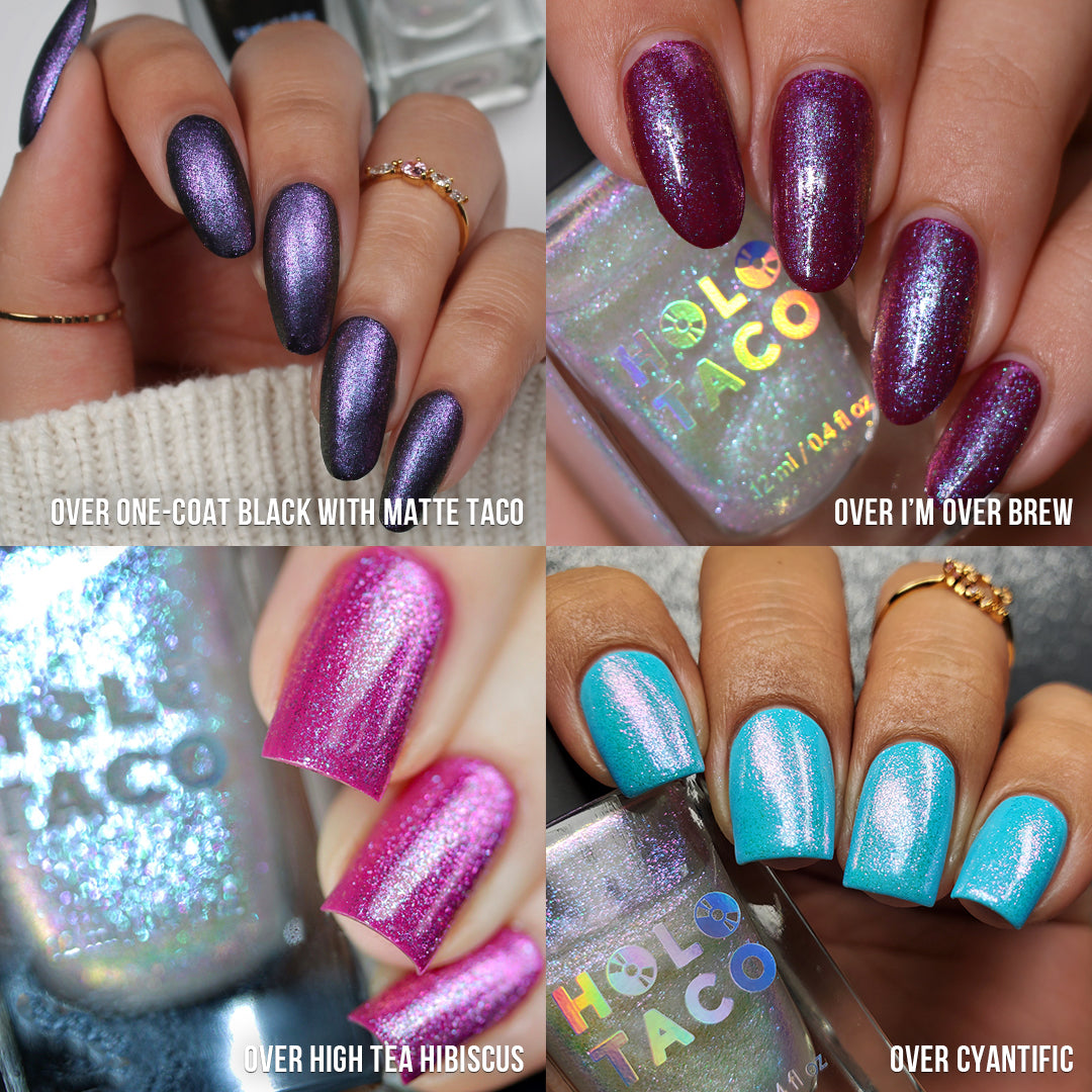 Note: Iridescent toppers show differently over different base colours and under different lighting conditions. A camera flash or direct lighting will showcase the dominant colour of the iridescent shimmer and indirect lighting (or shade) will reveal the secondary shifts in colour! Swatch photos as pictured have one coat of Glossy Taco for optimal smoothness and shine.
