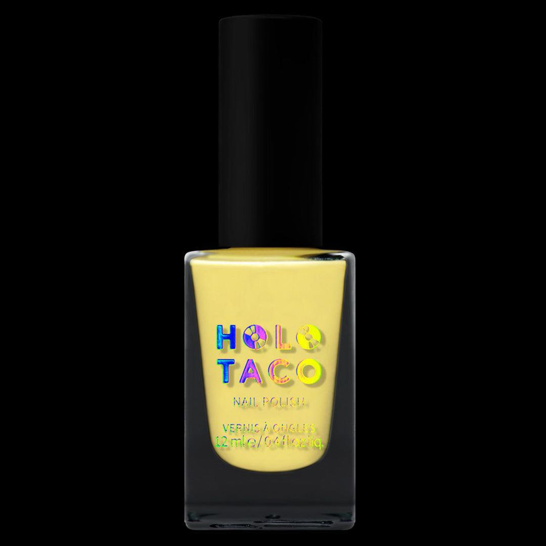 - Vibrant pastel light yellow polish with a crème formula