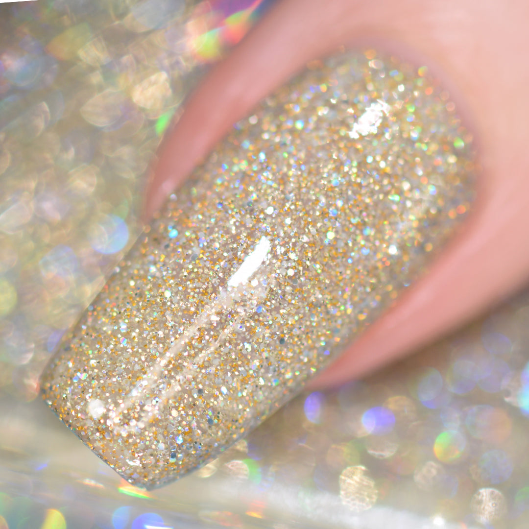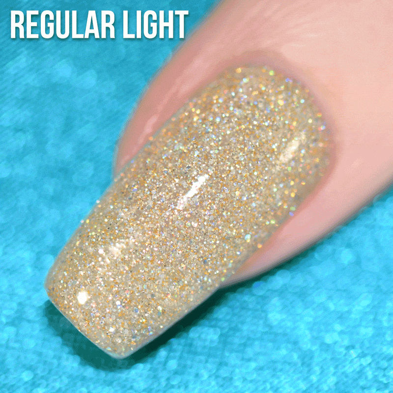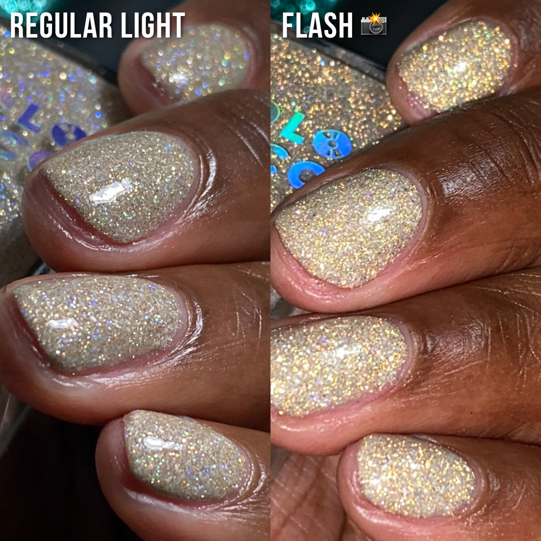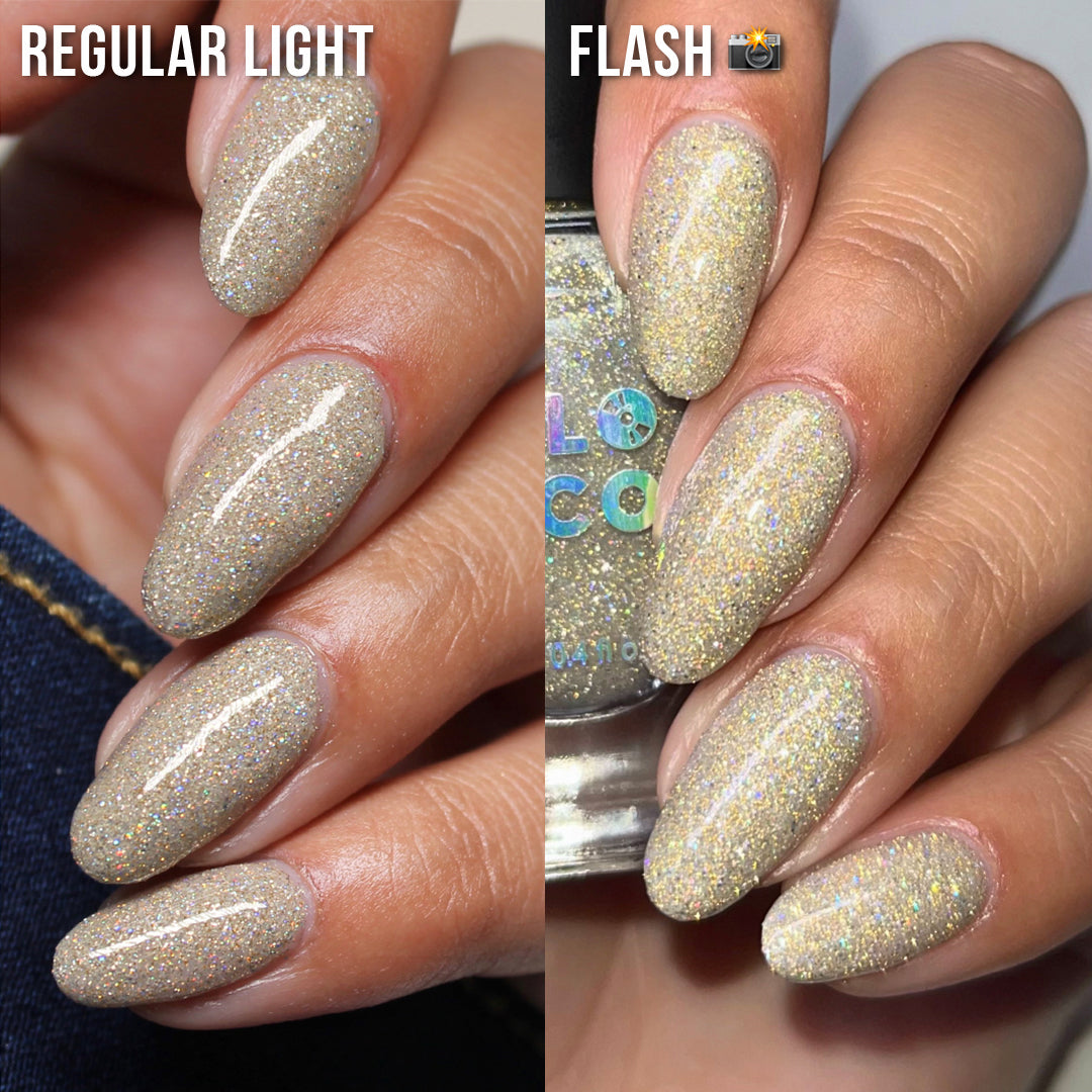 Note: Reflective nail polish is activated at specific angles under a direct light. Holographic nail polish shows best under direct sunlight, halogen bulbs, or just your phone camera flash!