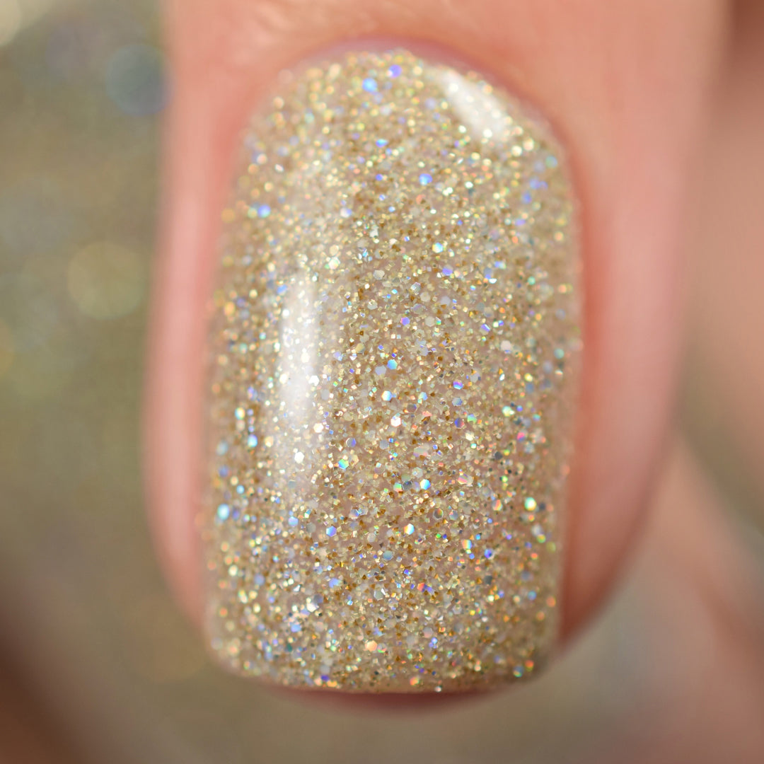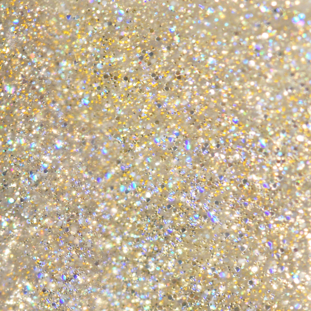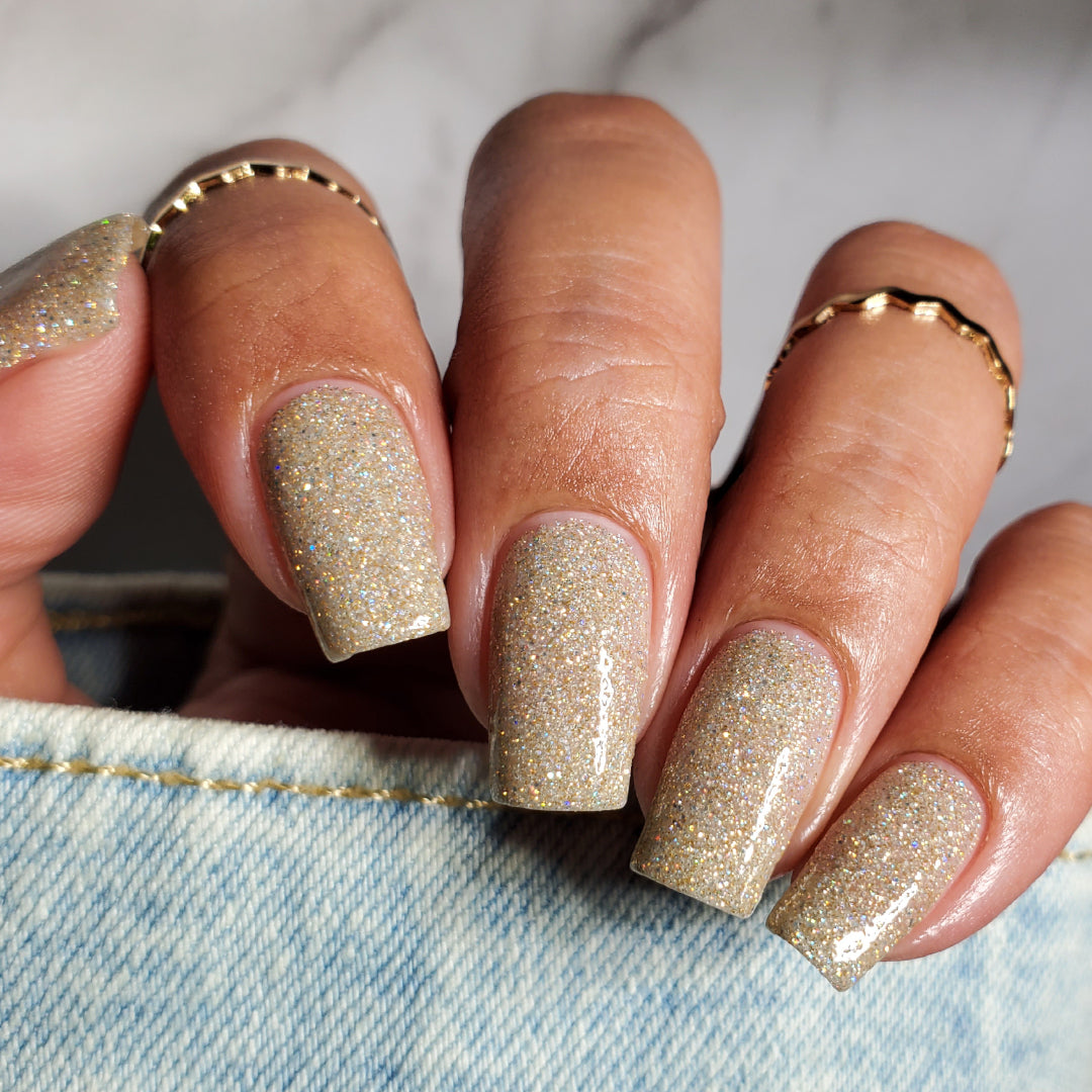 Sand-coloured jelly holographic glitter polish with gold reflective glitters