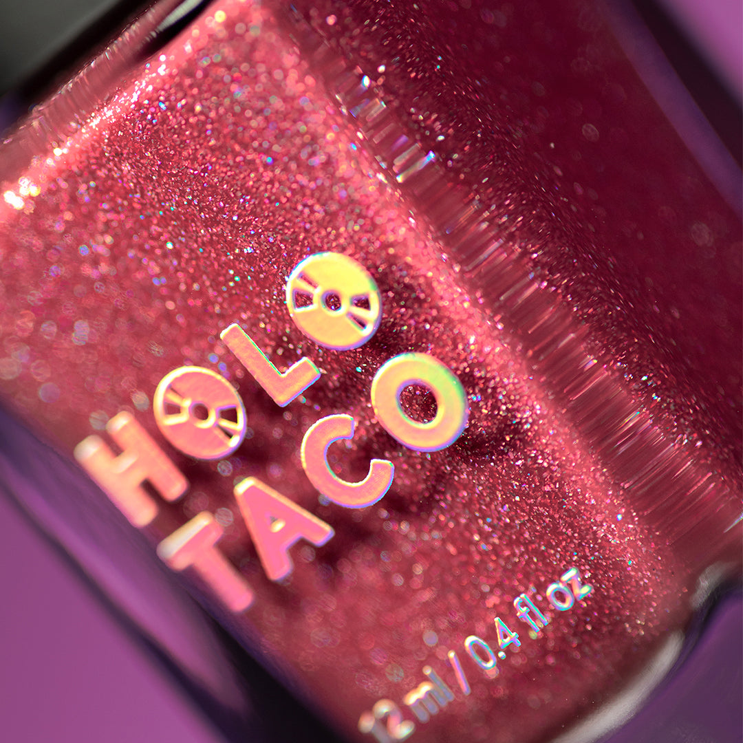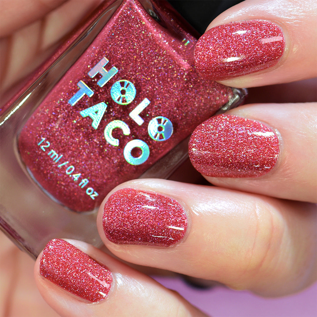 Beautiful berry colour, classy and fun, 10/10. The formula applies easily and beautifully. I hope this polish returns because it's one of Holo Taco's best!!