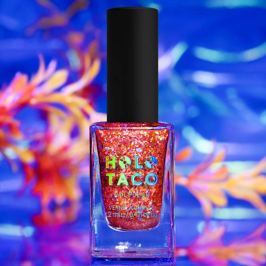 This bold coral red jelly rules the reef. Packed with iridescent flakes and scattered gold reflective glitter, it gives major Big Reef Energy that the whole ocean can feel. Swipe it on, blast it with your camera flash, and watch it show off even more.