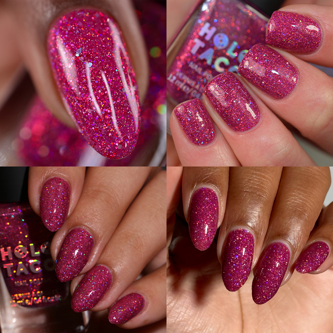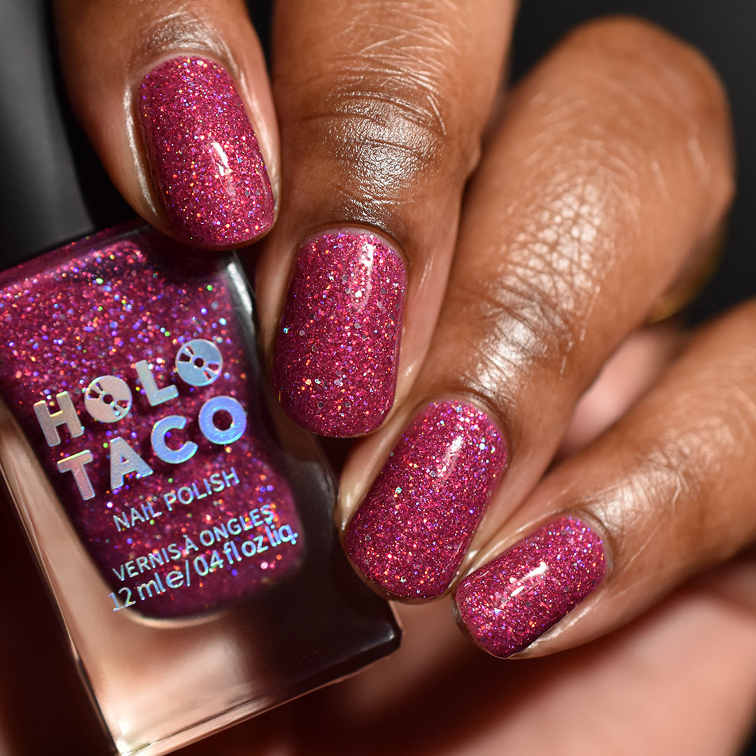 This berry pink may look sweet, but it hits hard. Fully loaded with holo glitter, it steals your heart––then throws a punch.