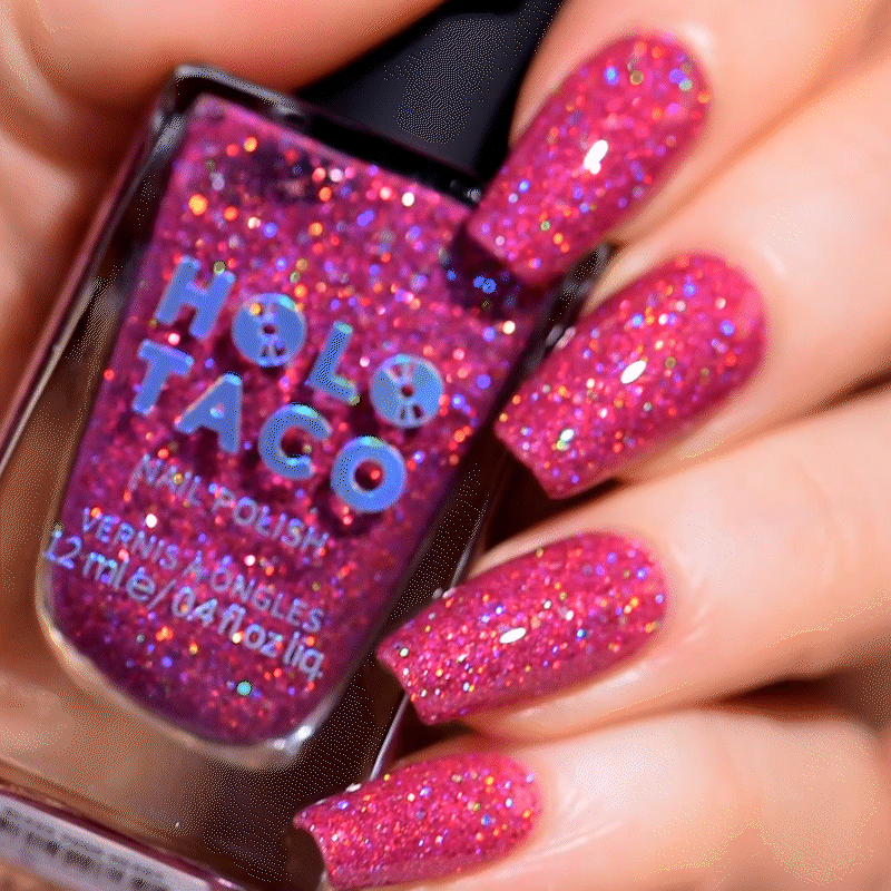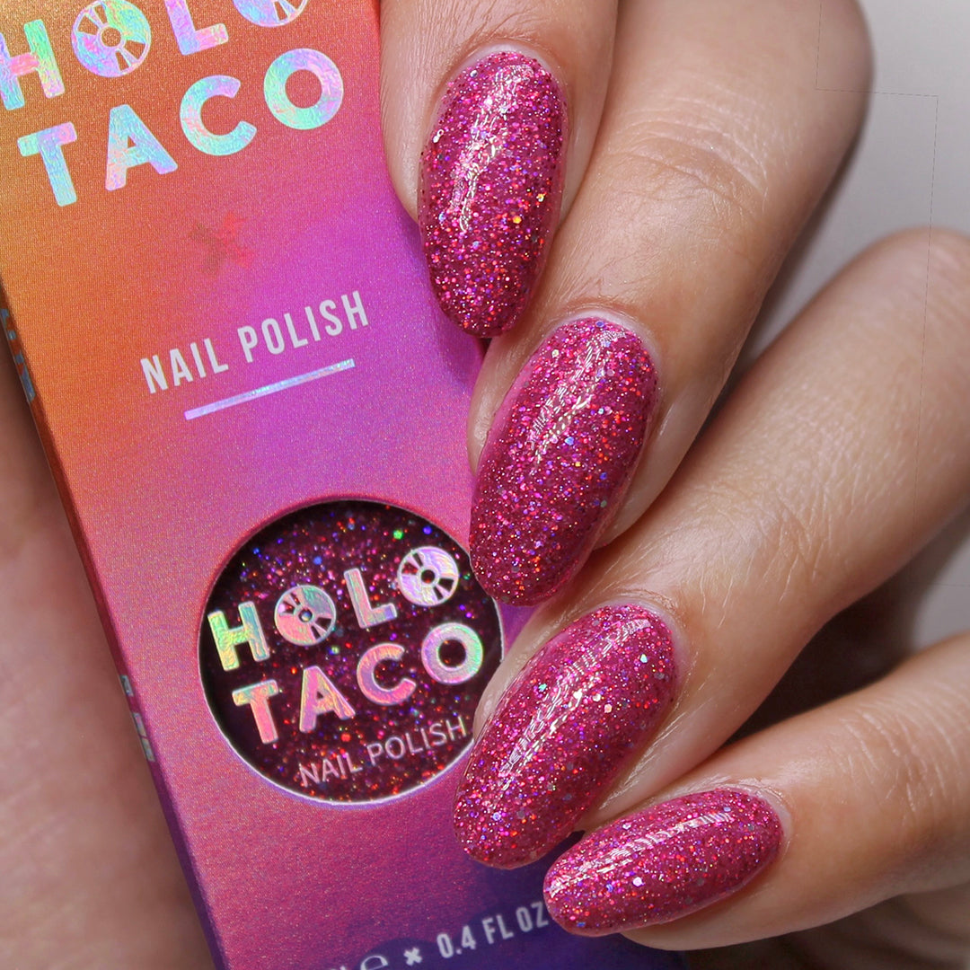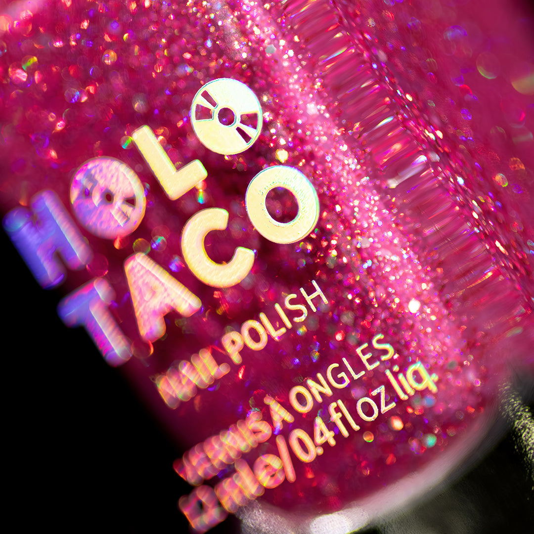 Note: Holographic nail polish shows best under direct sunlight, halogen bulbs, or just your phone camera flash! Swatch photos as pictured have one coat of Glossy Taco for optimal smoothness and shine.