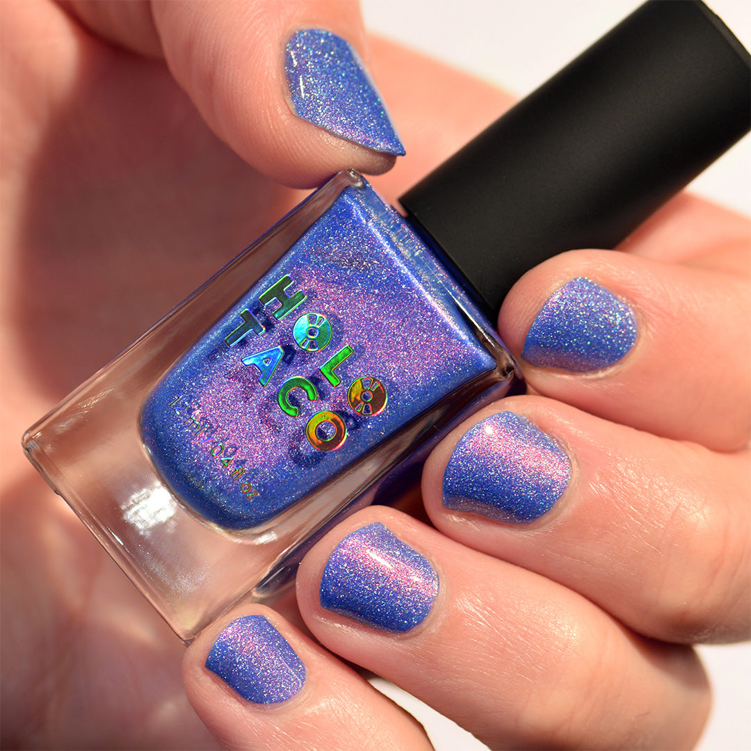 - Crushed holographic formula in a blue-violet shade with pink iridescent micro-shimmer underglow
