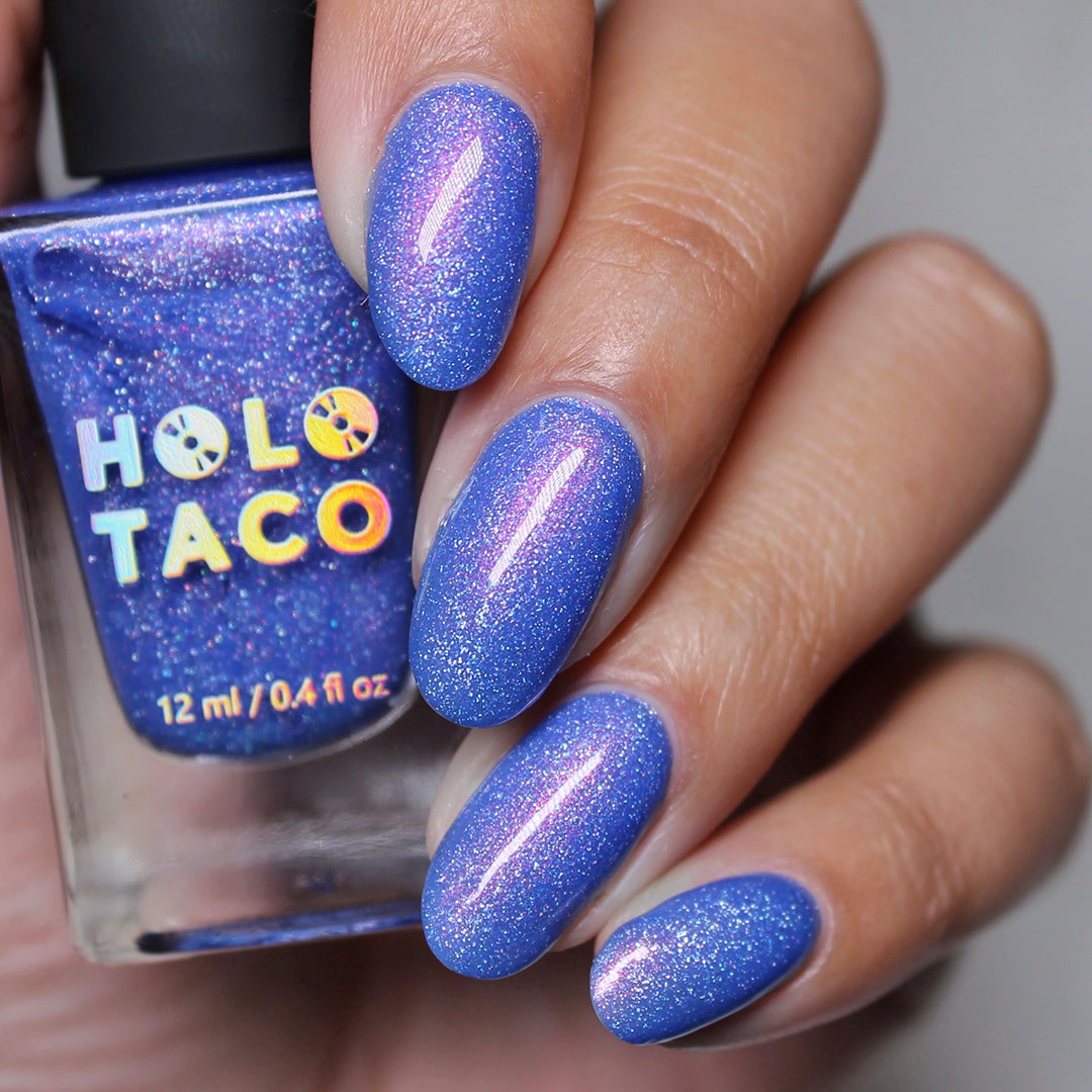 - Note: Holographic nail polish shows best under direct sunlight, halogen bulbs, or just your phone camera flash! Swatch photos as pictured have one coat of Glossy Taco.