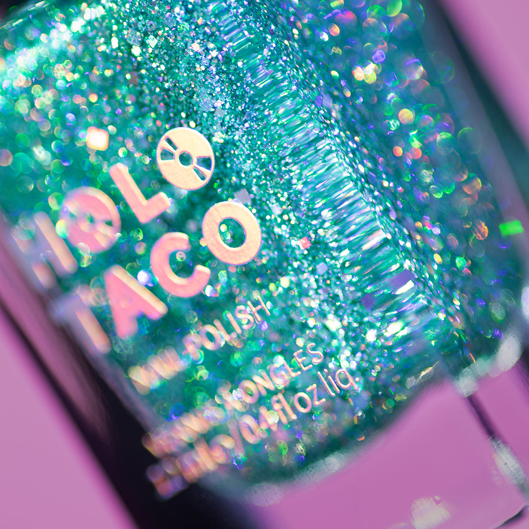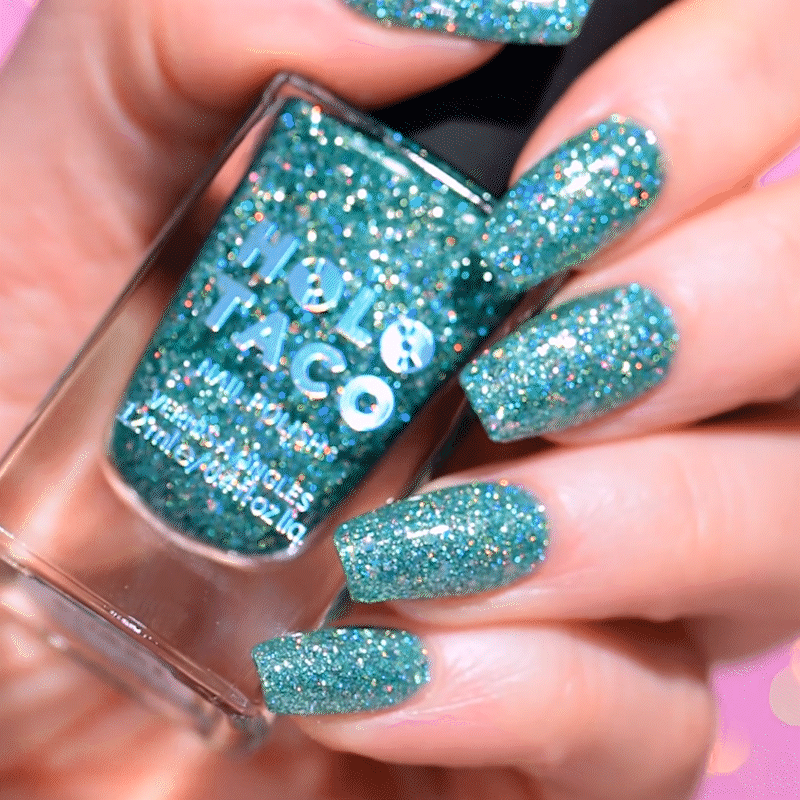 - Pro glossy tip: Because this polish is packed with lots of glitter, we recommend applying two coats of Glossy Taco to achieve that super smooth glossy finish. Make sure to let your first coat of top coat dry and “sink into” the glitter layer before adding the second final coat of top coat.