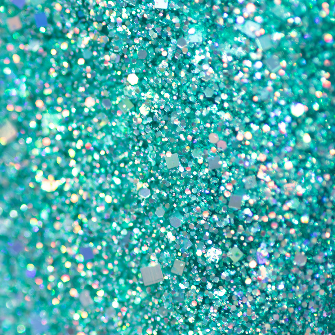 - Mint green jelly polish in a holographic glitter formula with square pixel-shaped holo glitters