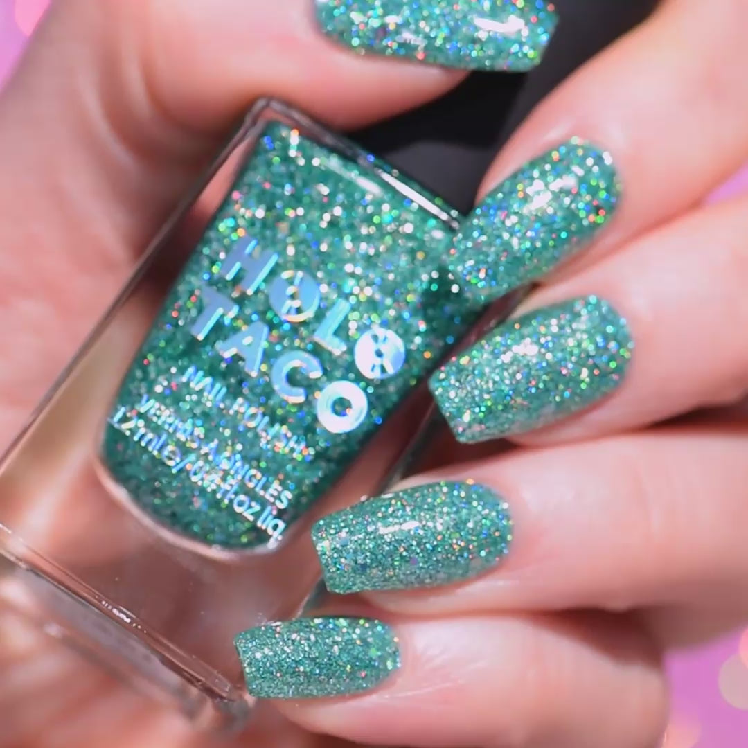 - Note: Holographic nail polish shows best under direct sunlight, halogen bulbs, or just your phone camera flash! Swatch photos as pictured have one coat of Glossy Taco for optimal smoothness and shine. Super-pigmented shades may cause staining depending on the porousness of the nail and the use of a protective base coat.