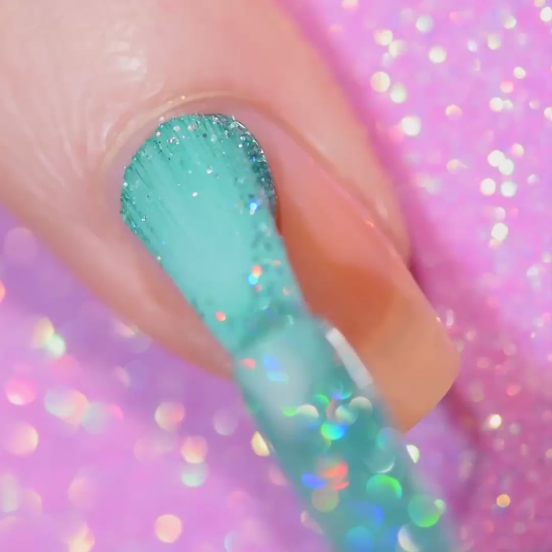 - Mint green jelly polish in a holographic glitter formula with square pixel-shaped holo glitters