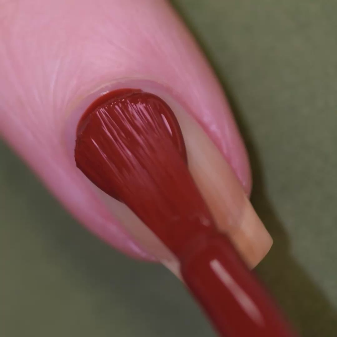 Love this red. This photo was taken in indoor lighting. One finger has matte and the other doesn’t. Ignore the thumb that is crimson void. It’s a soft fall red for all the fall girlies out there. Has a little staining but I don’t use a base coat, so I know I do that to myself. Happily added this to my HT red collection. ♥️