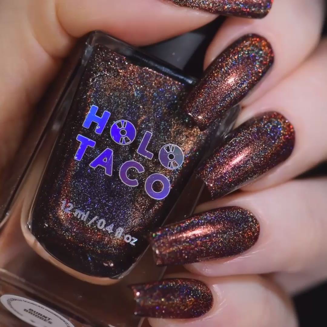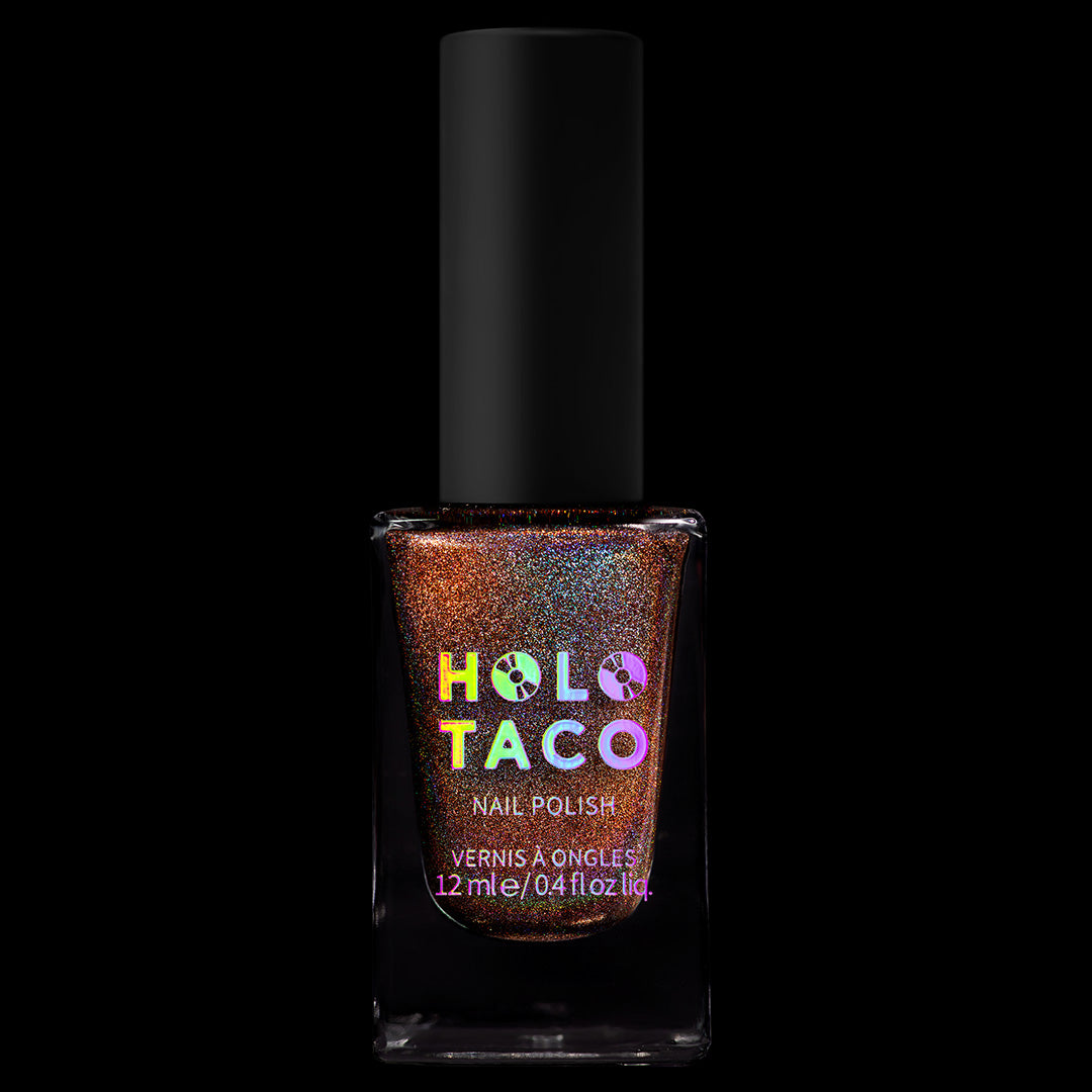 - Note: Holographic nail polish shows best under direct sunlight, halogen bulbs, or just your phone camera flash! Swatch photos as pictured have one coat of Glossy Taco for optimal smoothness and shine. Super-pigmented shades may cause staining depending on the porousness of the nail and the use of a protective base coat.