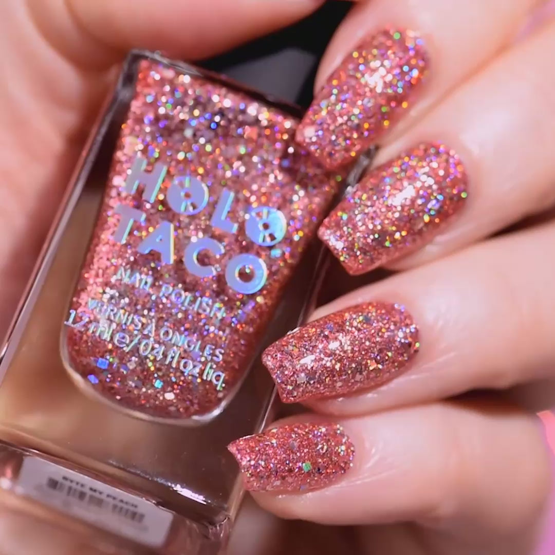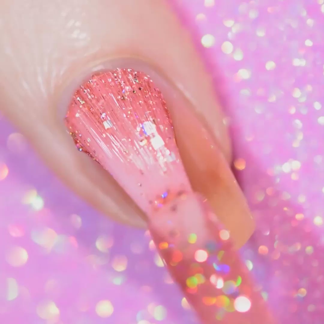 Careful! This peachy-pink sparkler packs a punch. Loaded with pixel-shaped holo glitters so you get some sparkle in every byte.