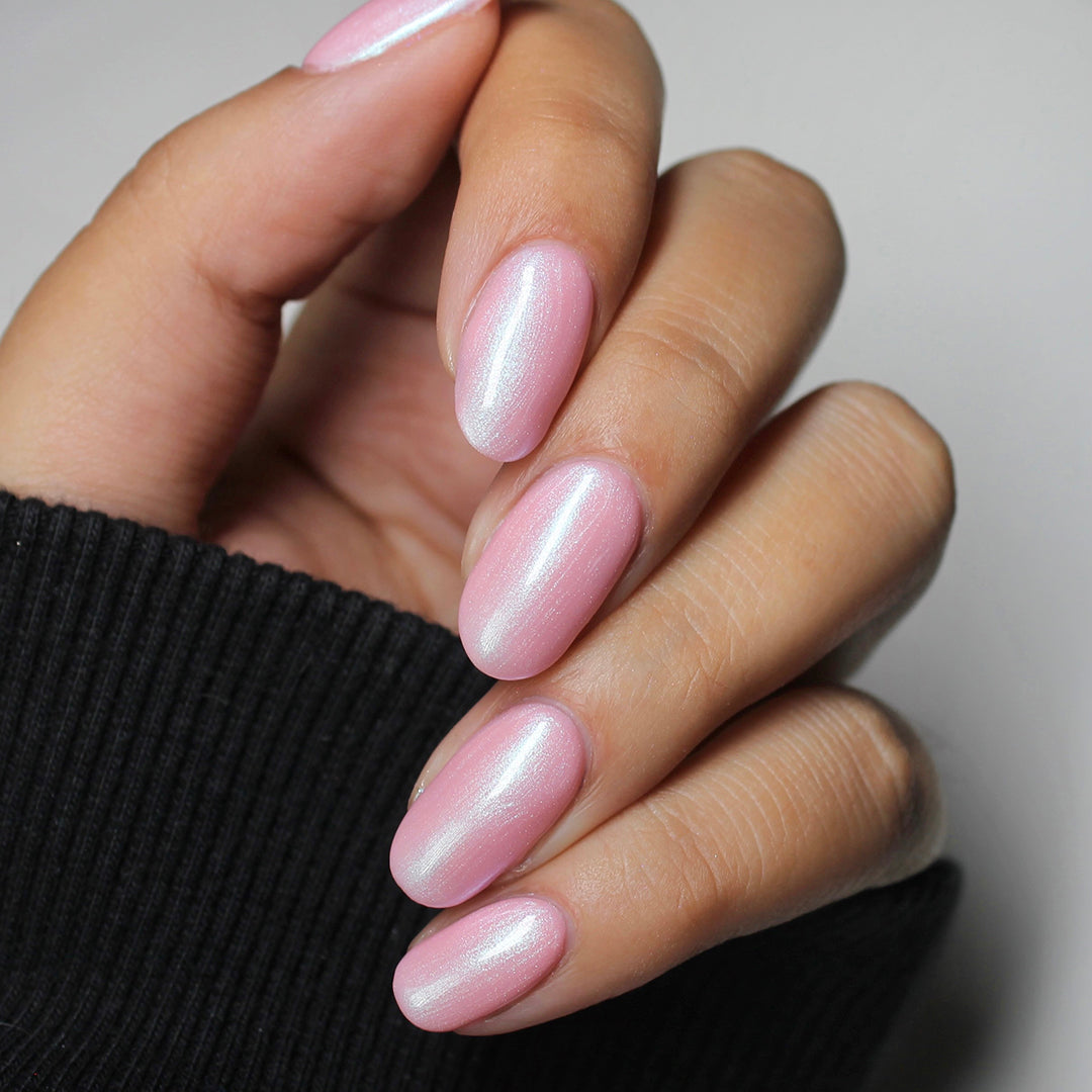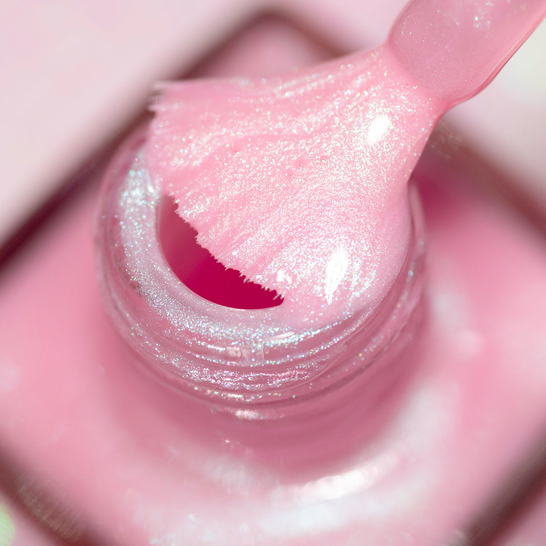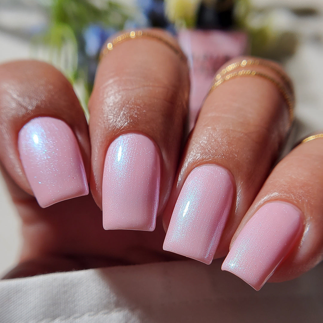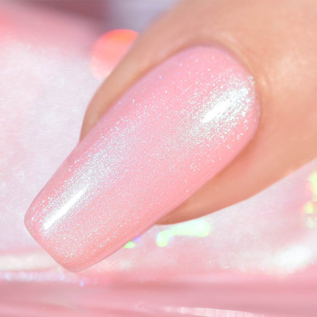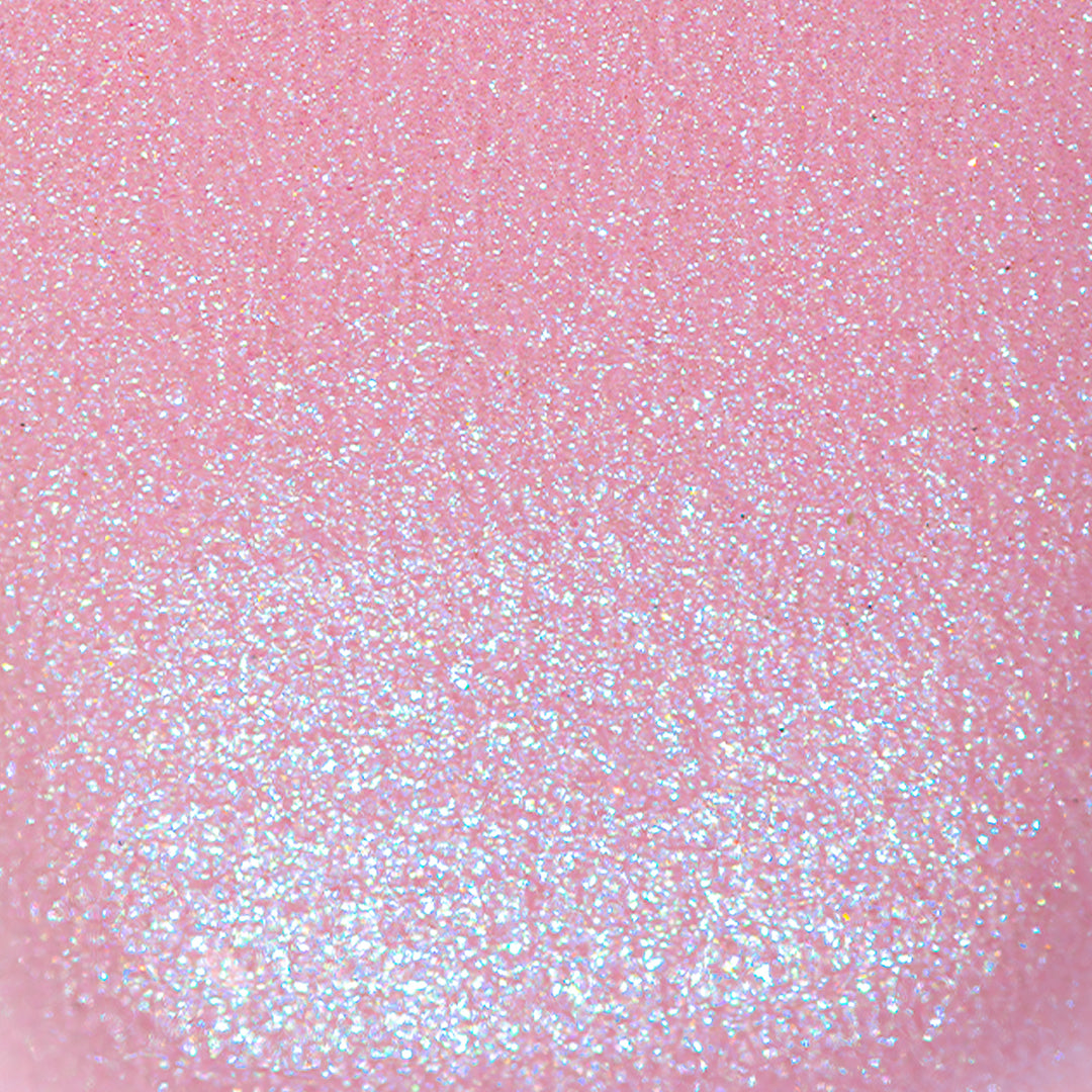 - Light baby pink jelly base with iridescent cyan micro-shimmer