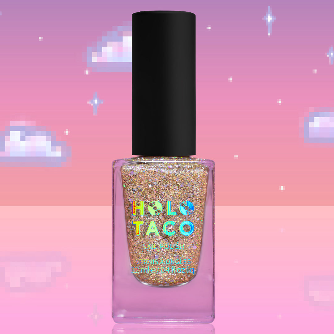- Neutral gold jelly polish in a holographic glitter formula with square pixel-shaped holo glitters