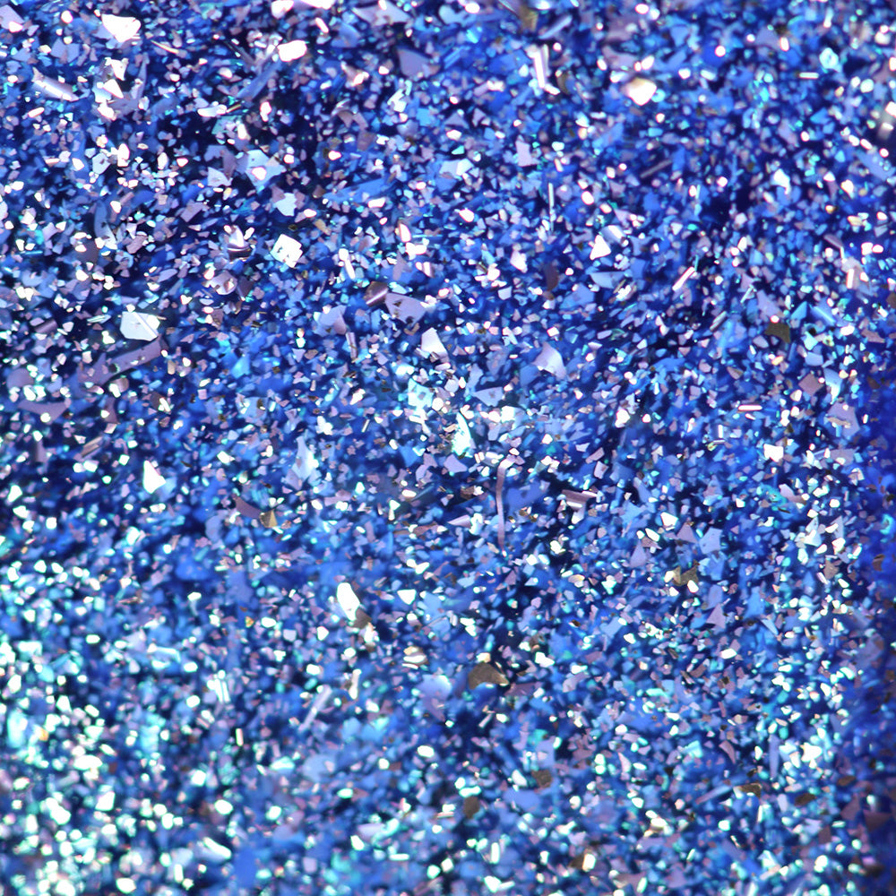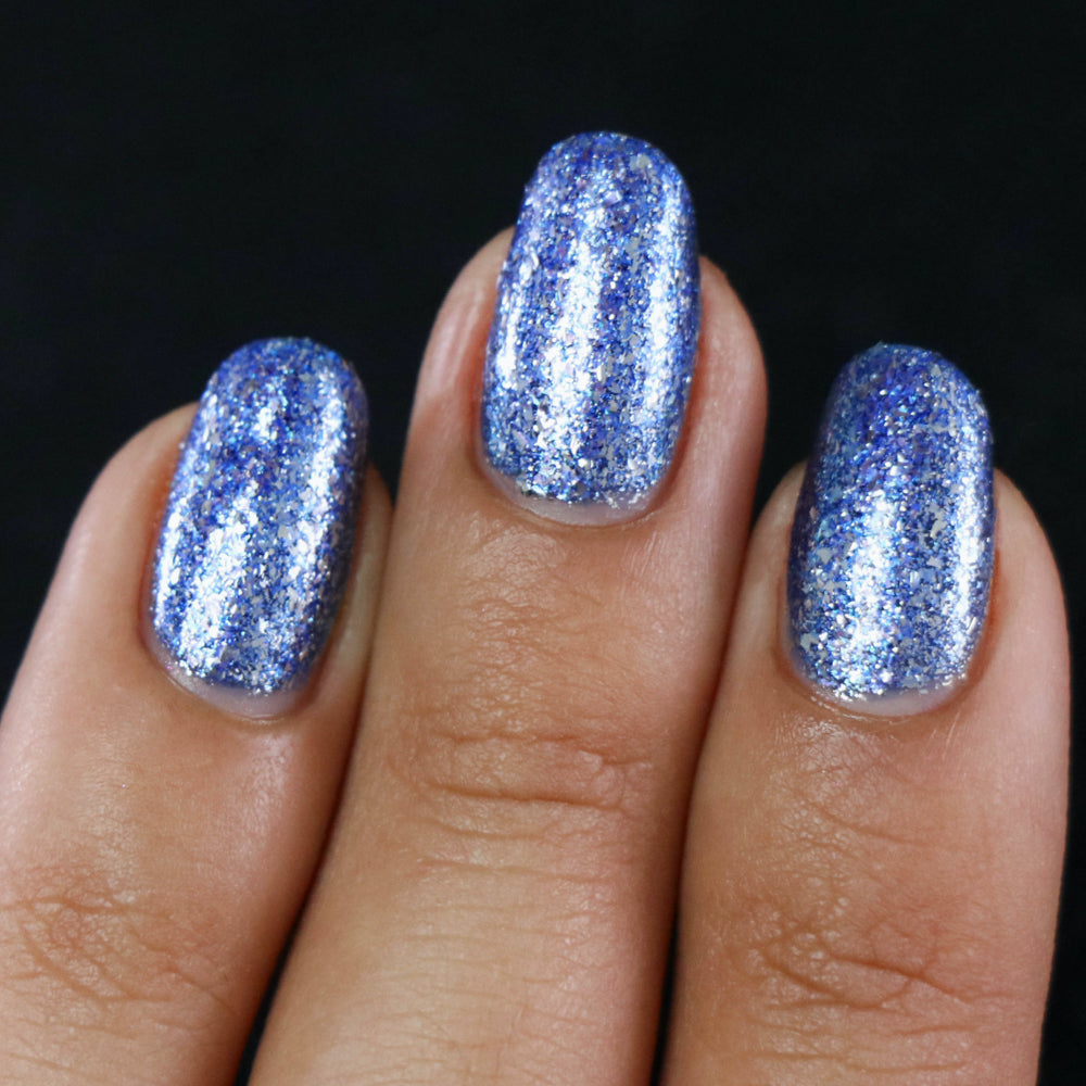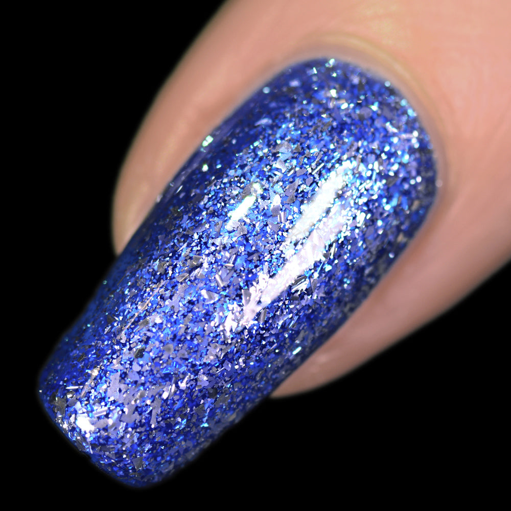 - Metallic foil polishes with silver foil flakes in a pale cobalt blue shade.