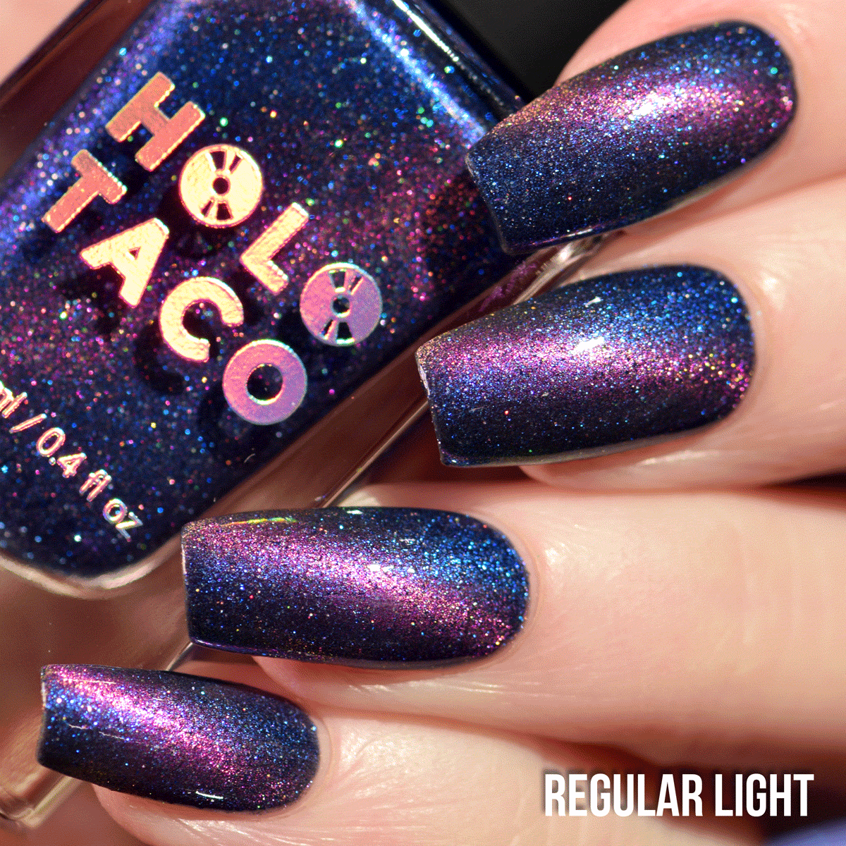 - Note: Reflective nail polish is activated at specific angles under a direct light, such as your phone’s camera flash. Swatch photos as pictured have one coat of Glossy Taco for optimal smoothness and shine.