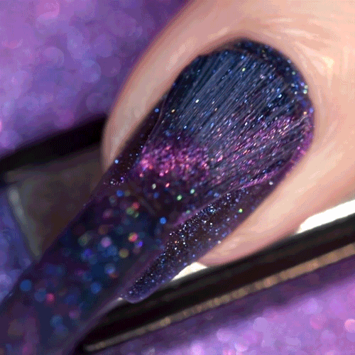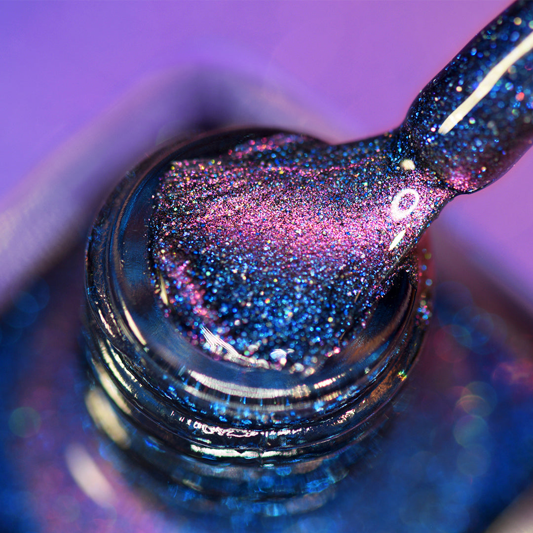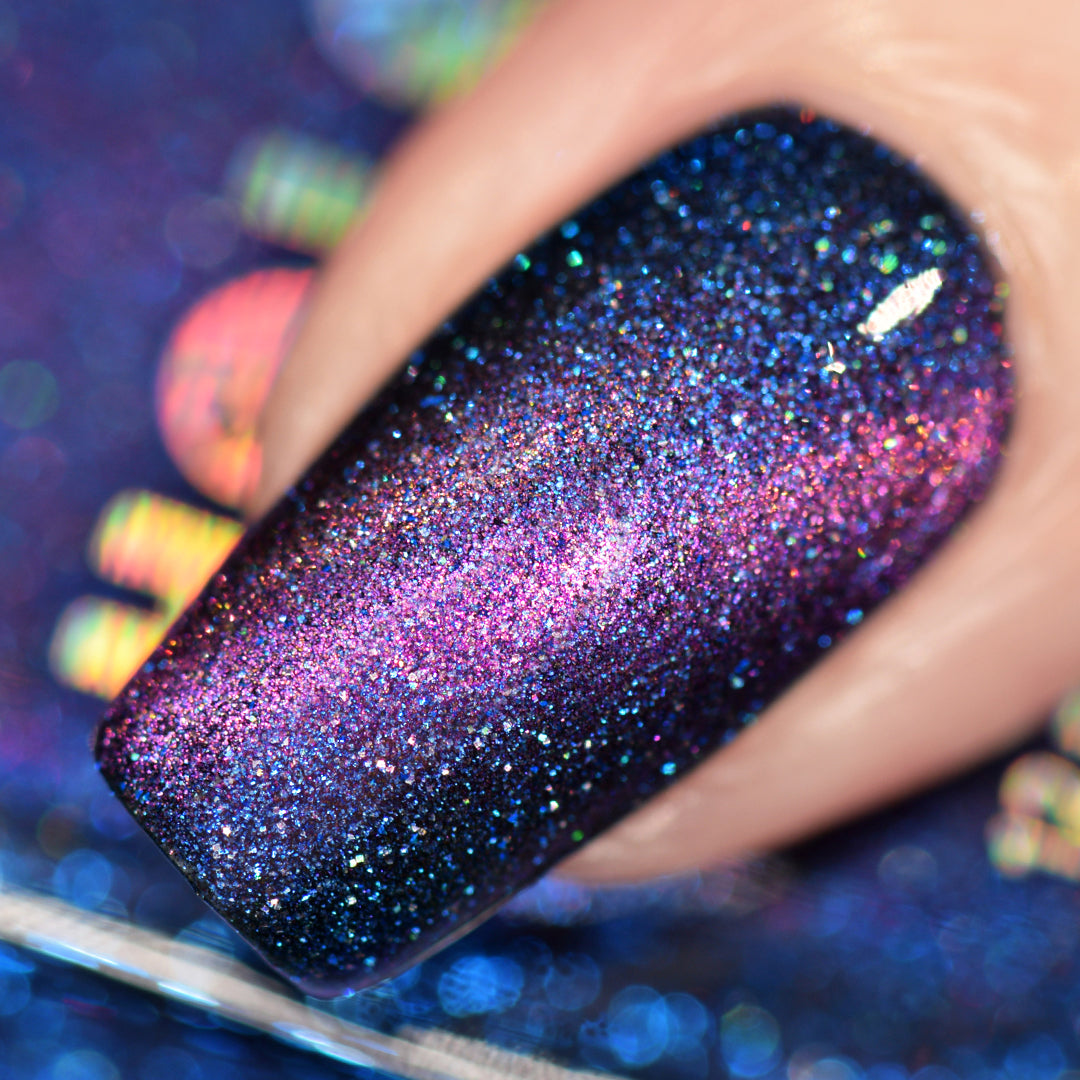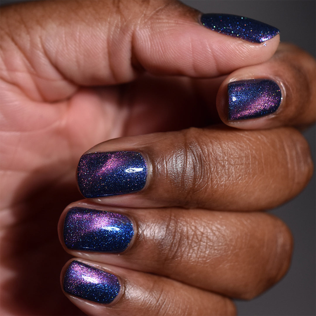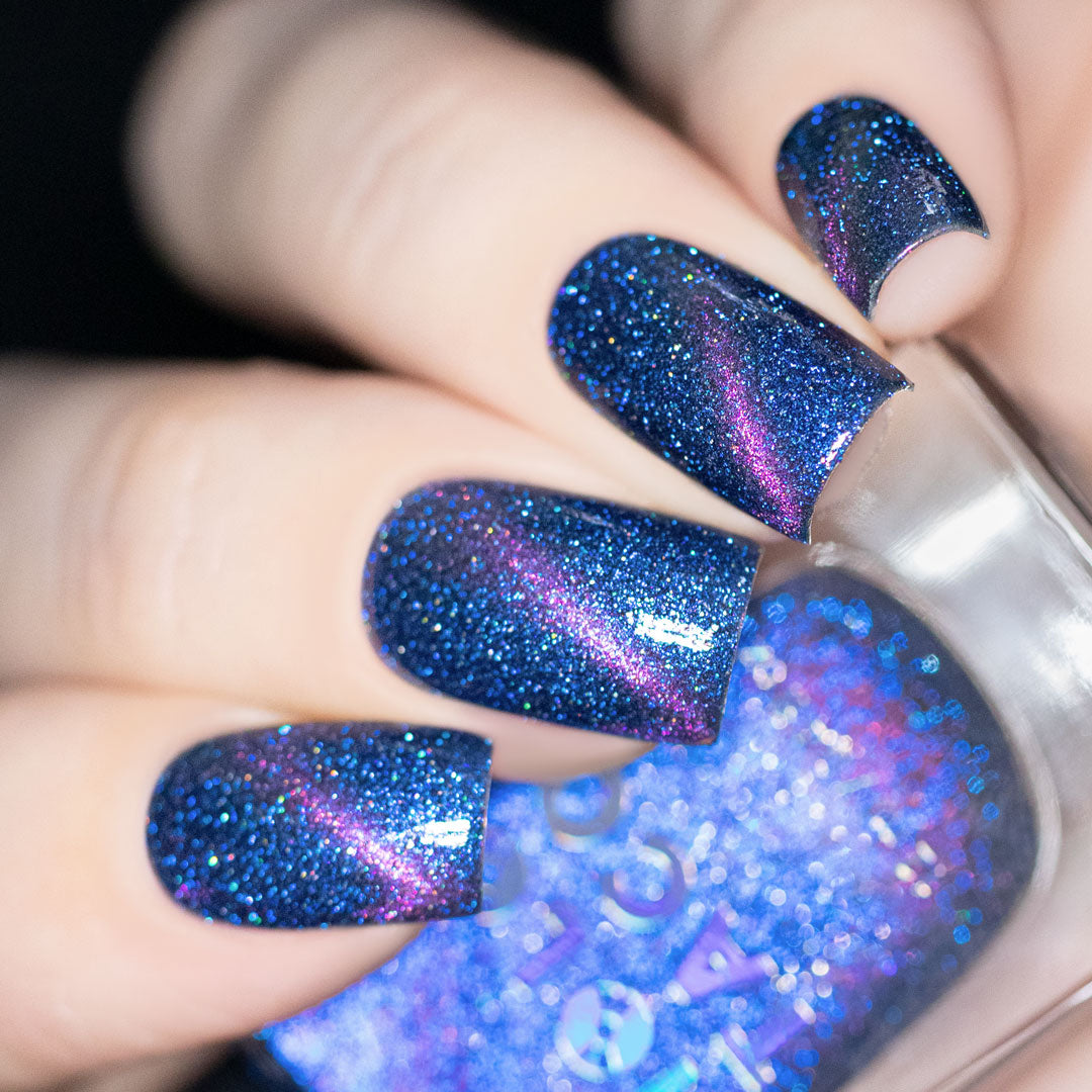 - Deep royal blue polish with a pink magnetic stripe, scattered holographic microglitters and blue reflective glitters