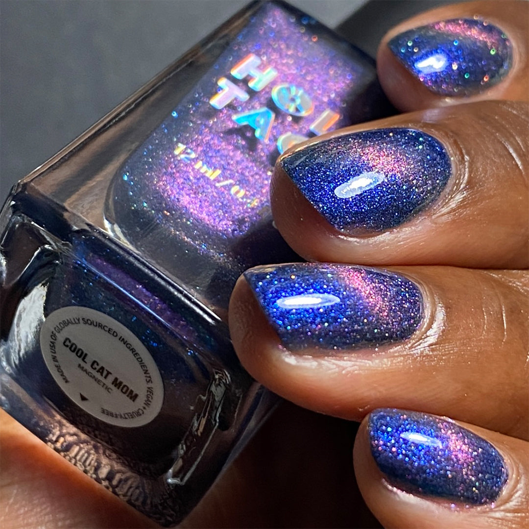 Feeling blue on your birthday? Embrace your inner Cool Cat Mom and let your nails be the life of the party. Apply two to three coats of this shiny blurple hue and leave as is, or wave your magnetic wand to brighten your year with a magnetic stripe of pink… your move.