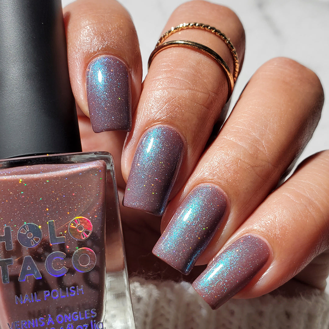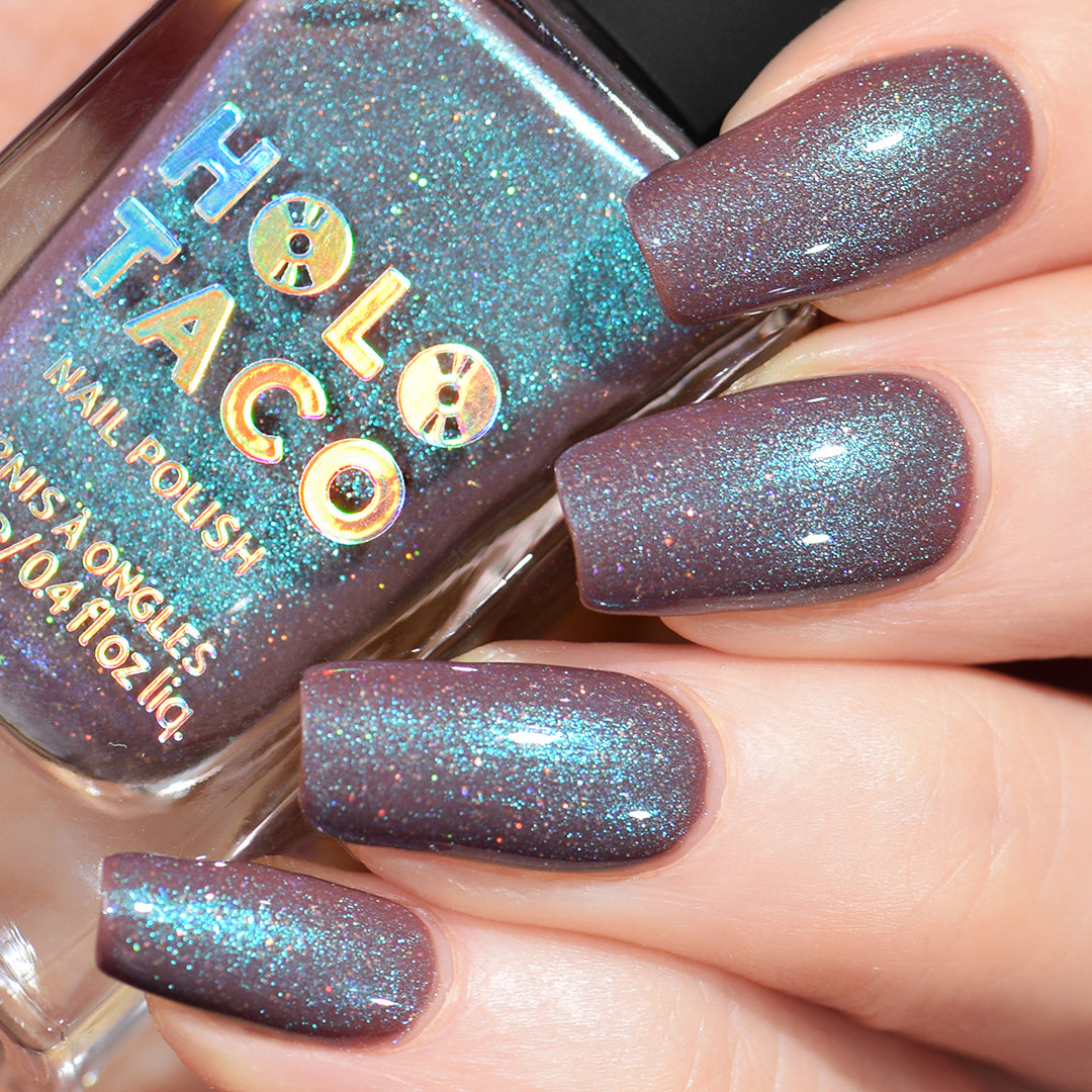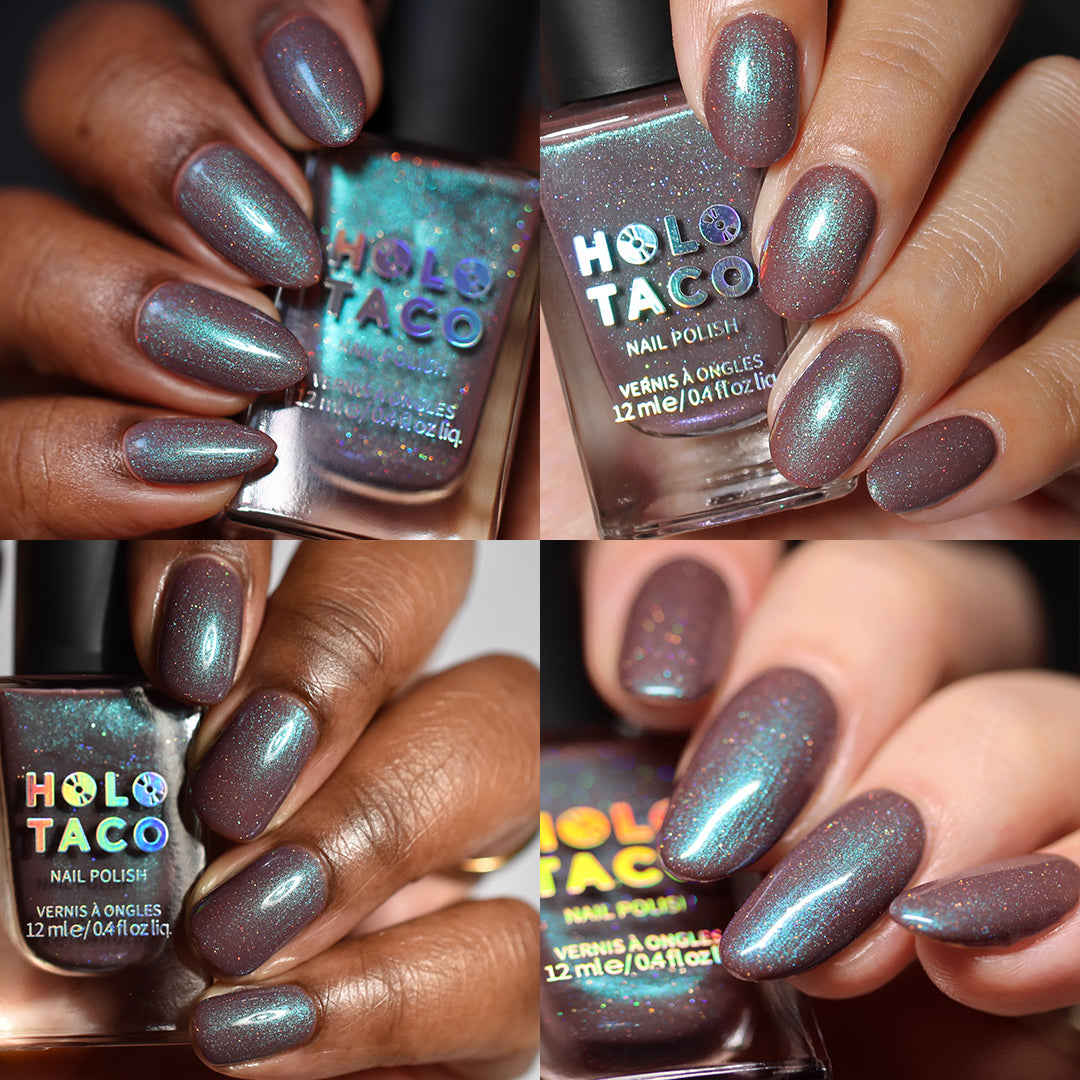Note: Shimmer nail polish shows best under direct sunlight, halogen bulbs, or just your phone camera flash! Swatch photos as pictured have one coat of Glossy Taco for optimal smoothness and shine. Super-pigmented shades may cause staining depending on the porousness of the nail and the use of a protective base coat. Polish should be stored in a cool, dark place to keep it at its best for longer and to prevent the colour or consistency from changing.