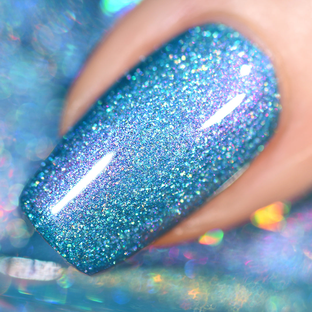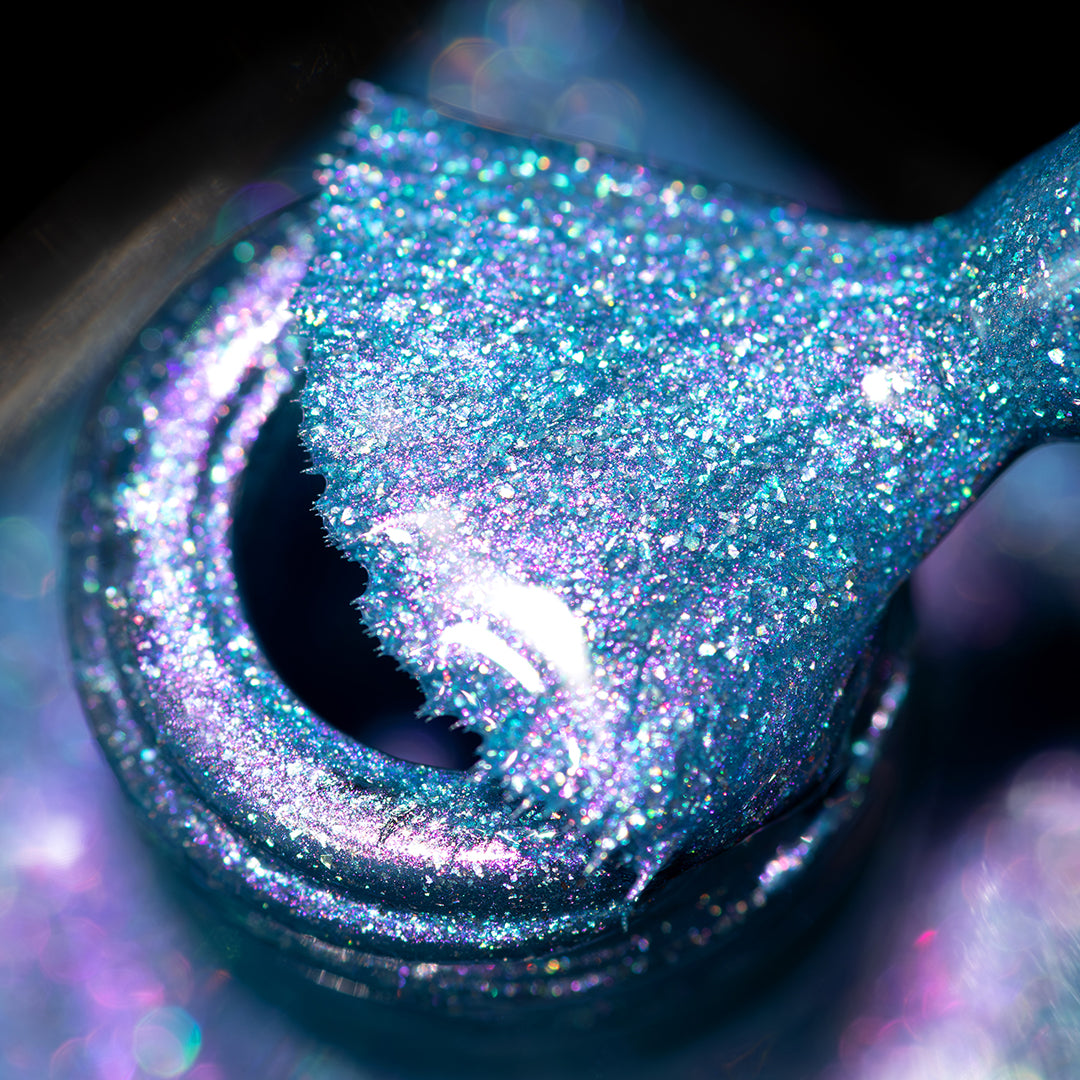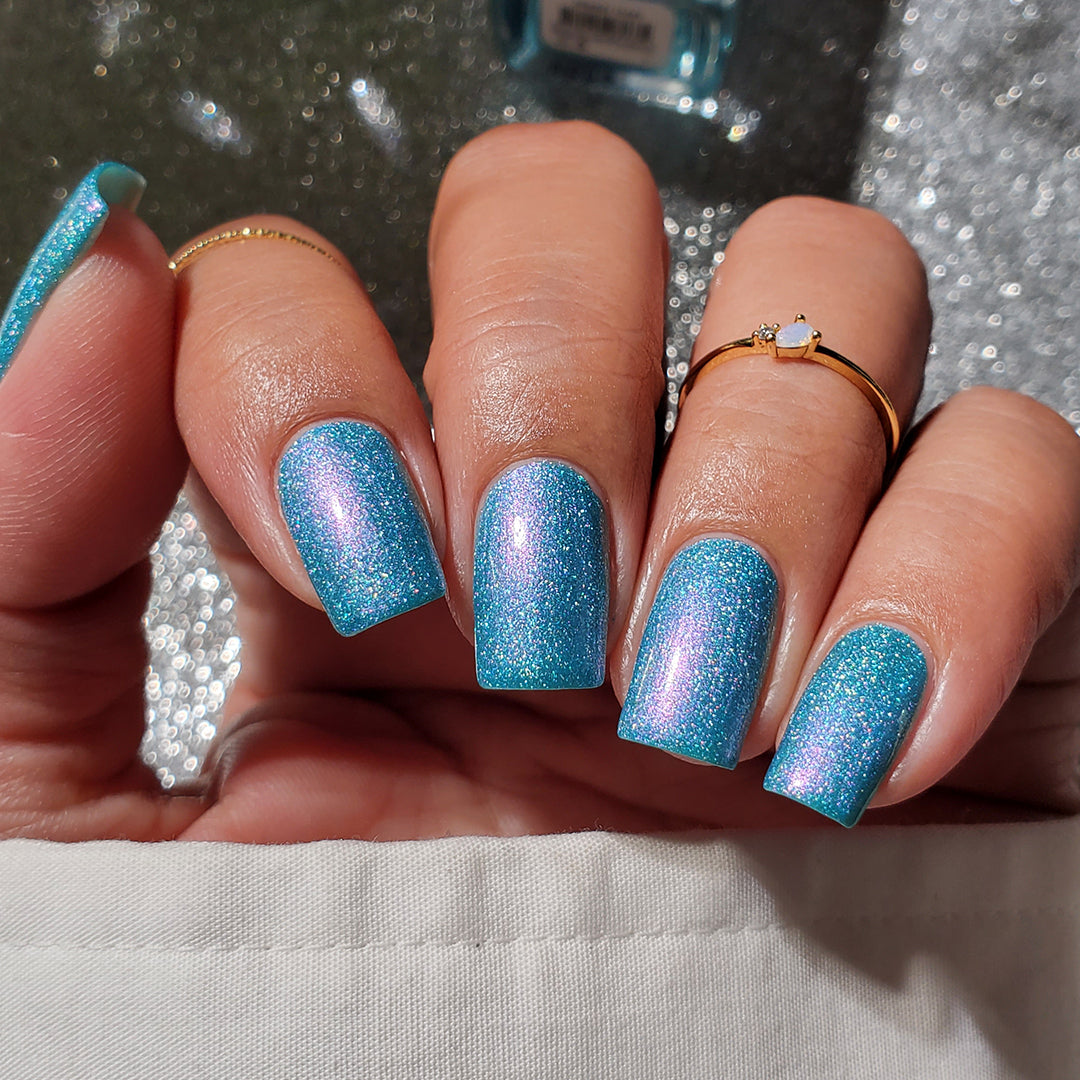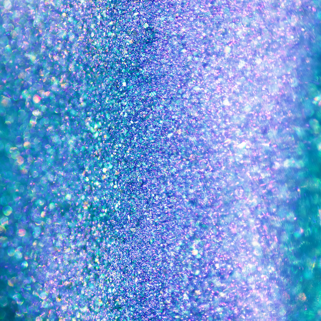 Crushed holographic formula in a turquoise shade with pink/purple iridescent micro-shimmer