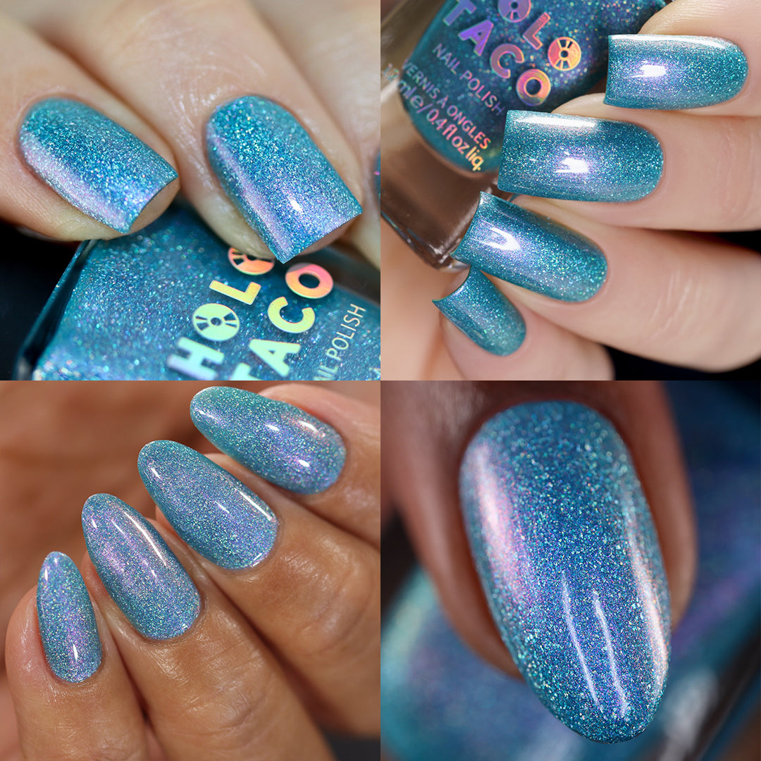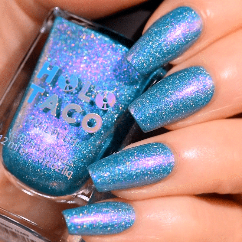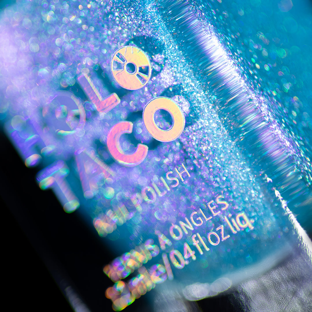 Note: Holographic nail polish shows best under direct sunlight, halogen bulbs, or just your phone camera flash! Swatch photos as pictured have one coat of Glossy Taco.