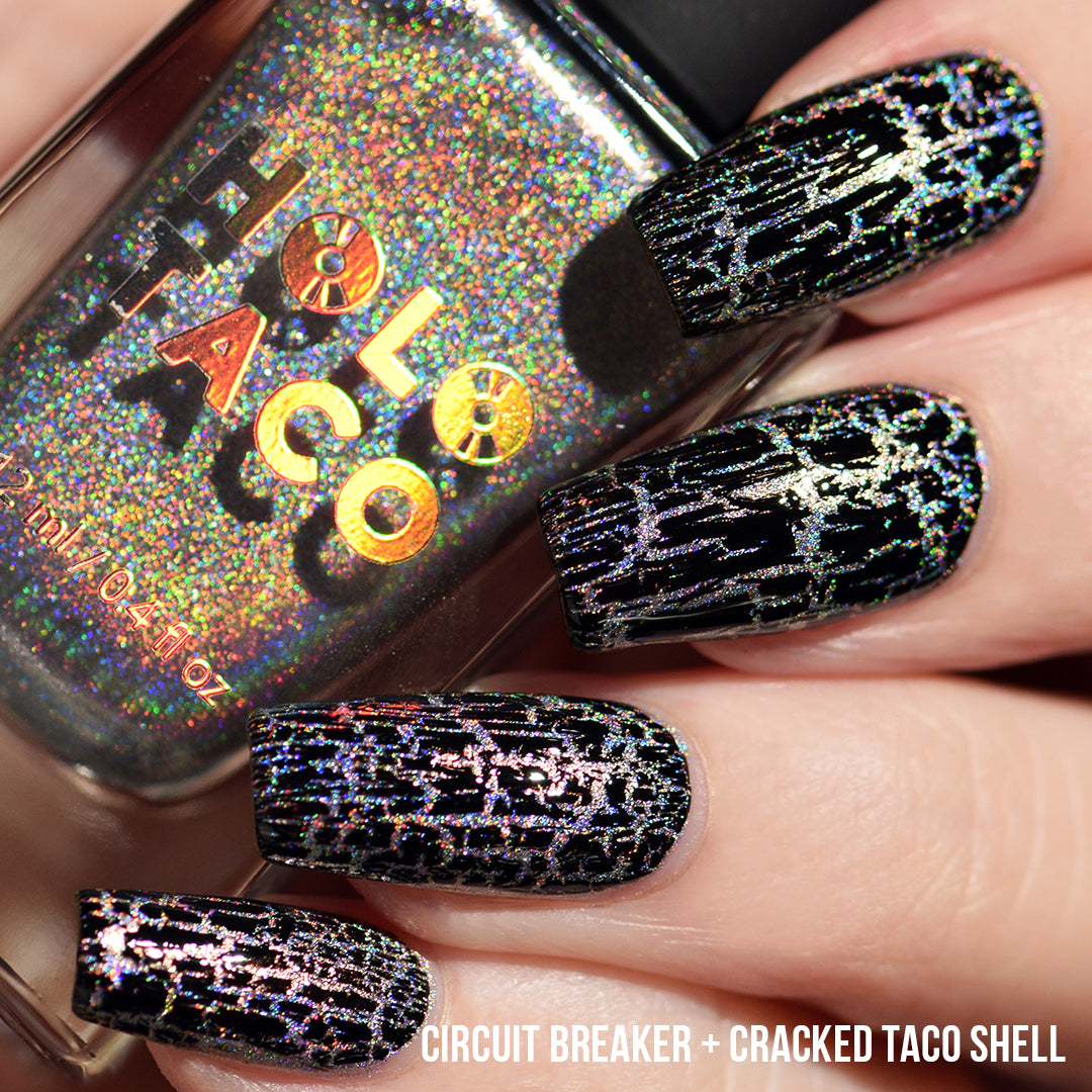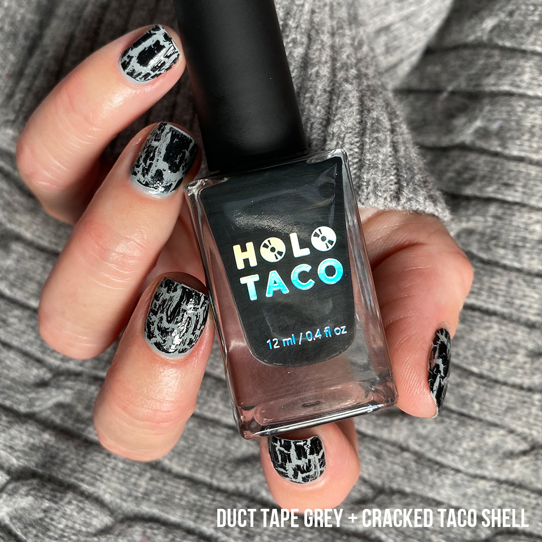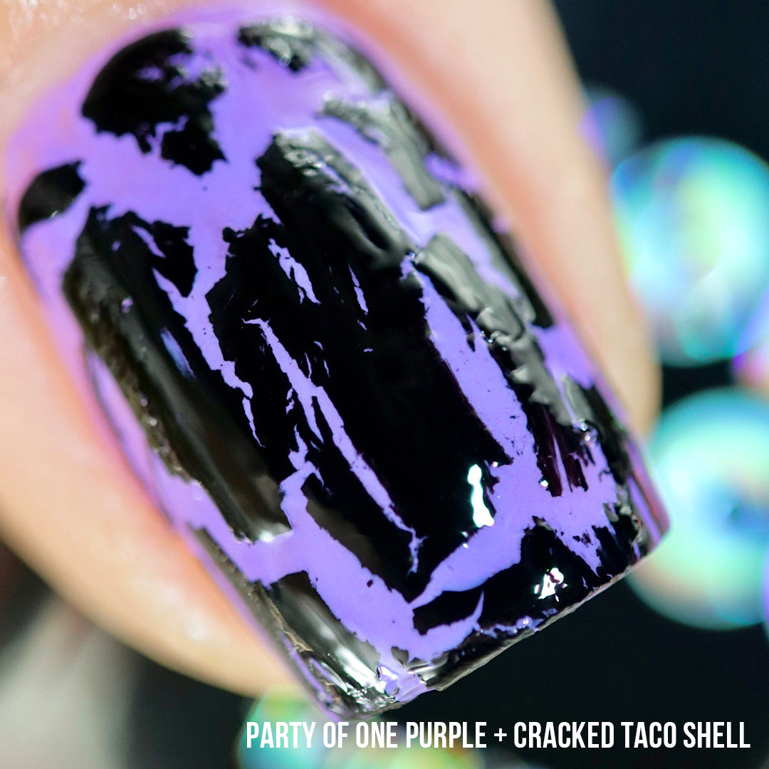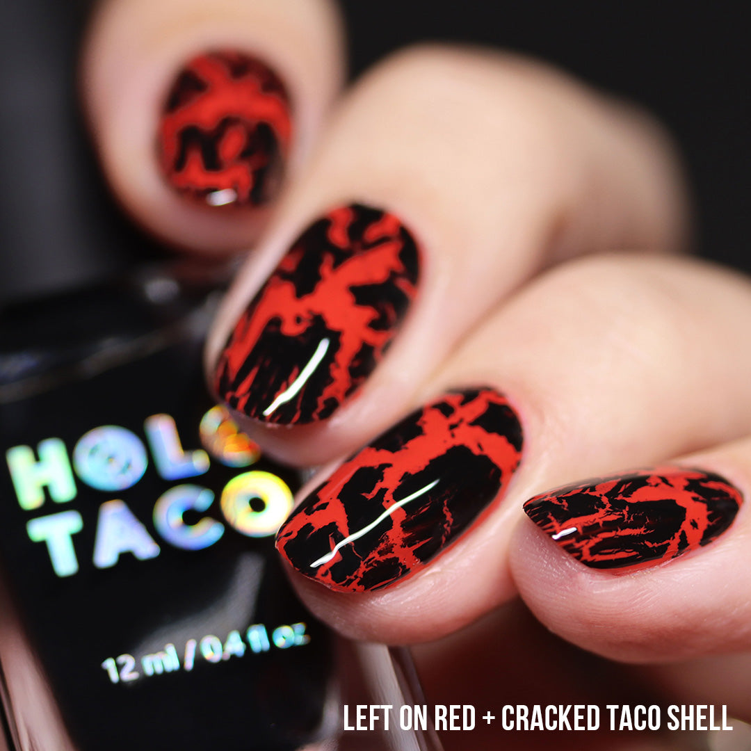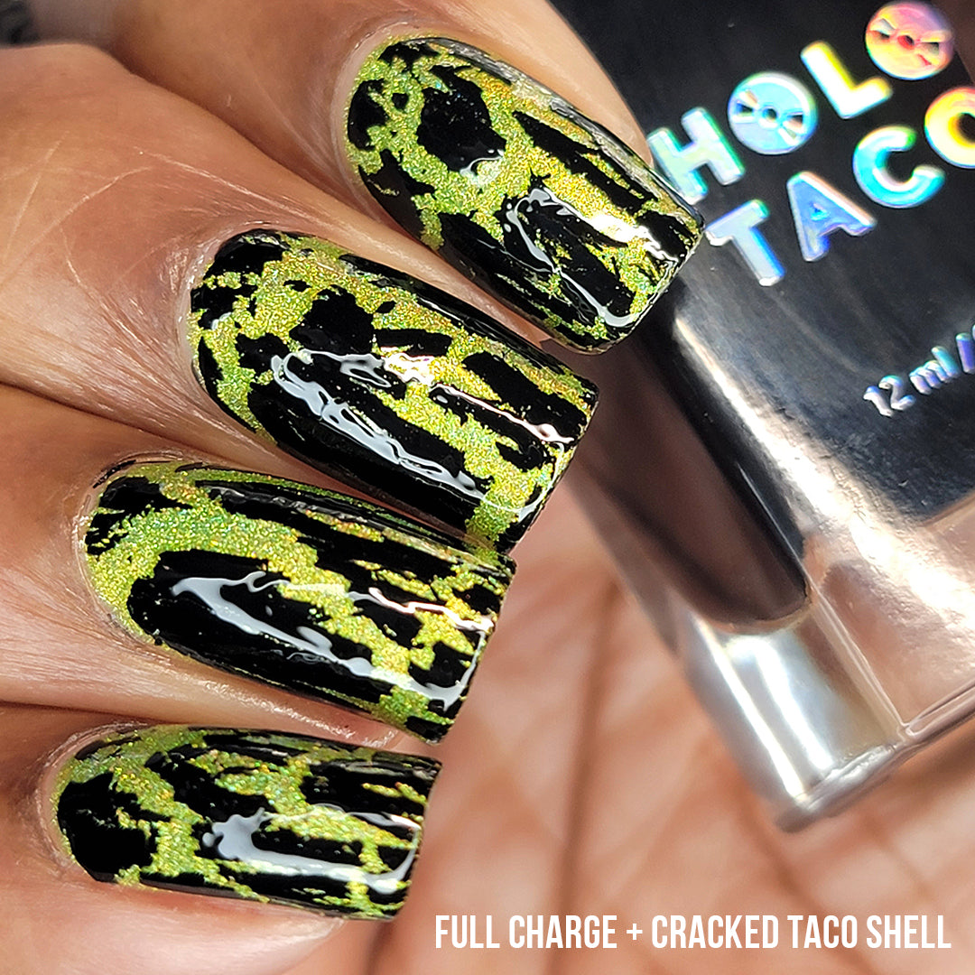 This isn’t your regular taco; it’s the cracked, slightly-burnt cousin who listens to emo and loves chaos. Cracked Taco is a black shatter topper that takes any base color and says, “Let’s destroy this in the most stylish way possible.” Application is smooth—until it splits like my sanity after trying to decide on a polish combo. The cracks form unpredictably, giving you that perfectly imperfect, “I woke up like this” look. It’s messy, dramatic, and honestly iconic. Would I recommend it? Only if you’re ready to serve tortilla chips and attitude on your nails. Holo Taco, thanks for giving us the emo taco we never knew we needed.