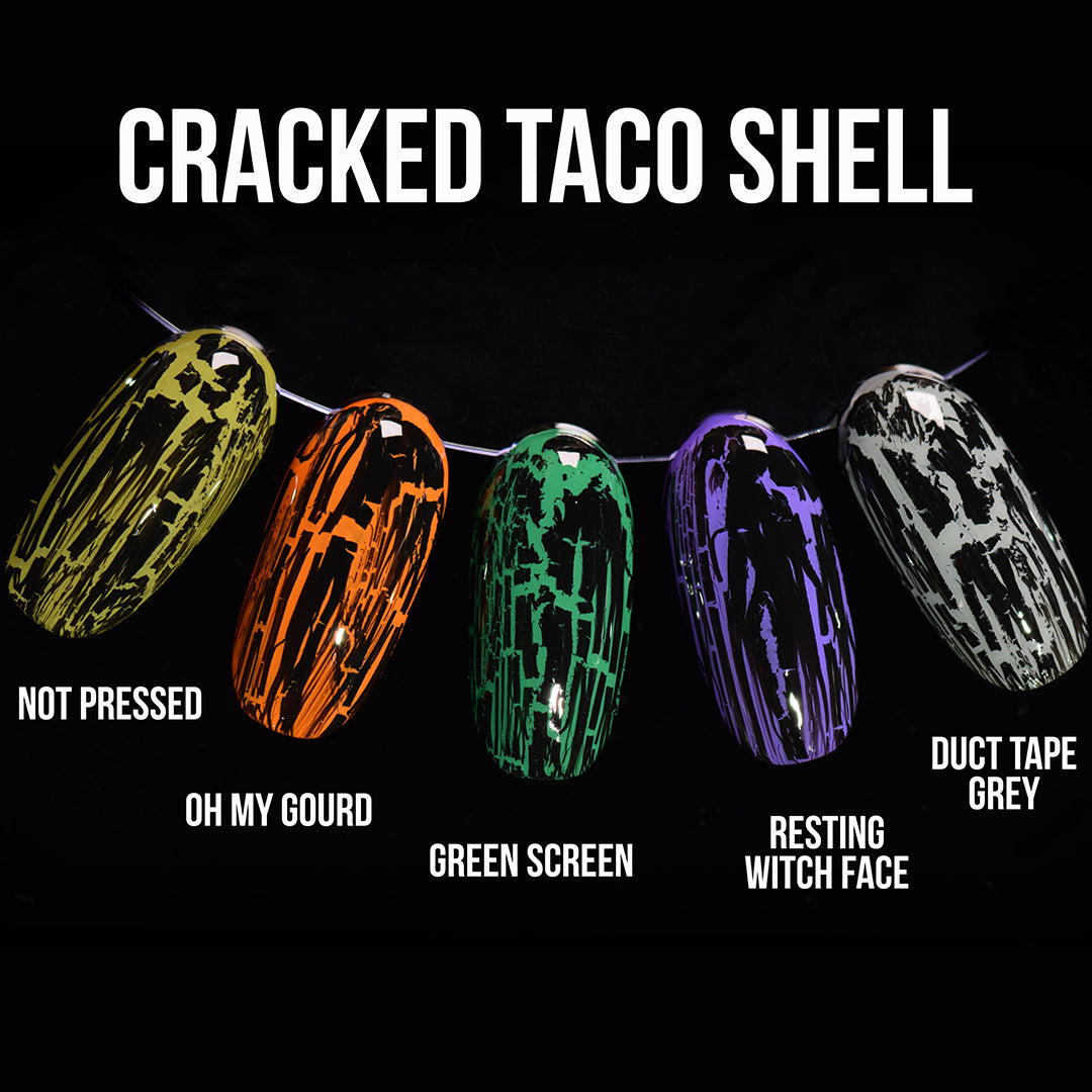 - 3. Finish with a Glossy Taco to seal in your mani for shiny, quick-dry and long lasting wear results. On its own, Cracked Taco Shell dries down matte with a textured finish. The crackle formula may still be textured under a single coat of top coat, so add a second coat of Glossy Taco once the first coat is dry for a smoother finish.