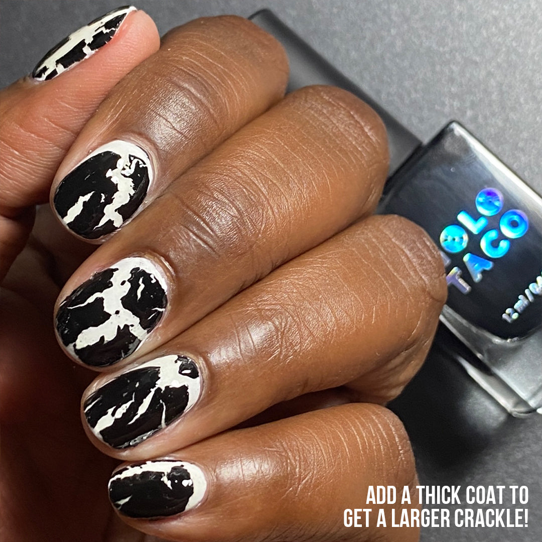 - 2. Shake your Cracked Taco Shell well before each use. Apply 1 thin, even coat of the crackle topper over the entire nail. Let touch dry.