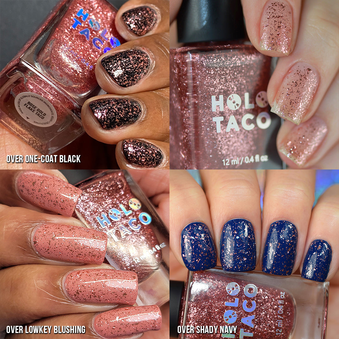 Rose Gold Flake Taco: Ethyl Acetate, Butyl Acetate, Nitrocellulose, Adipic Acid/Neopentyl Glycol/Trimellitic Anhydride Copolymer, Acetyl Tributyl Citrate, Isopropyl Alcohol, Silica, Polyethylmethacrylate, N-Butyl Alcohol, Benzophenone-1, CI 77491 (Red Iron Oxide), CI 77000 (Aluminum Powder), CI 60725 (Violet 2)