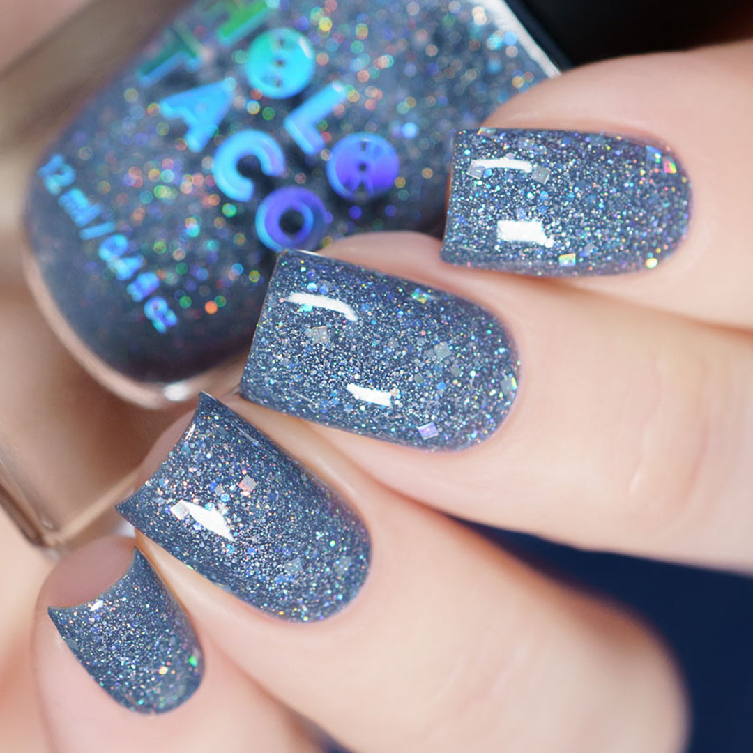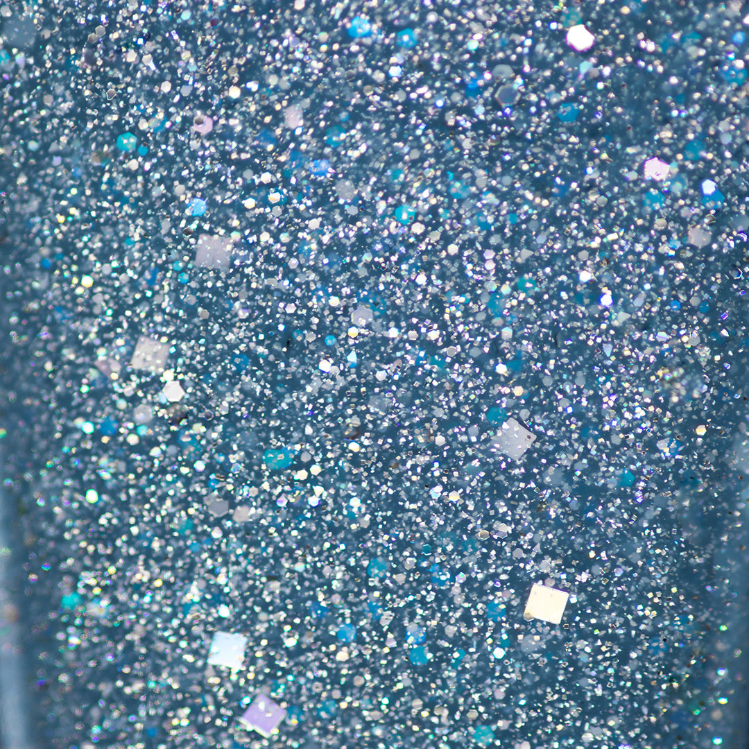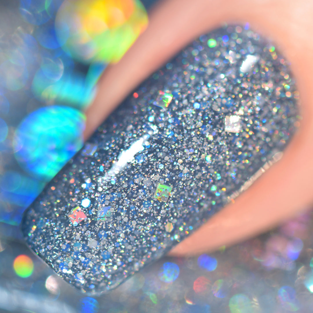 - Muted grey-blue polish in a specialty glitter formula with holographic silver diamond-shaped glitters and blue iridescent glitter