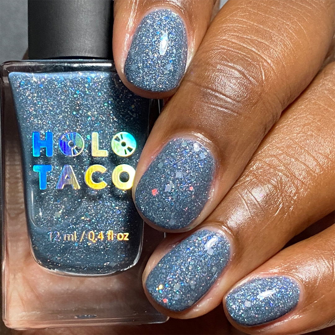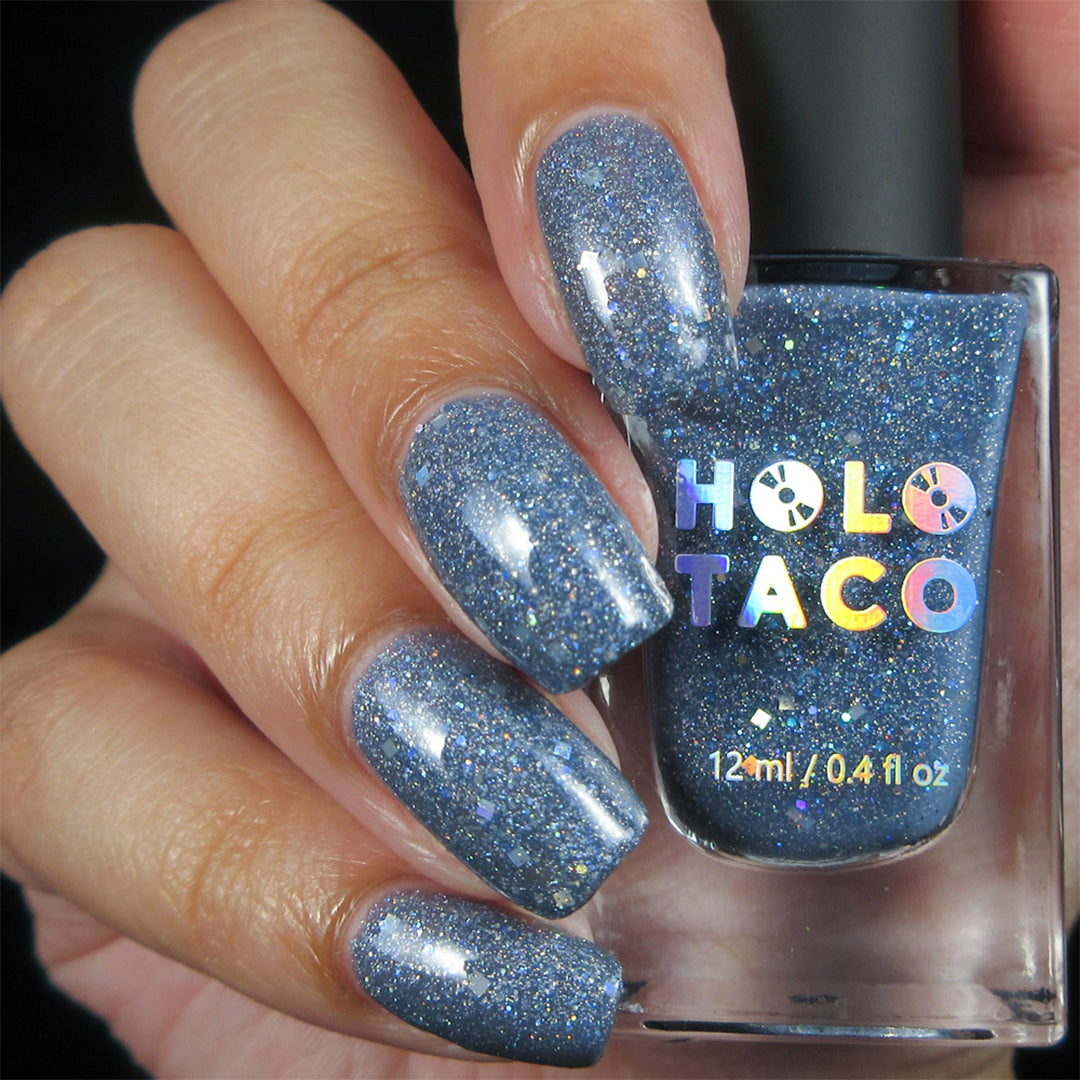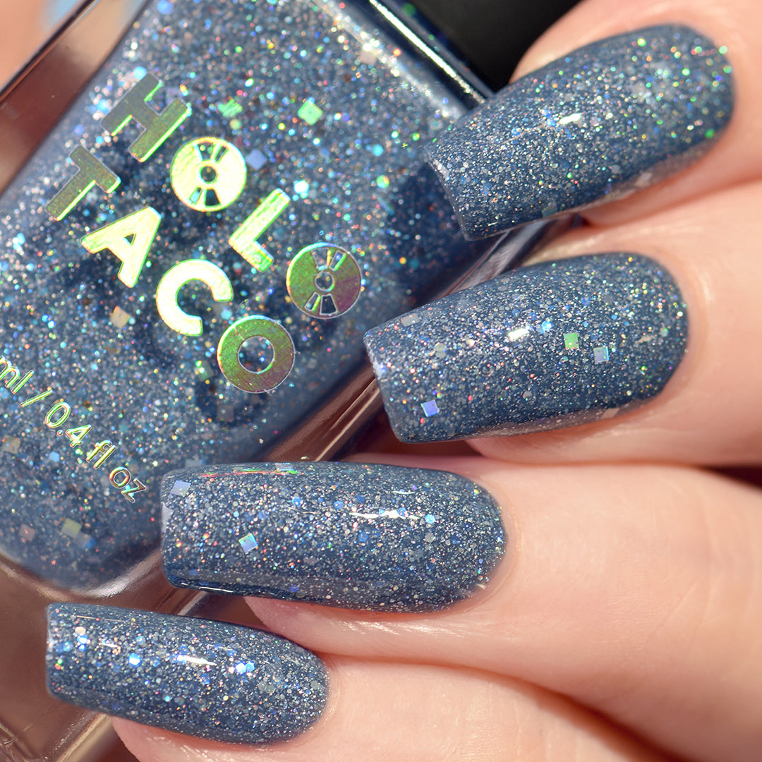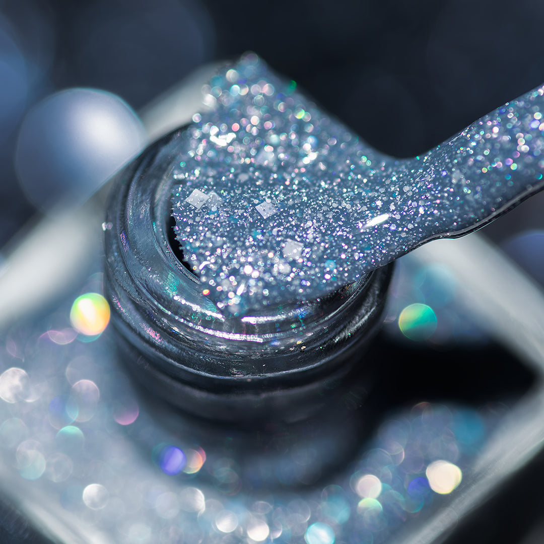 - Muted grey-blue polish in a specialty glitter formula with holographic silver diamond-shaped glitters and blue iridescent glitter