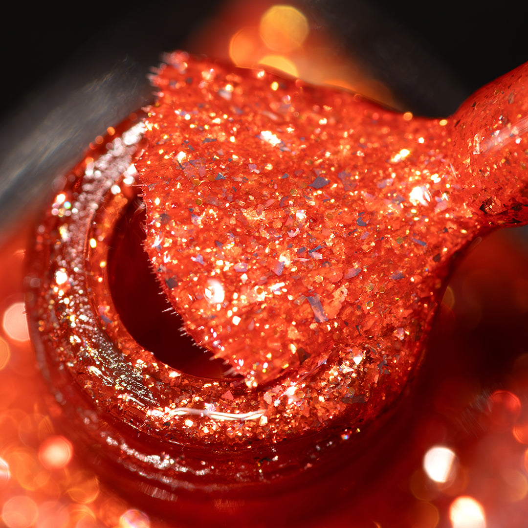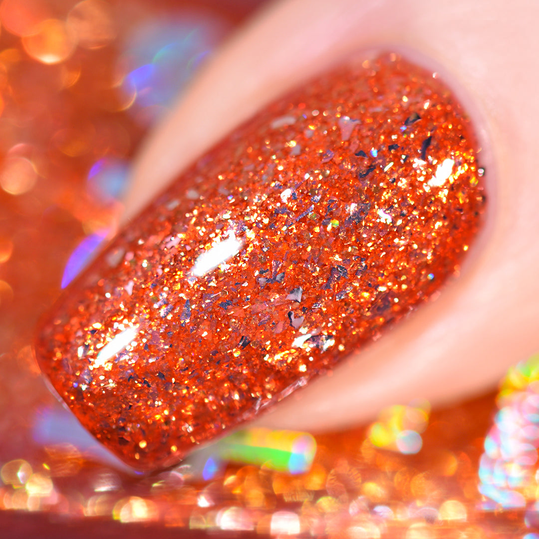 Metallic polish with foil flakes and scattered gold holographic pigment in a bright orange base