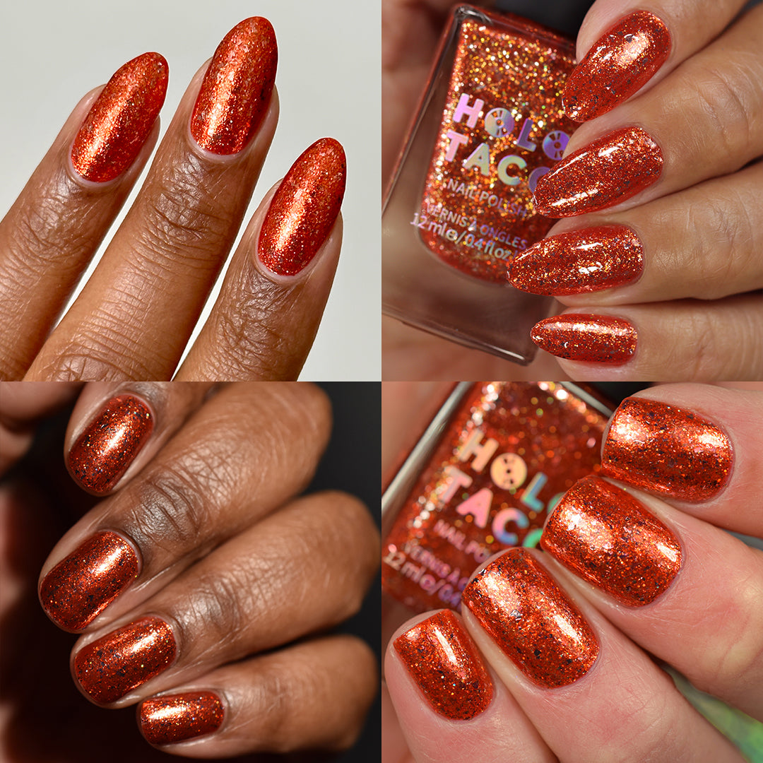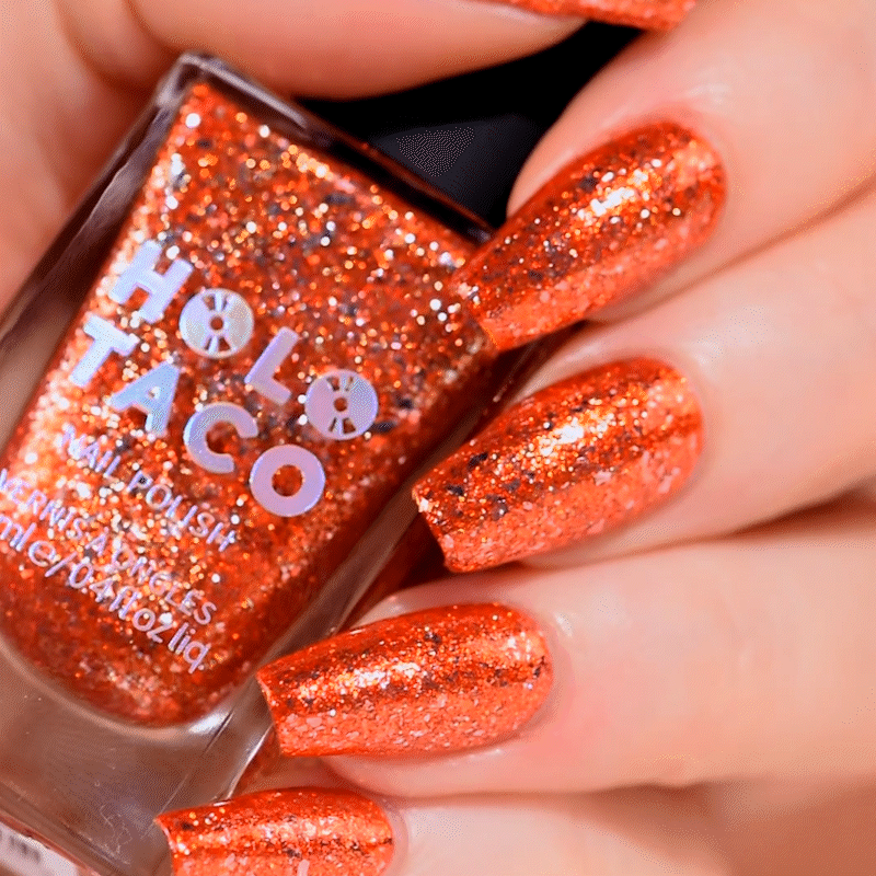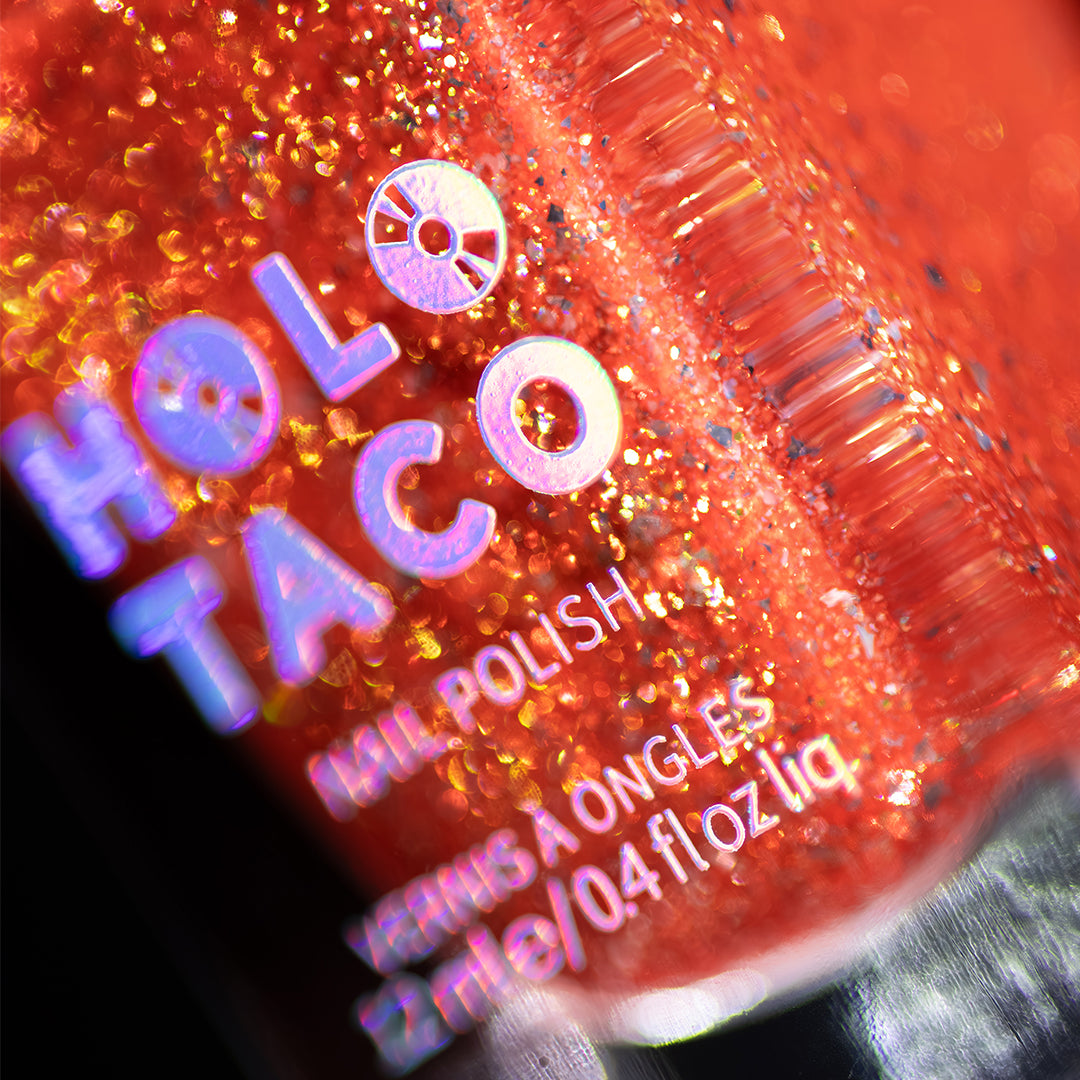 Note: Holographic nail polish shows best under direct sunlight, halogen bulbs, or just your phone camera flash! Swatch photos as pictured have one coat of Glossy Taco for optimal smoothness and shine.