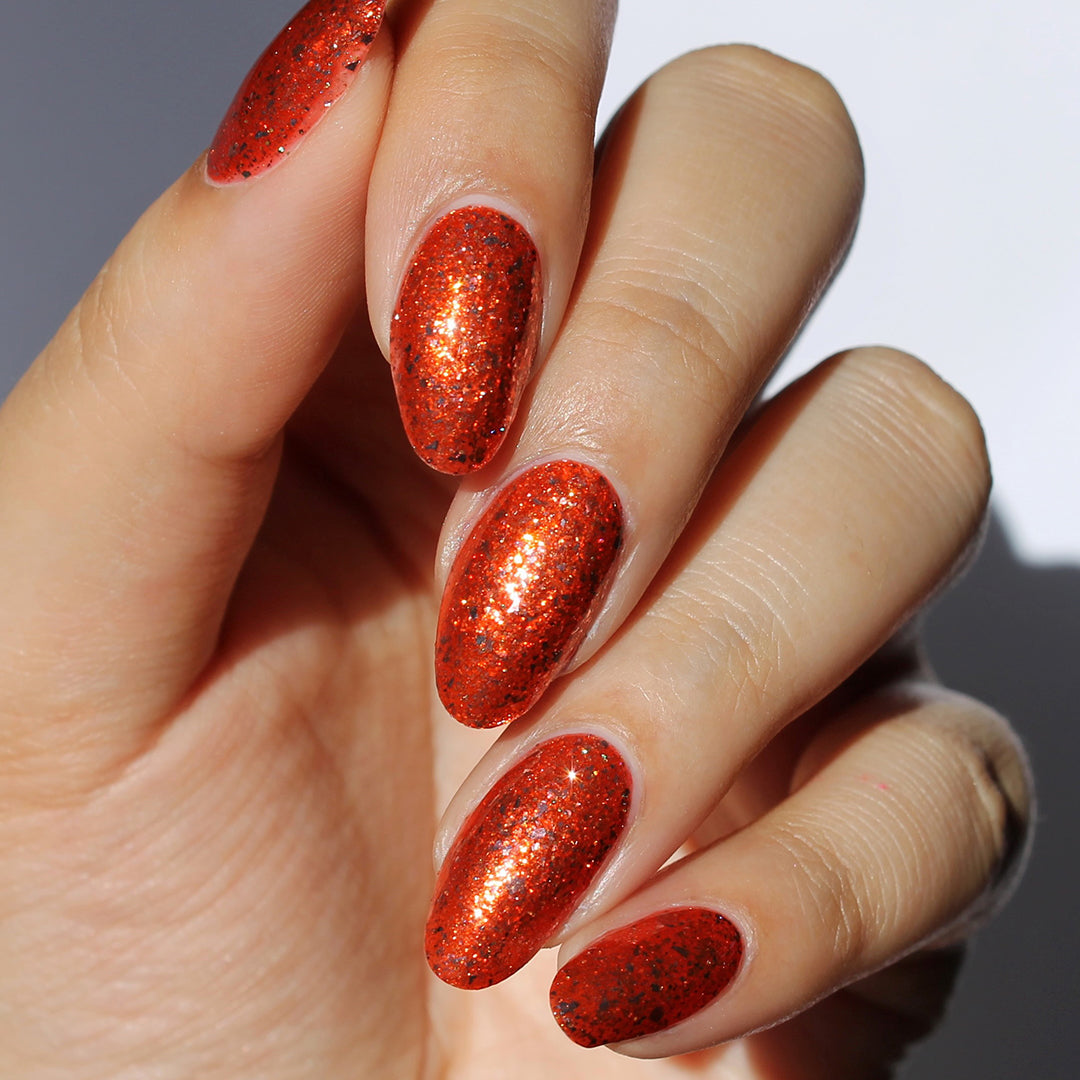 Cowboys can bring the heat too. Fiery orange meets frosted metal to light up the way, complete with a golden scattered holo finish. Hot-headed, high-shine, and ready to dance.