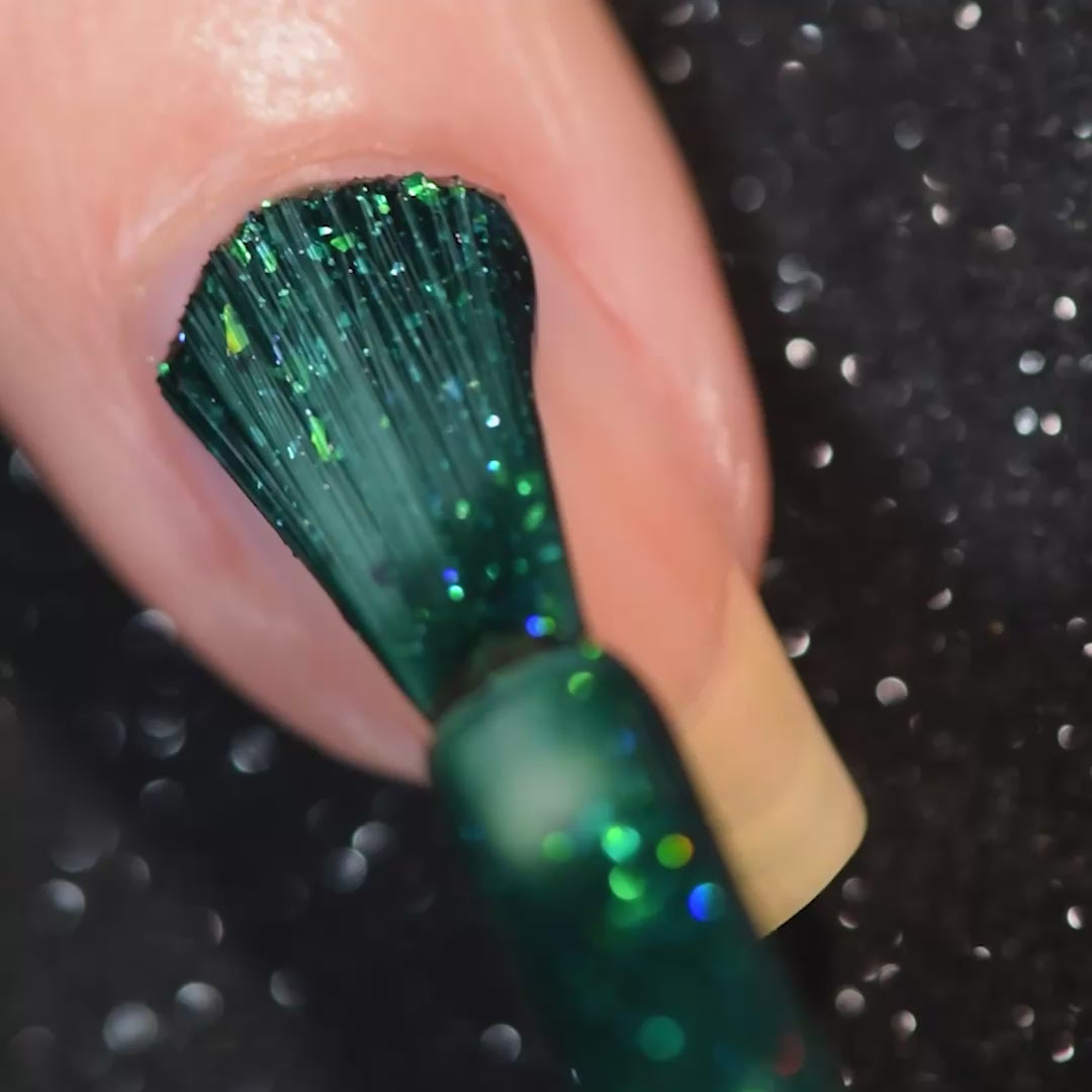 - Cool emerald green iridescent flake formula with a deep green jelly base and scattered holo