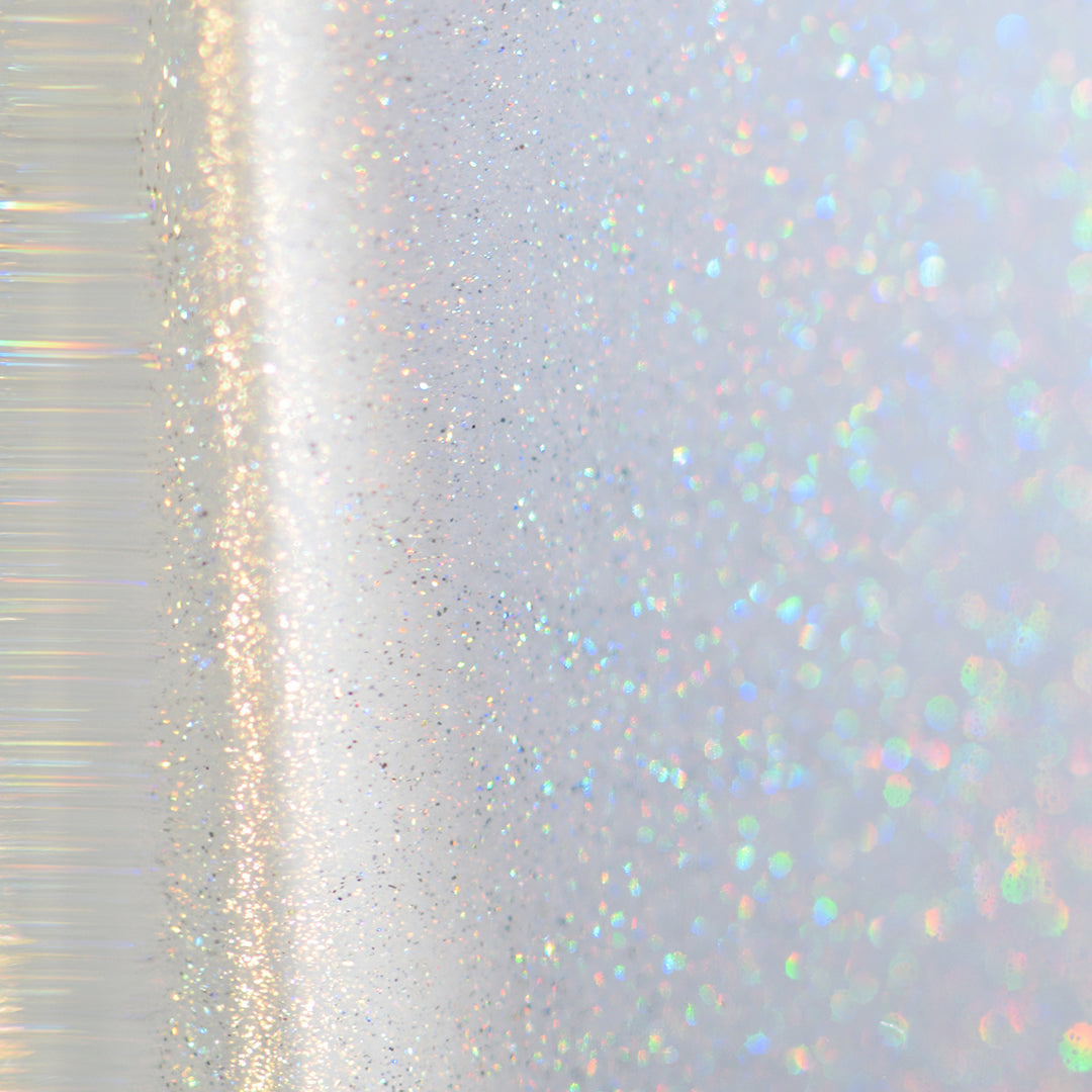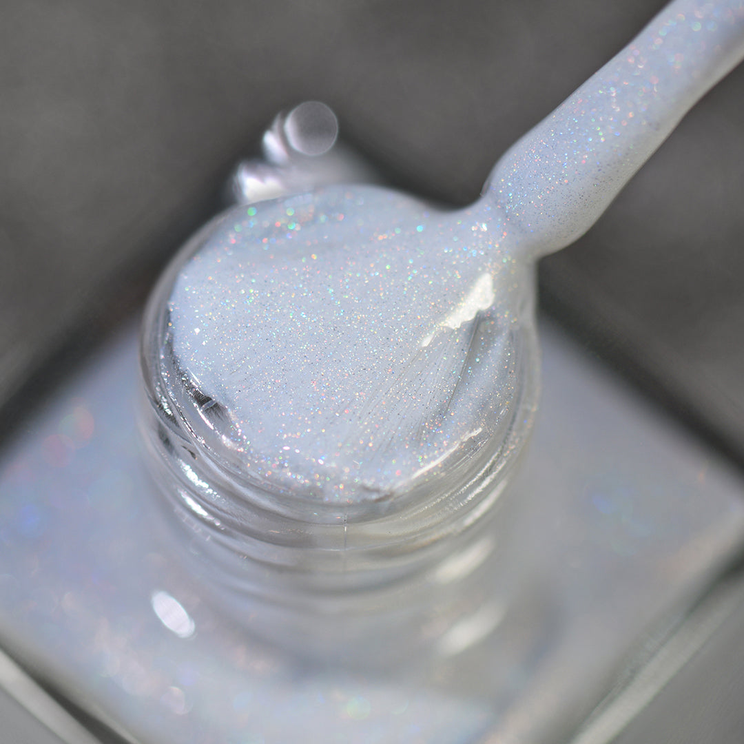 - Linear holographic polish in a pale grey, nearly-white shade.