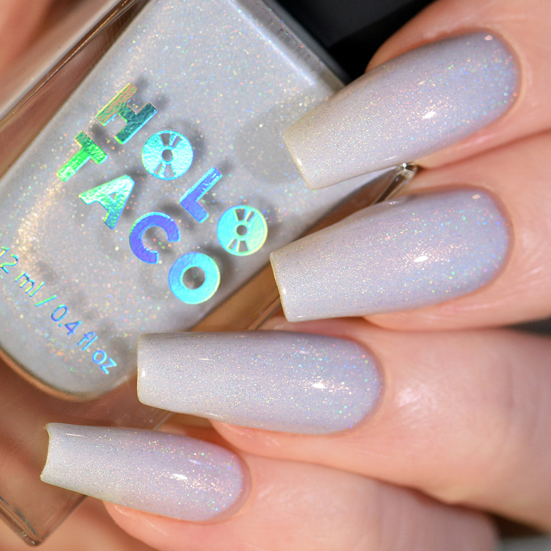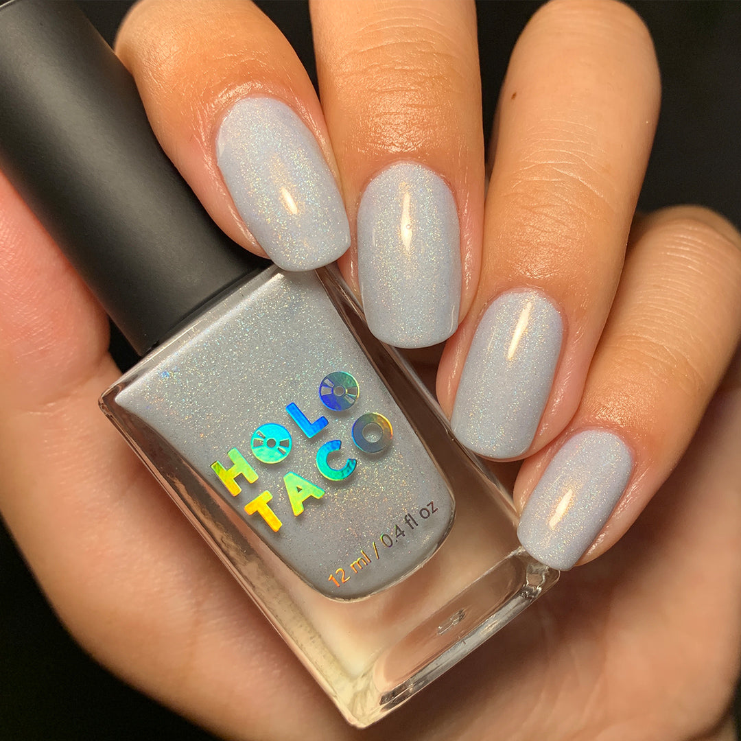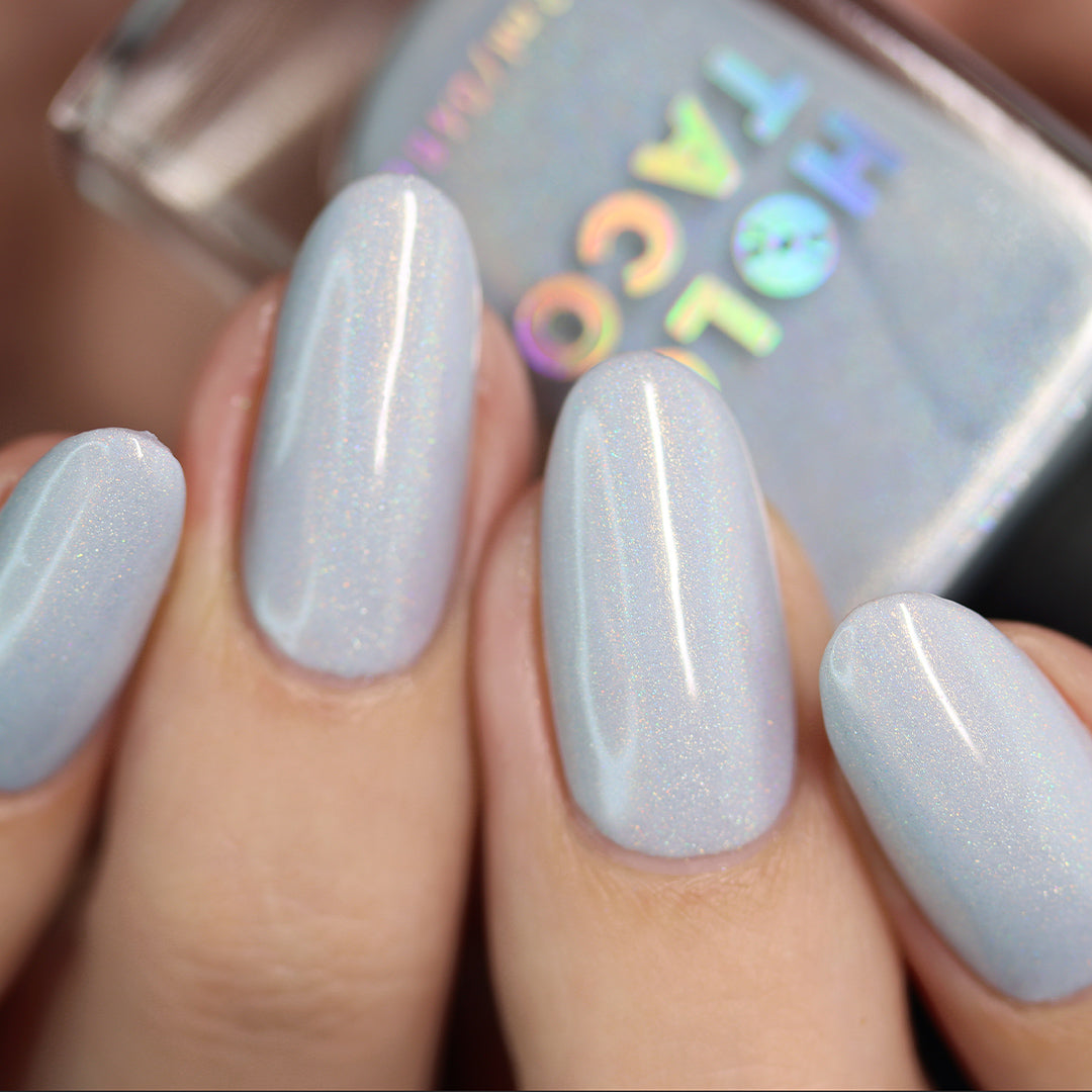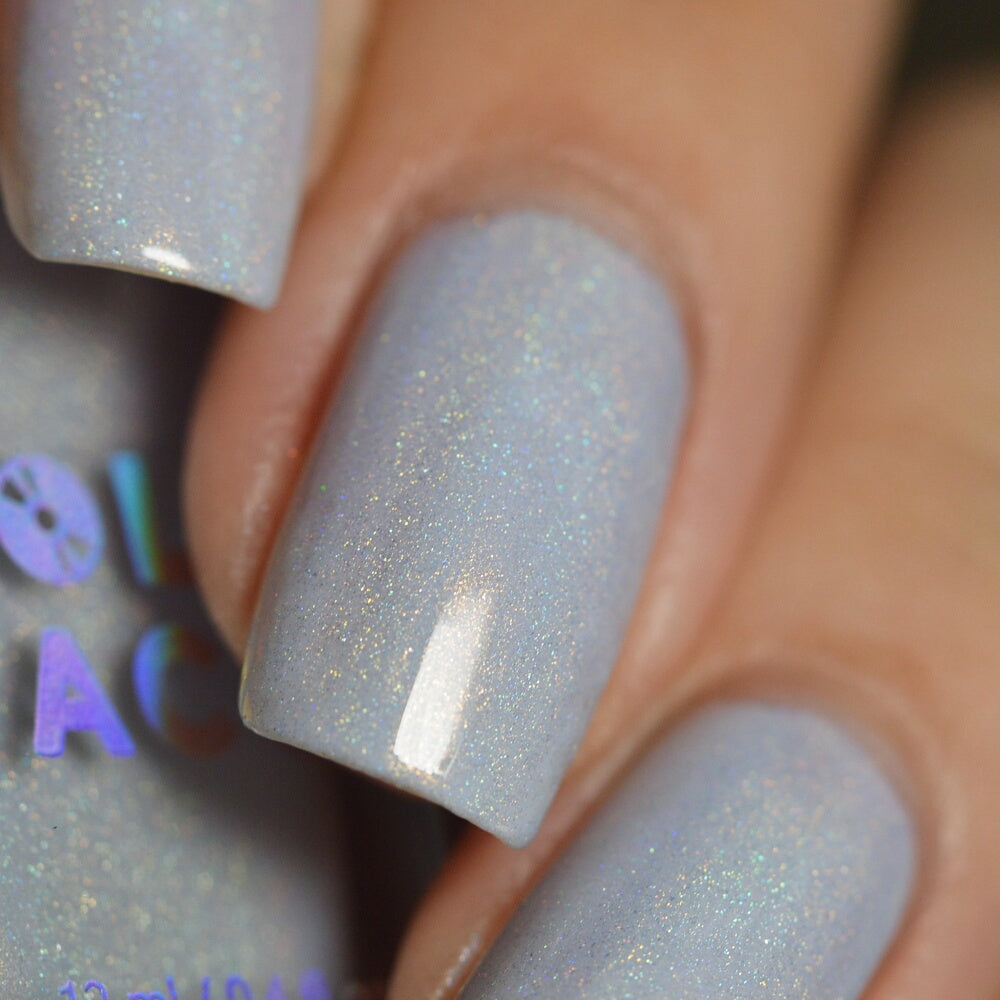 Everyone please take several seats, our Featured Guest has arrived. This is the white linear holo of your dreams. A subtle dove grey, nearly-white crelly base with a delicate dose of holographic flair, this nail polish is truly an event your nails won’t want to miss.