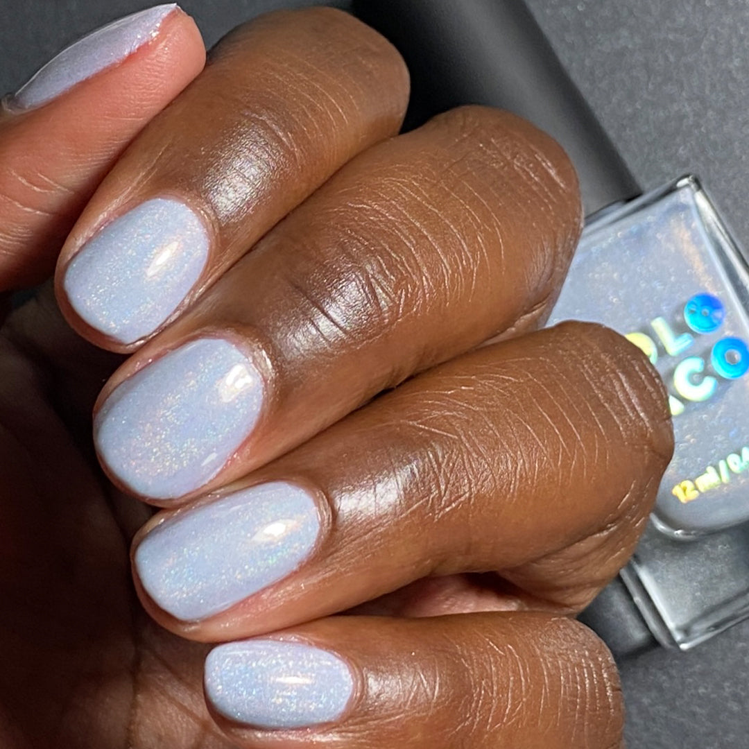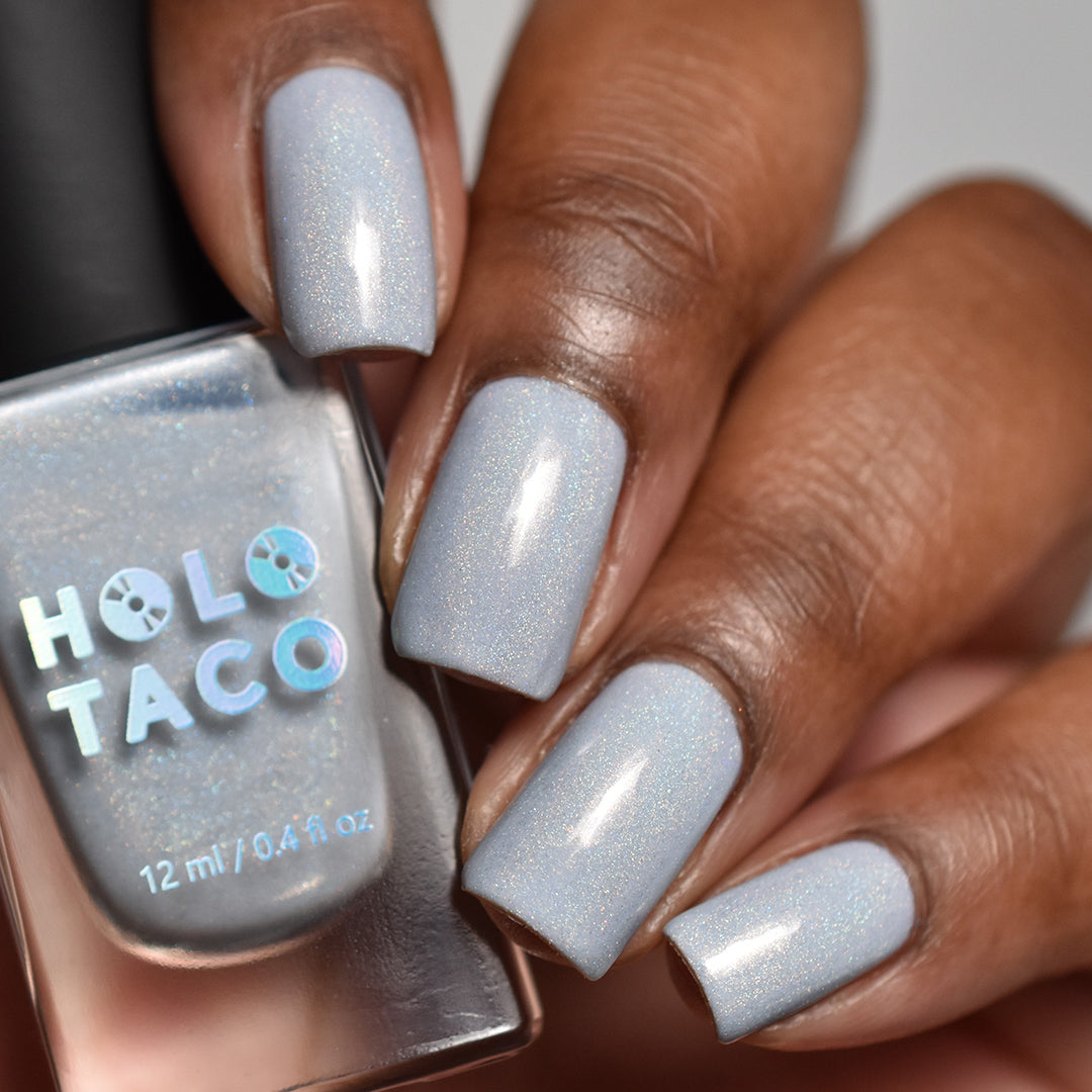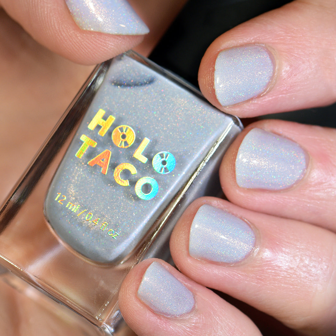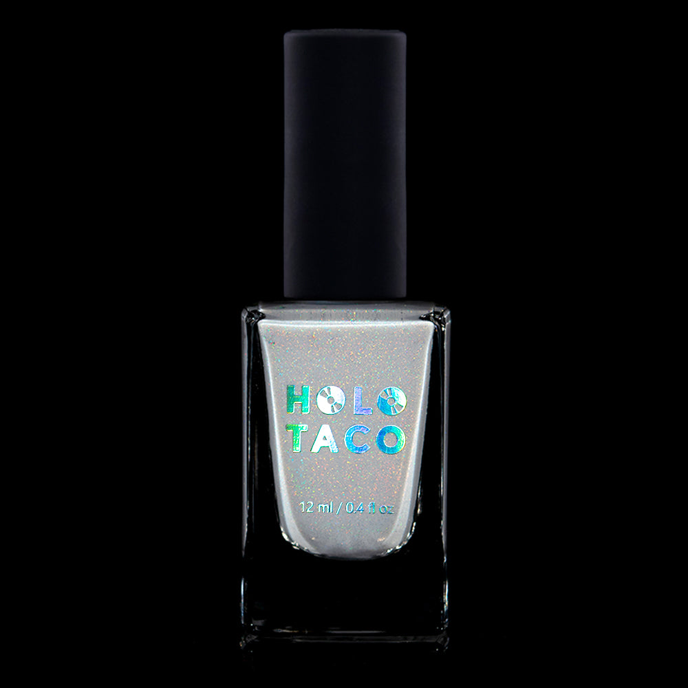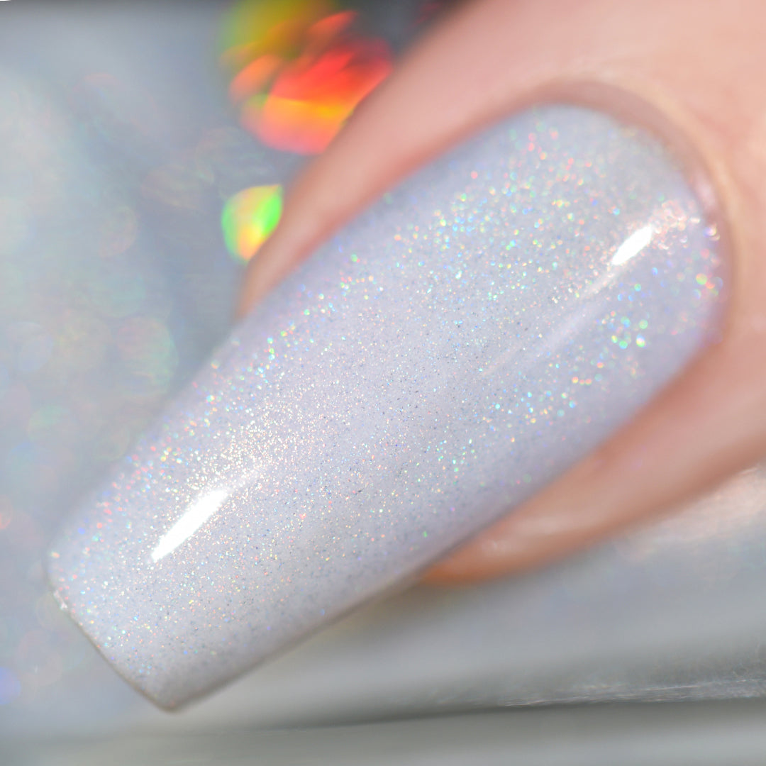 Everyone please take several seats, our Featured Guest has arrived. This is the white linear holo of your dreams. A subtle dove grey, nearly-white crelly base with a delicate dose of holographic flair, this nail polish is truly an event your nails won’t want to miss.