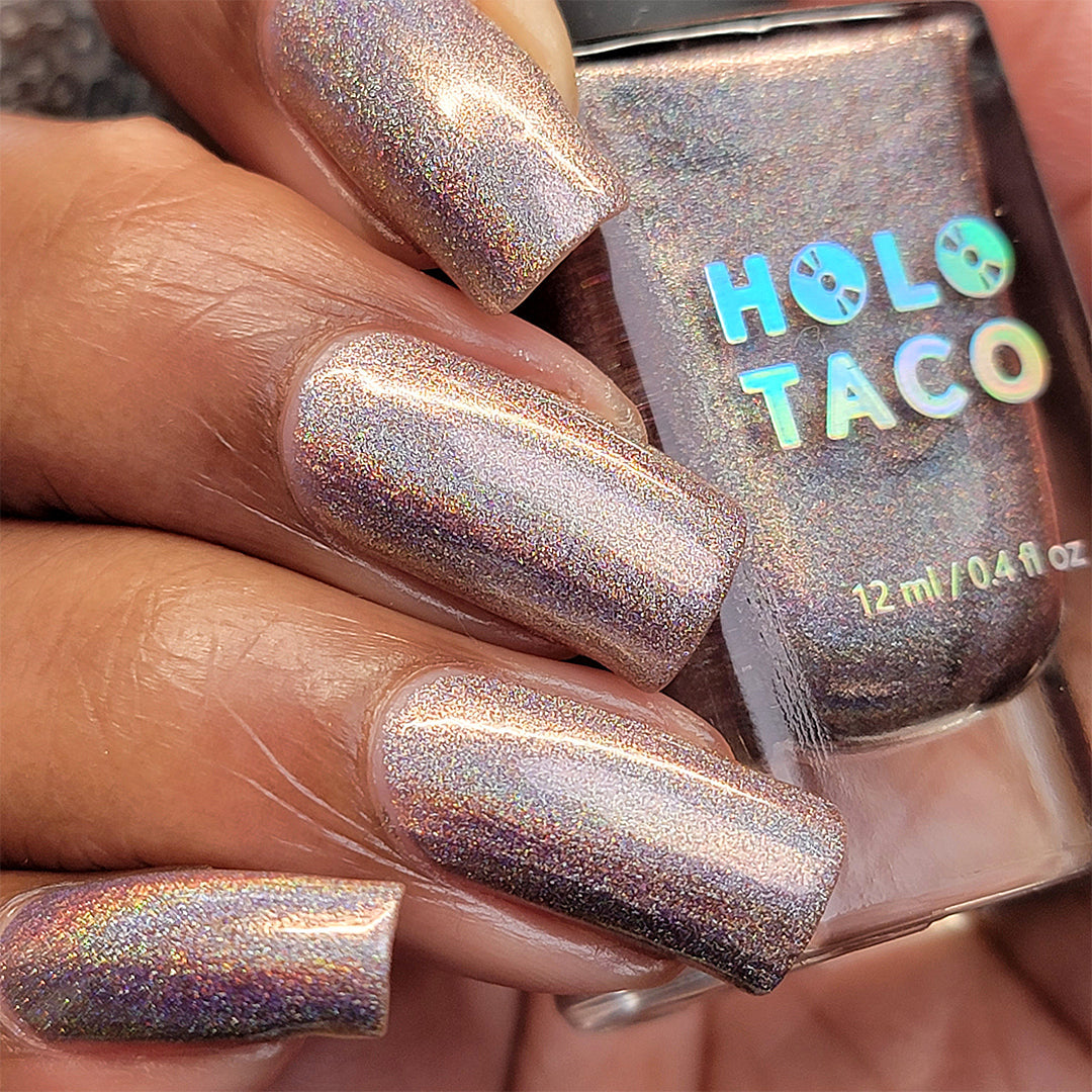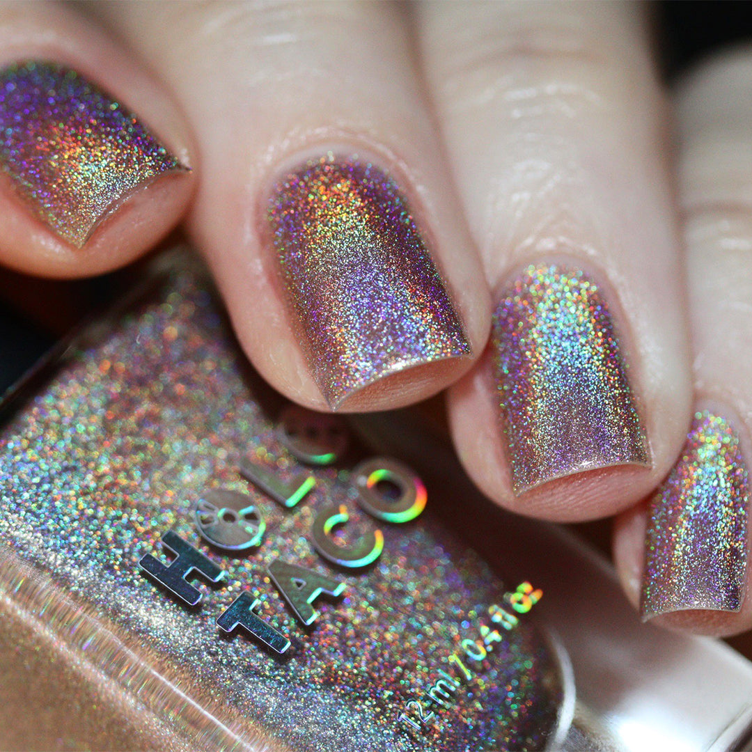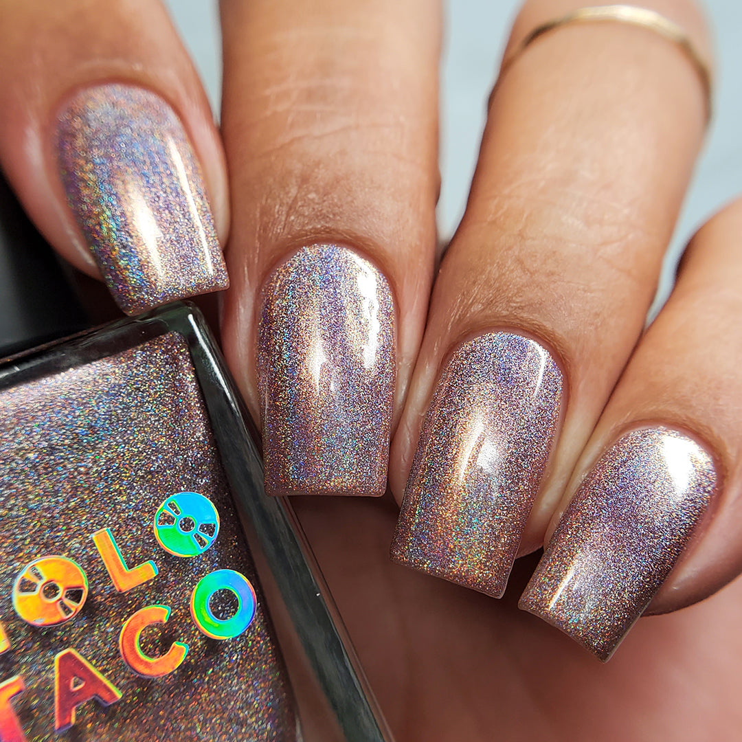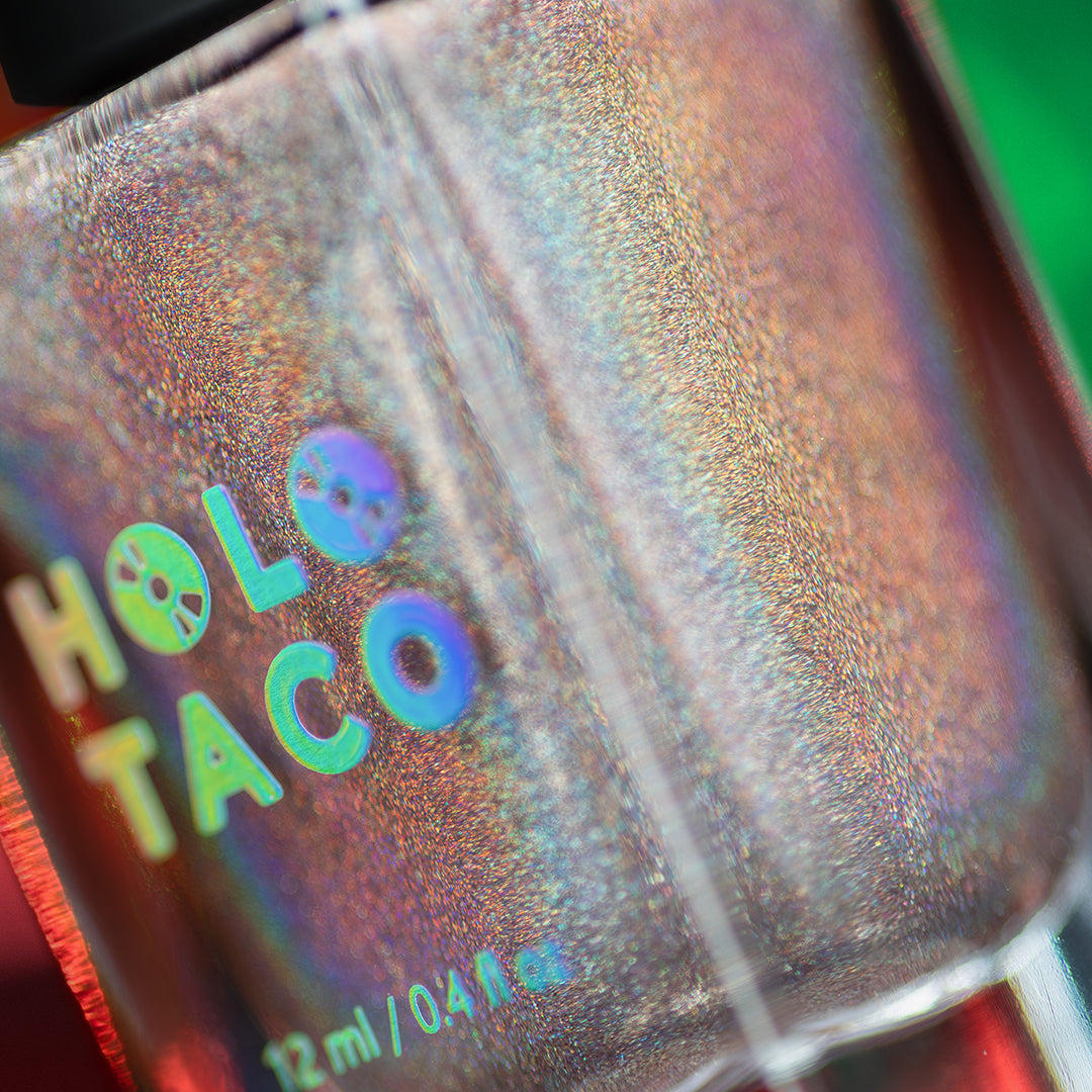 - Note: Holographic nail polish shows best under direct sunlight, halogen bulbs, or just your phone camera flash! Swatch photos as pictured have one coat of Glossy Taco for optimal smoothness and shine.