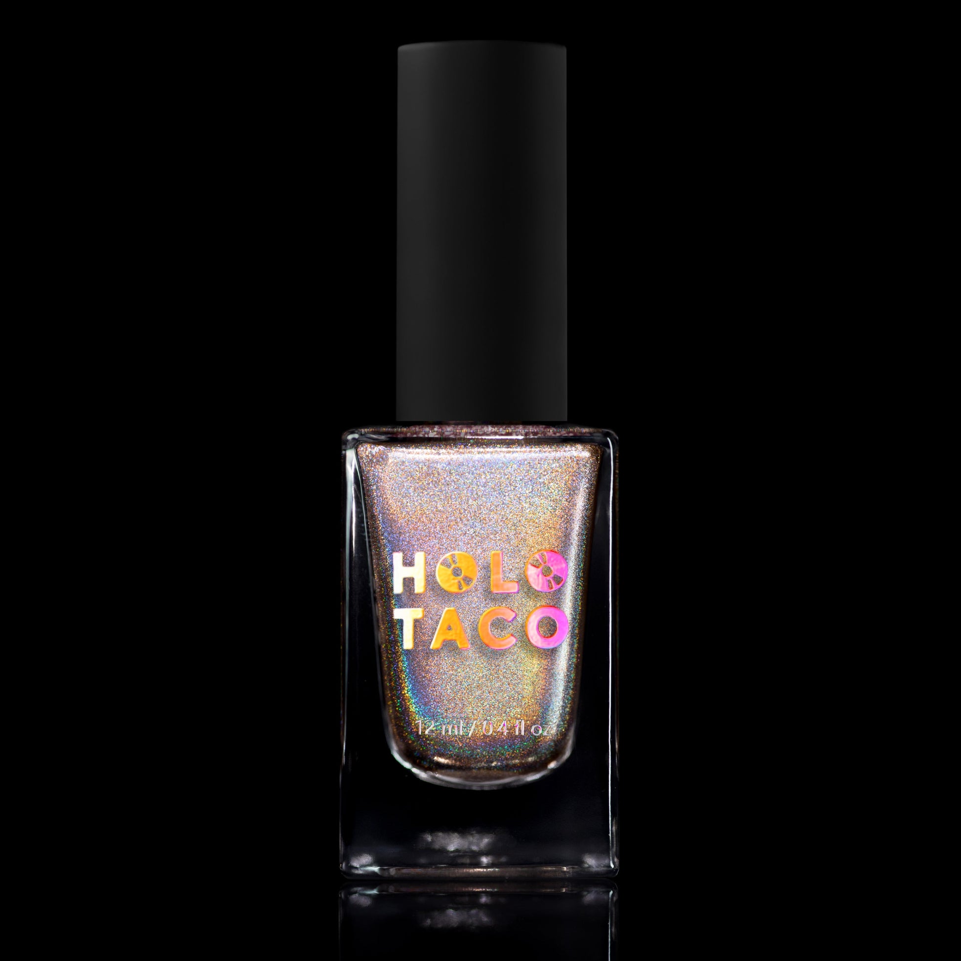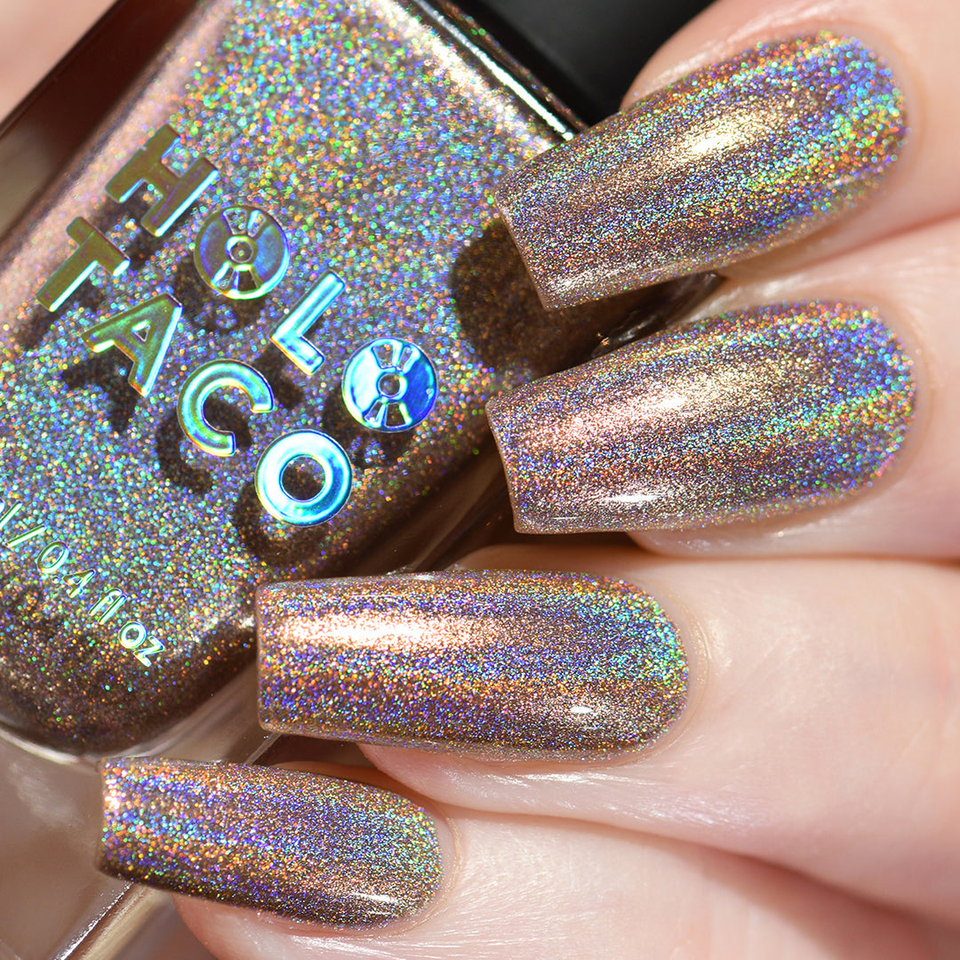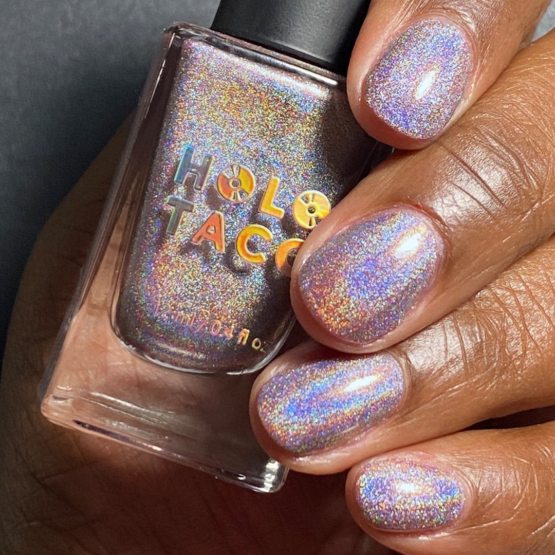 - Note: Holographic nail polish shows best under direct sunlight, halogen bulbs, or just your phone camera flash! Swatch photos as pictured have one coat of Glossy Taco for optimal smoothness and shine.