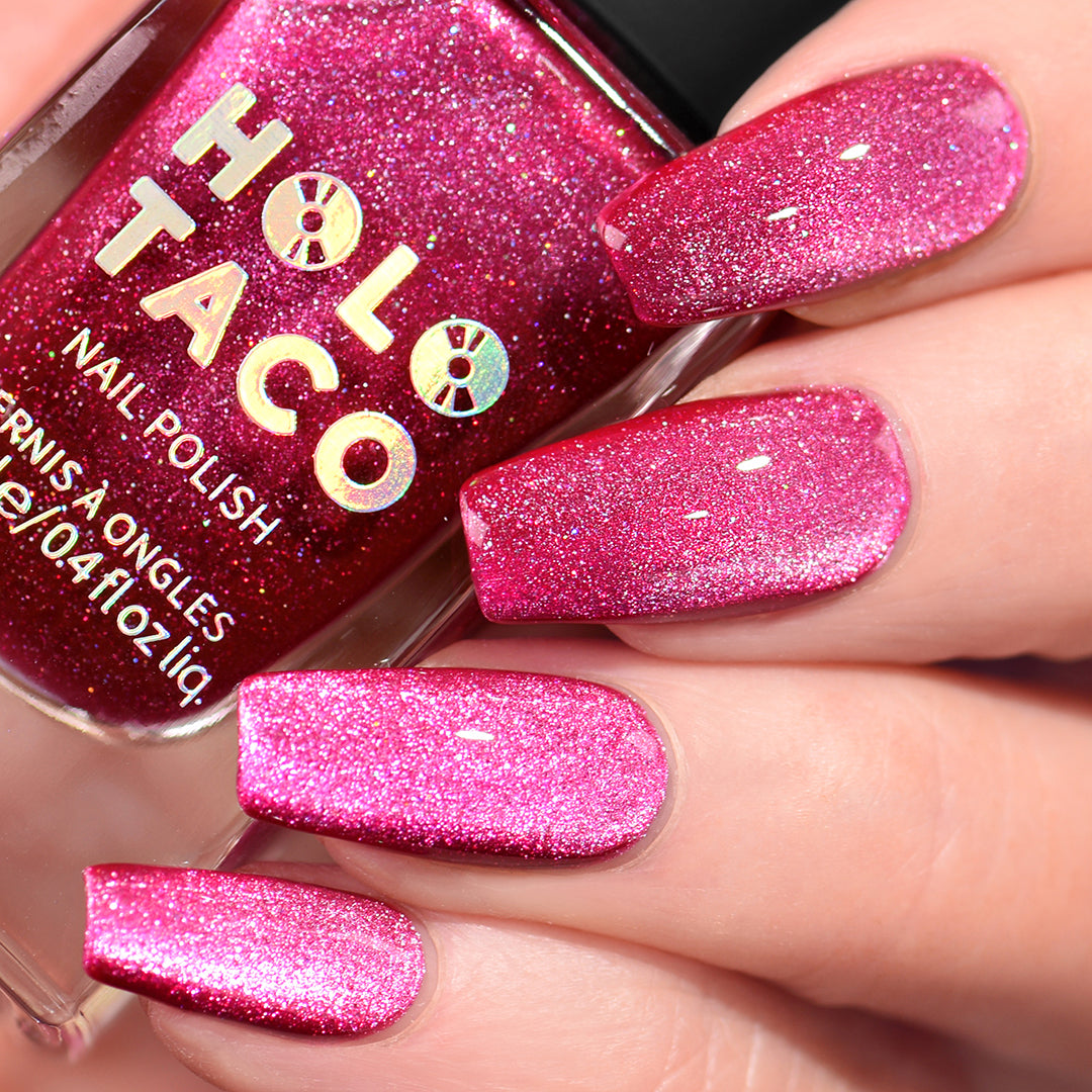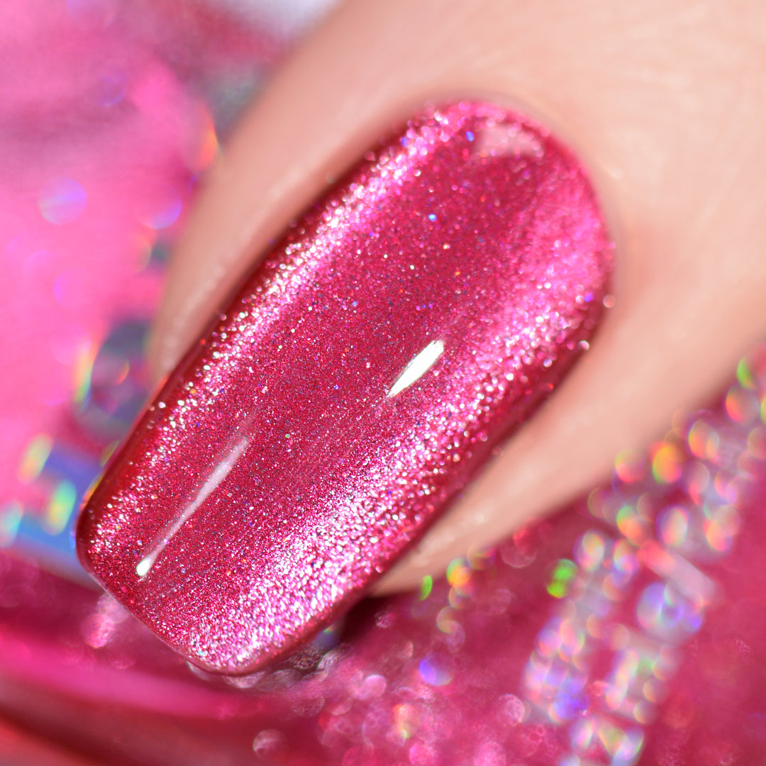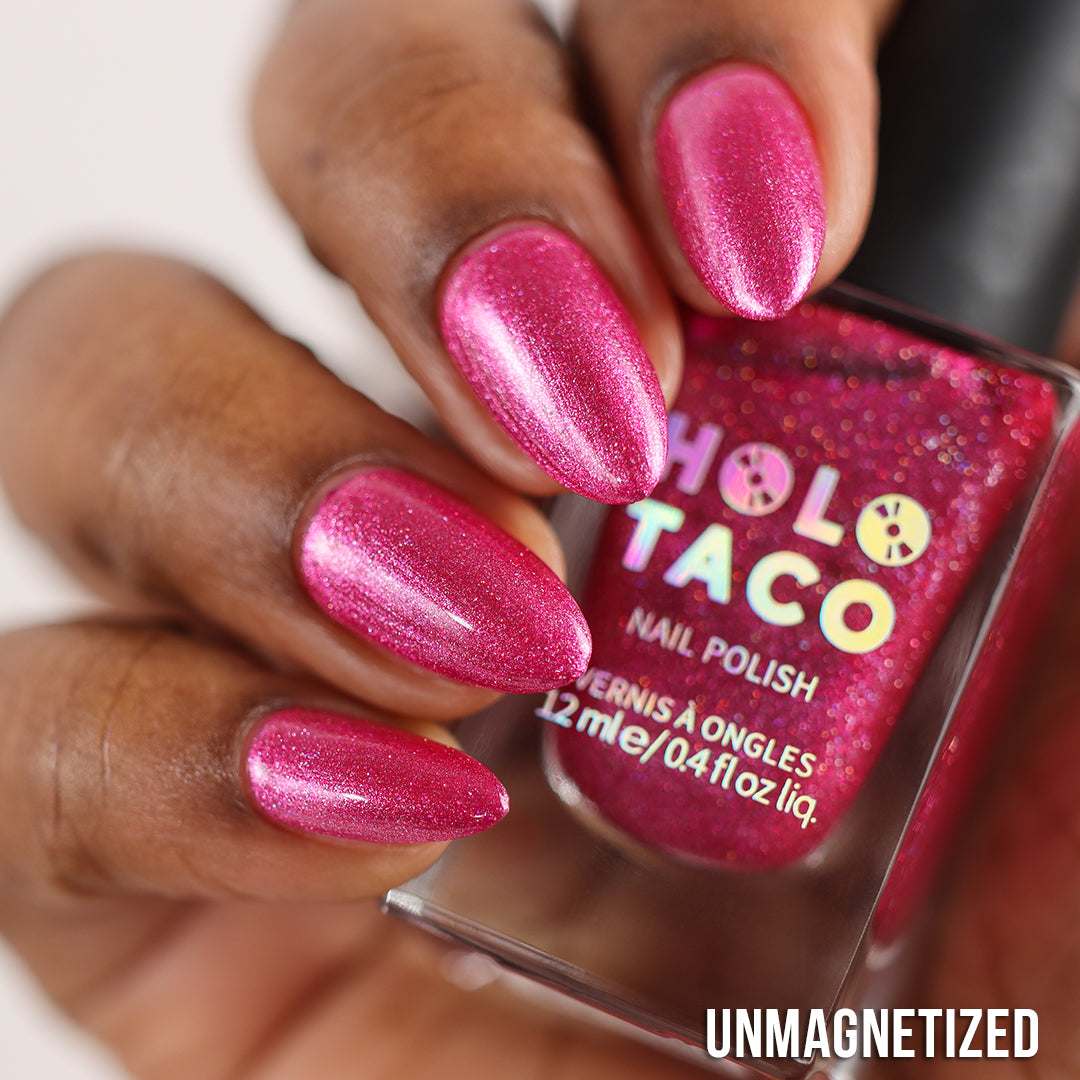Be honest, this hot pink had you at hello. A flirty raspberry-pink magnetic with a wink of scattered holo that’s anything but innocent.