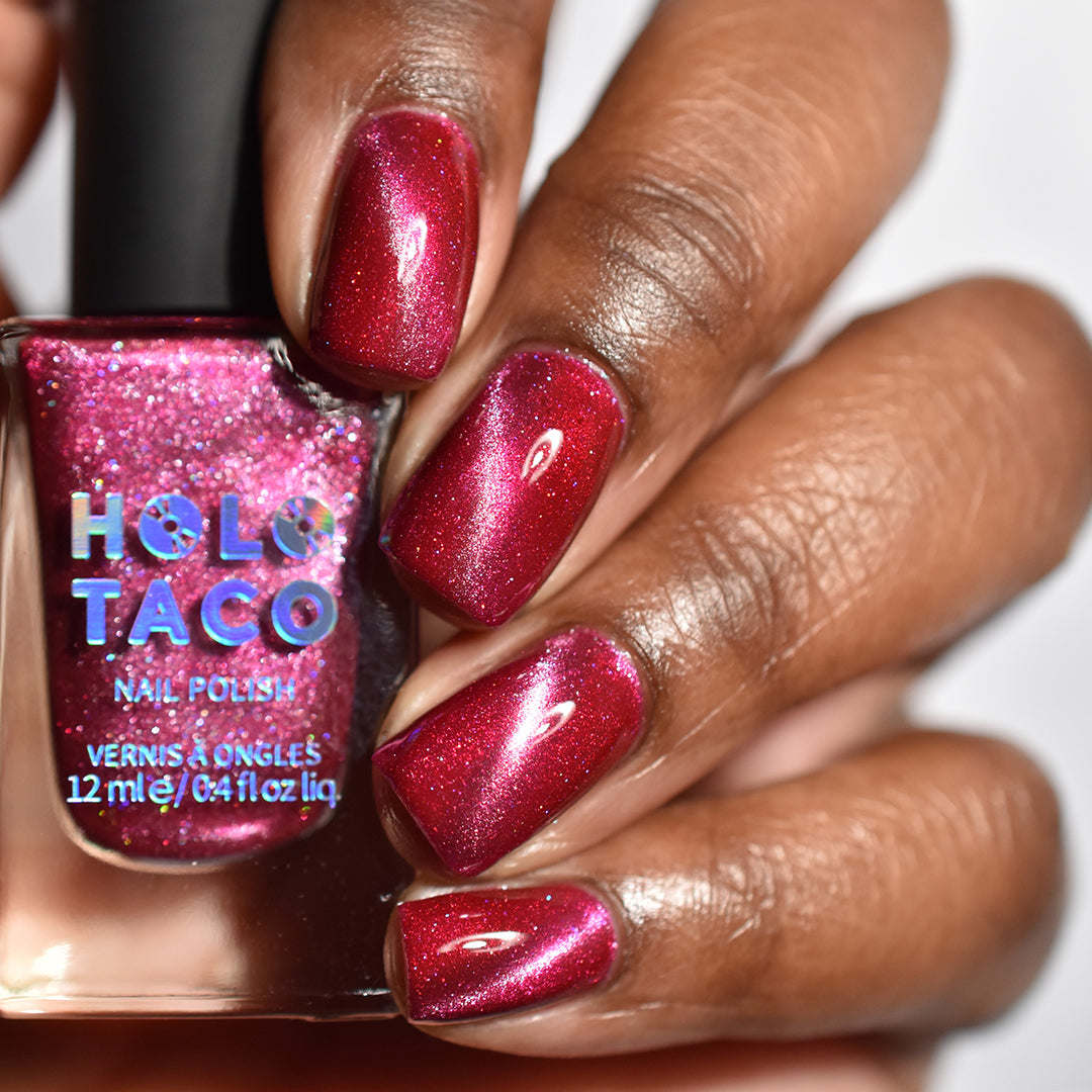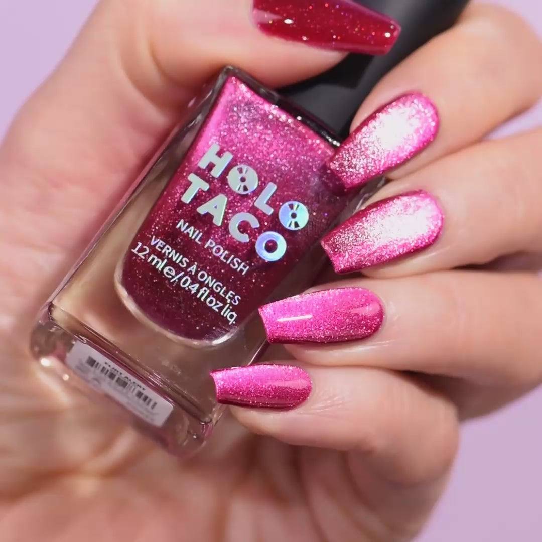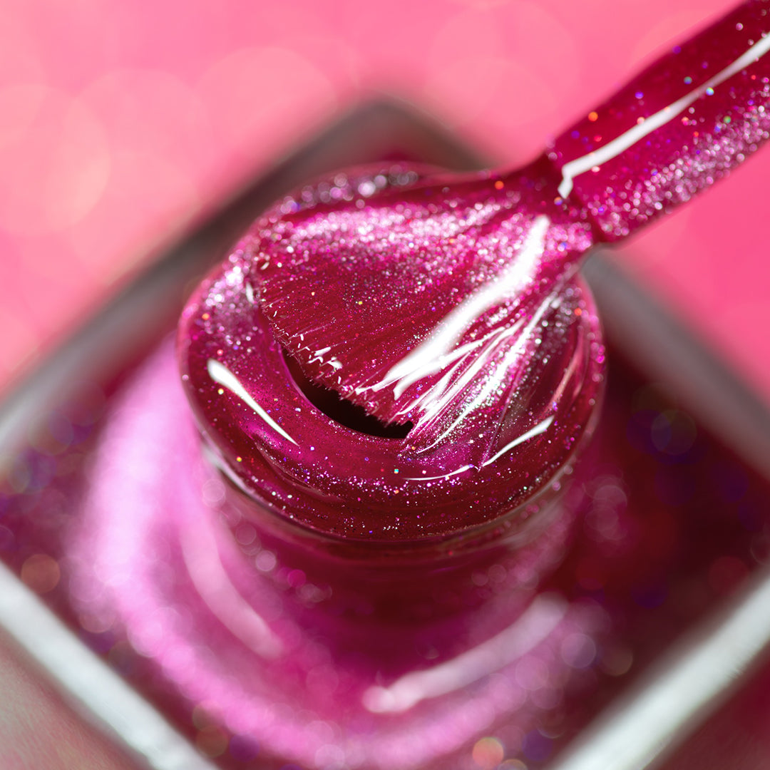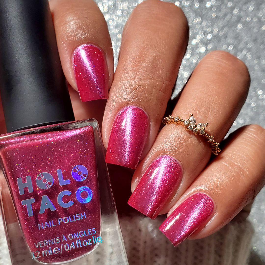 Be honest, this hot pink had you at hello. A flirty raspberry-pink magnetic with a wink of scattered holo that’s anything but innocent.
