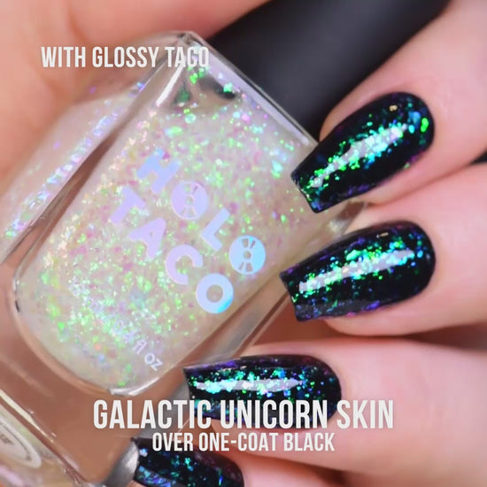 - Pro glossy tip: Finish off with a Glossy Taco to achieve that glossy finish and make your mani last longer without chipping. A top coat will help seal in the Unicorn Skin topper!