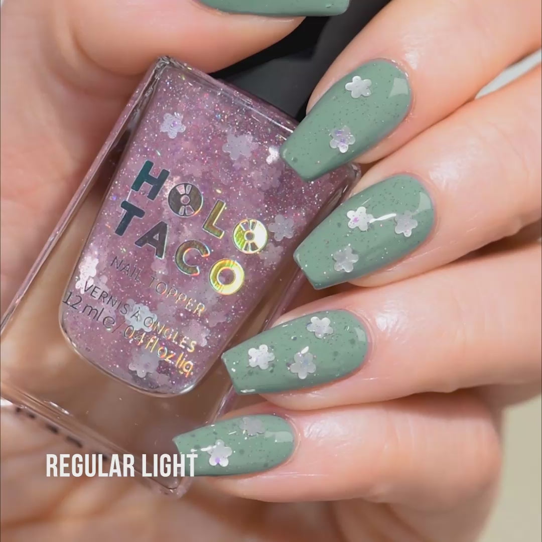 What’s a cozy escape without a little glitter? This scattered floral topper adds the perfect finishing touch to any base. It’s like having a mini garden on each nail (that’s in bloom all year round).
