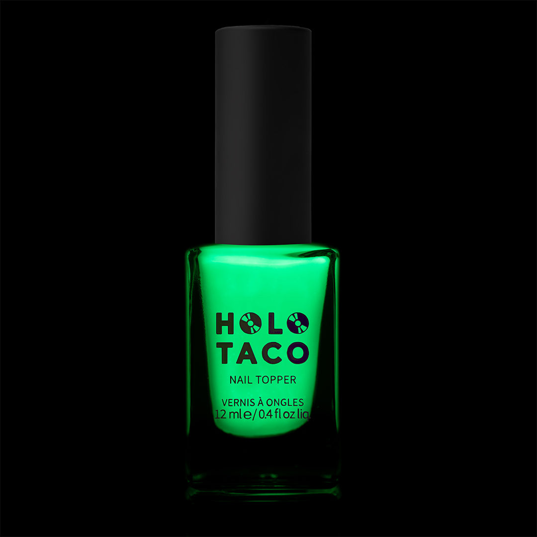 2. 2. Let Glow In The Dark Taco dry to the touch and follow with a Glossy Taco for quick-dry and long lasting wear results. The topcoat serves as a manicure sealant and will not hinder the glowing properties of Glow In The Dark Taco!