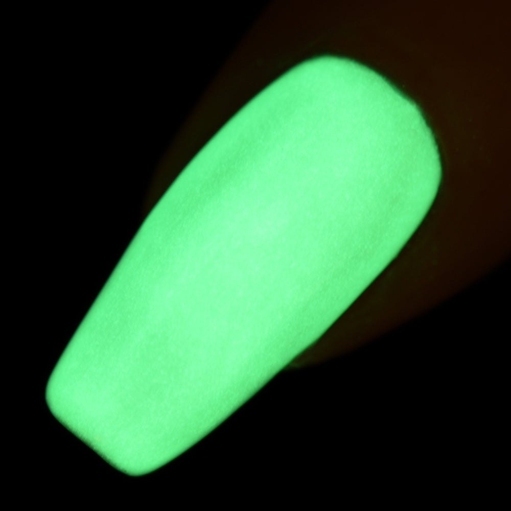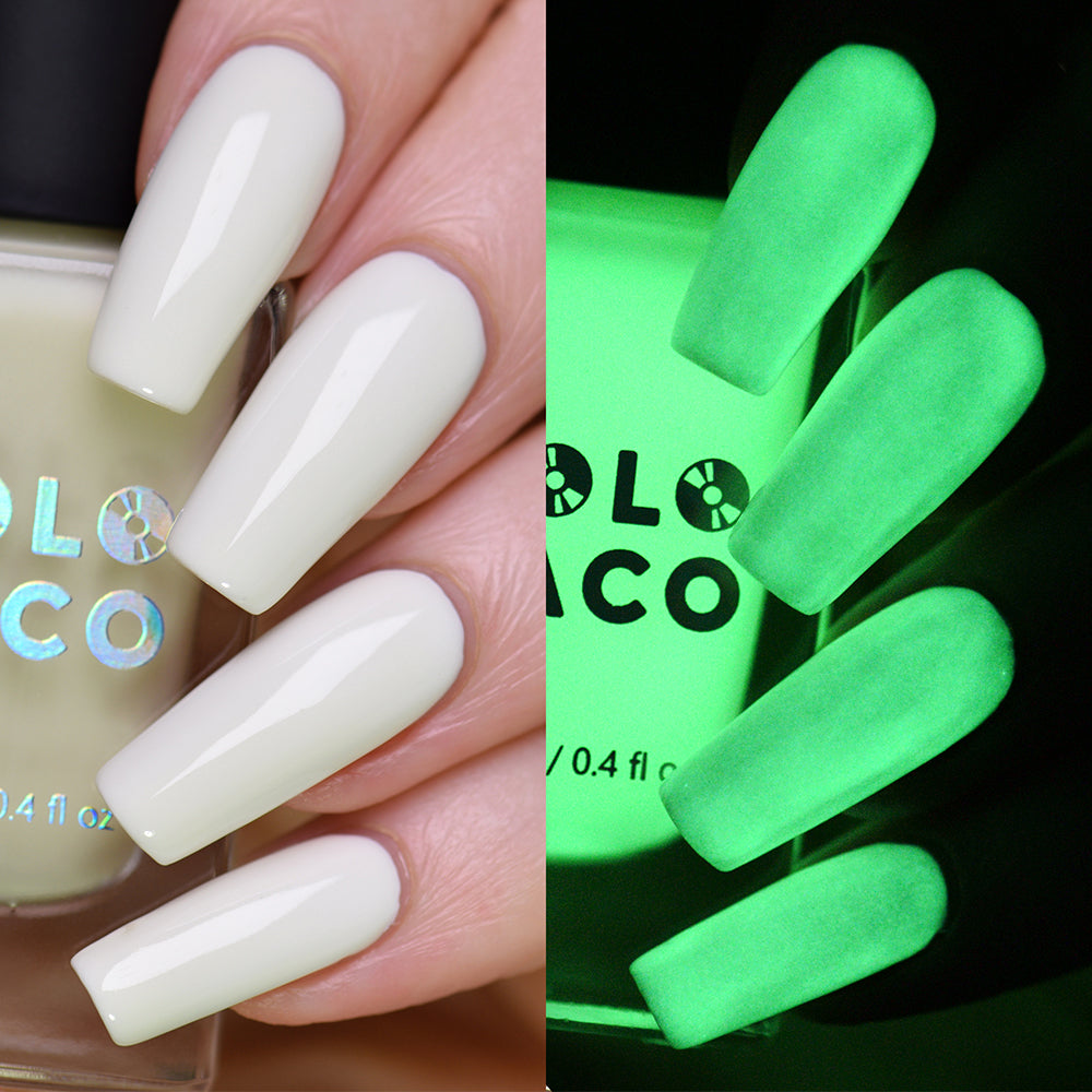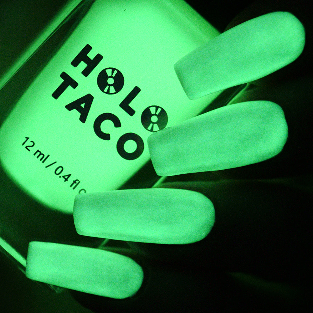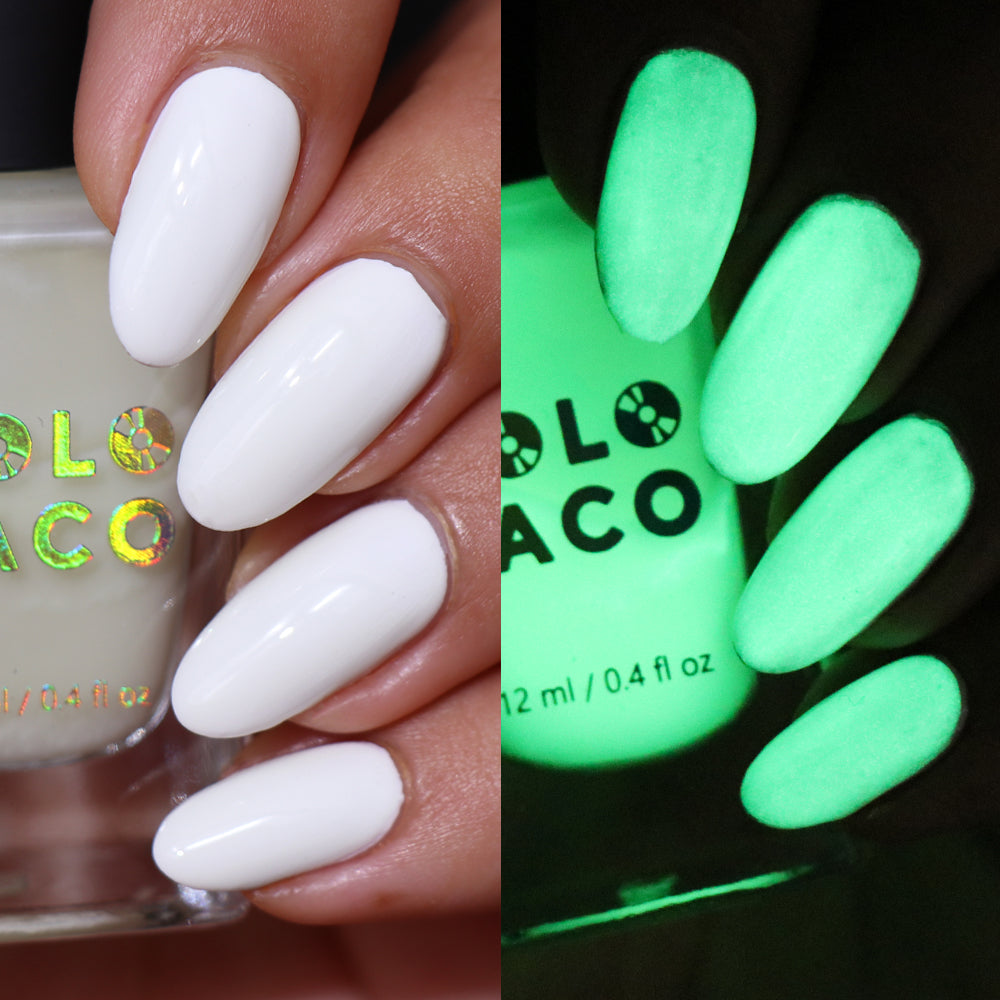 1. 1. For maximum glow effect, apply Glow In The Dark Taco over an opaque white nail polish base (we recommend Not Milky White). Note glow pigment dries down satin with a subtle light yellow-green cloudy tint.