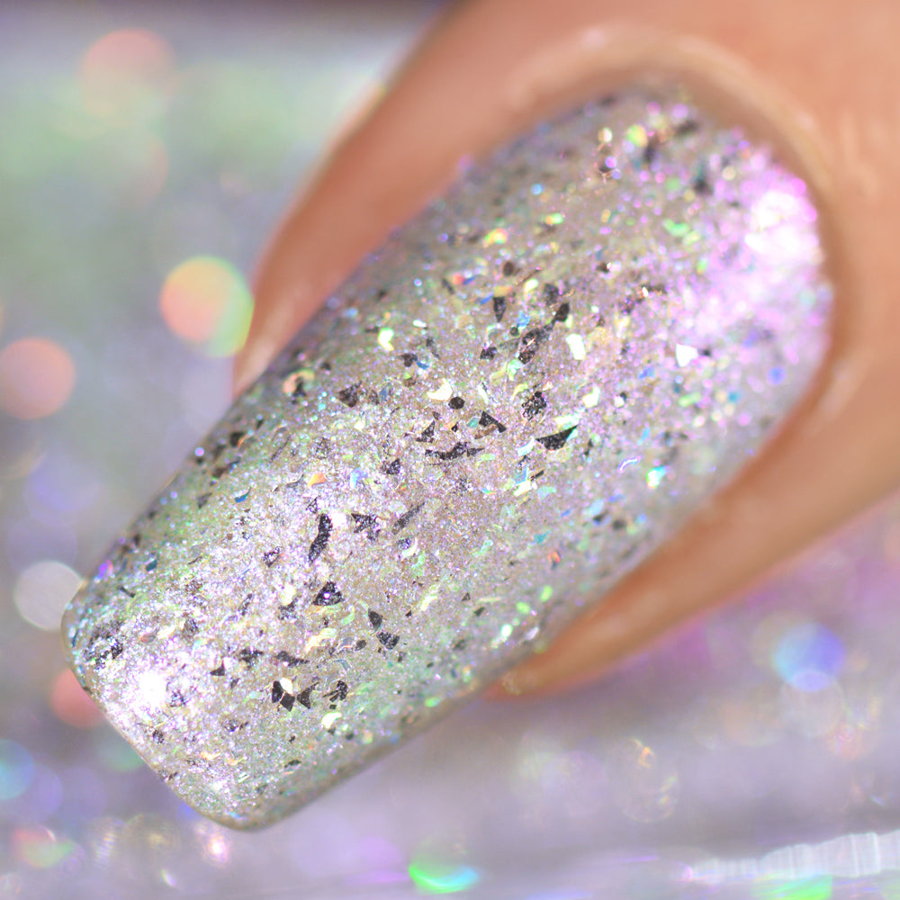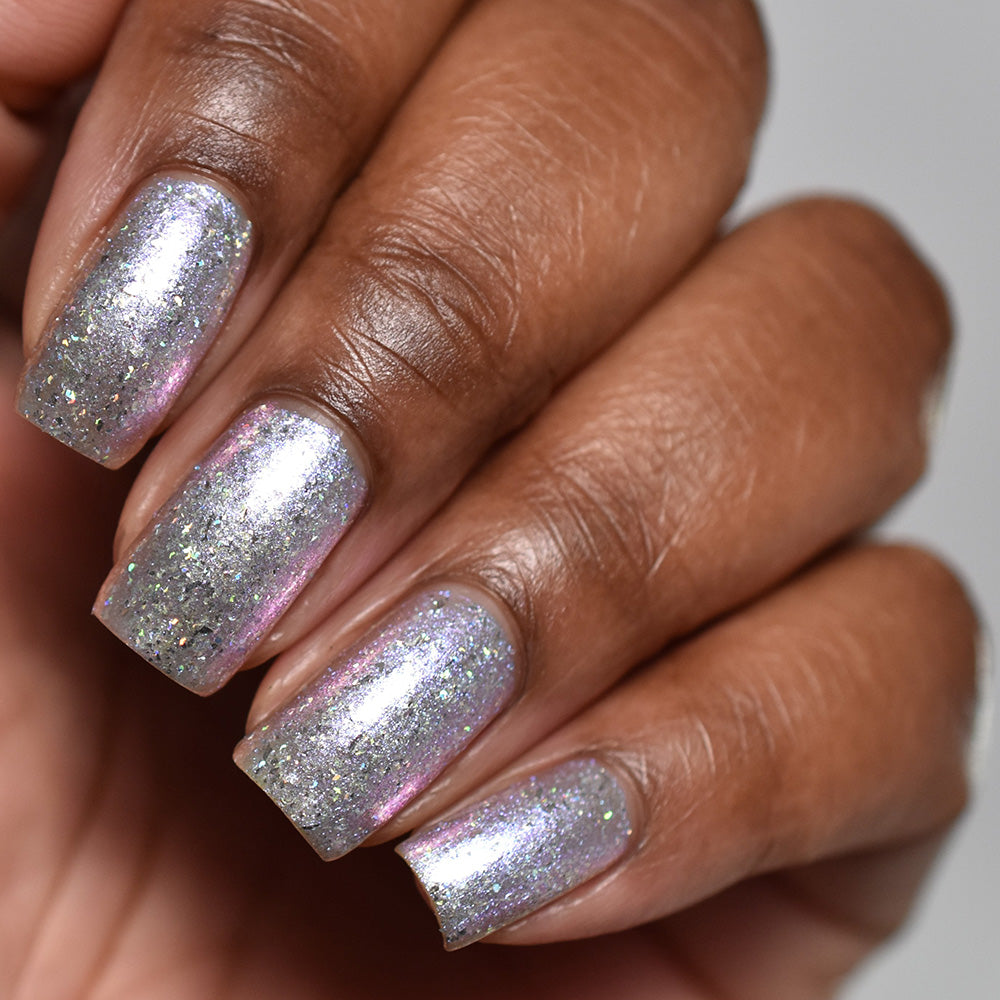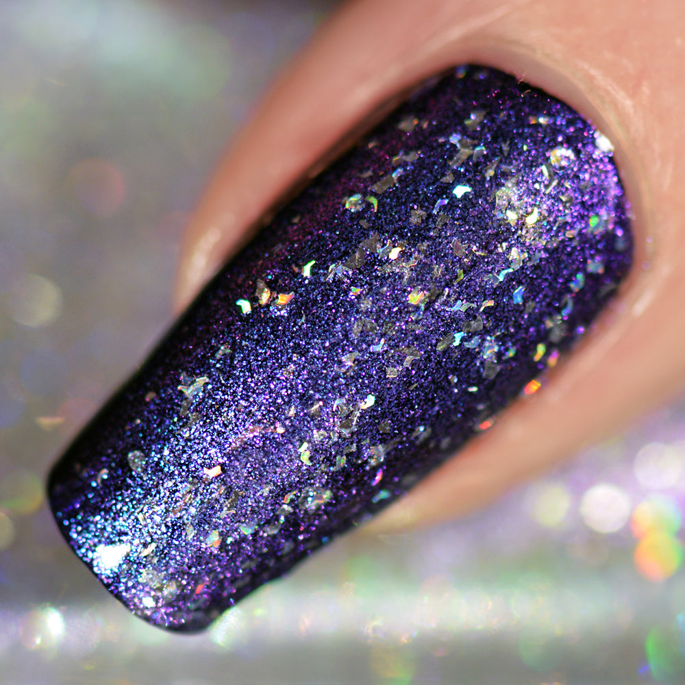 - Multi-dimensional formula packed with silver holographic flakes, silver foil flakes, and purple iridescent shimmer