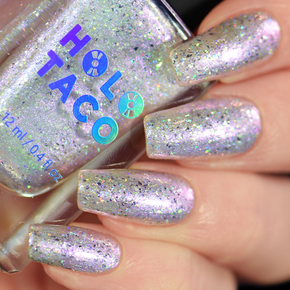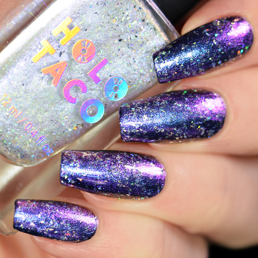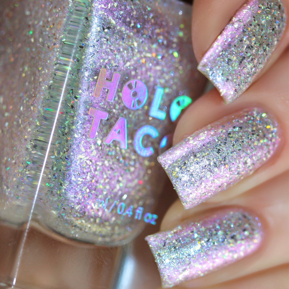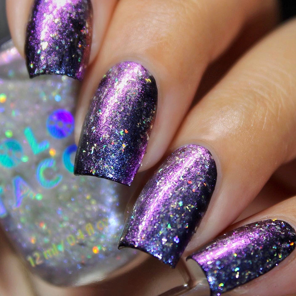 - Note: Holographic nail polish shows best under direct sunlight, halogen bulbs, or just your phone camera flash! Swatch photos as pictured have one coat of Glossy Taco for optimal smoothness and shine.